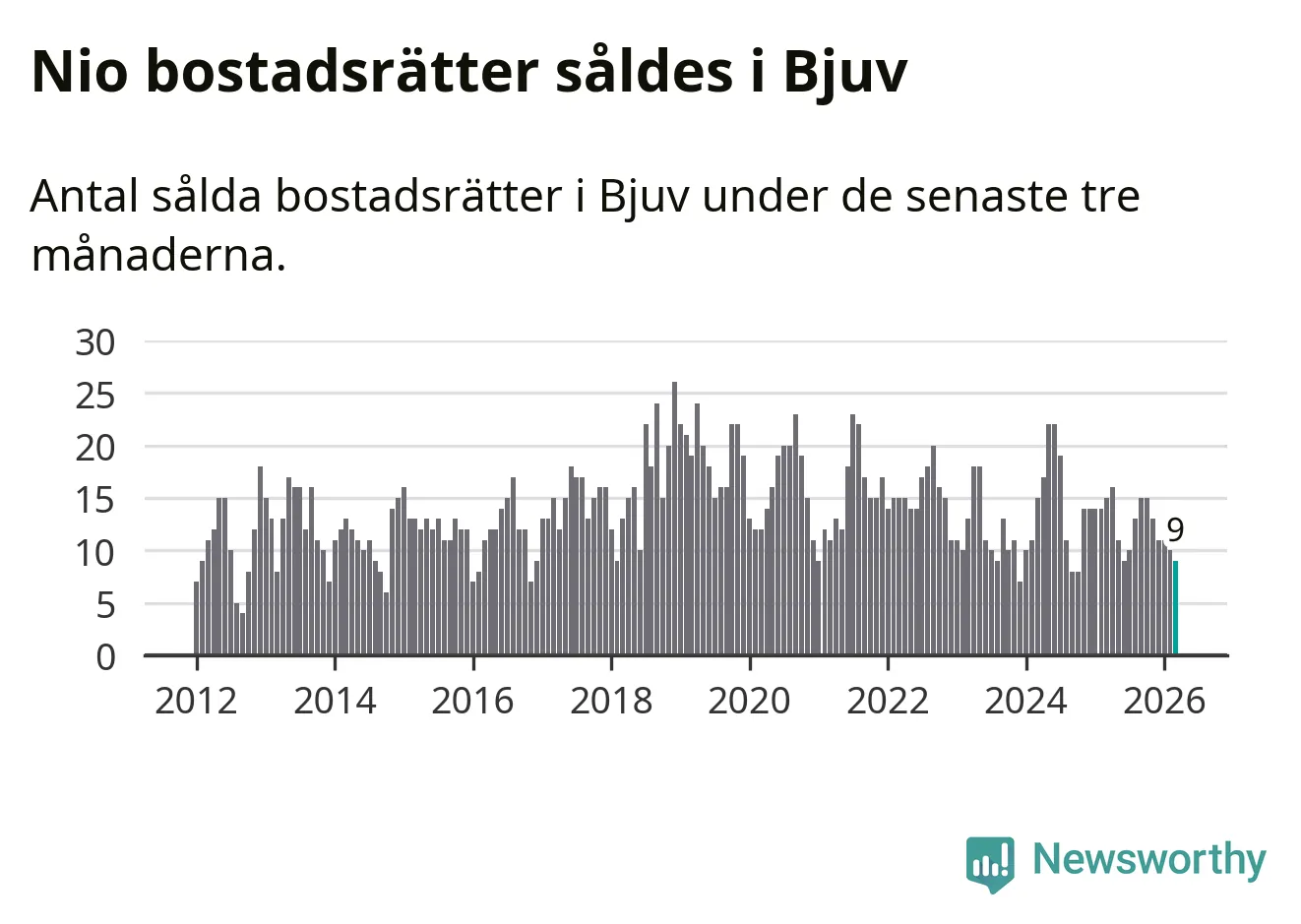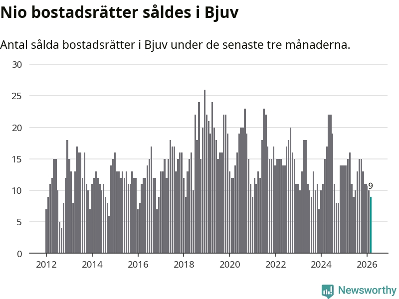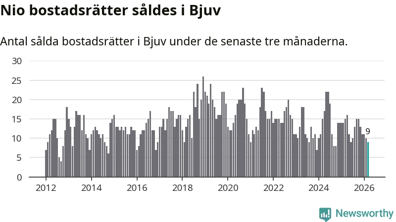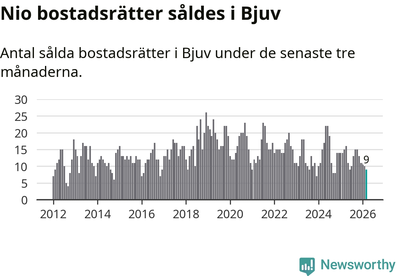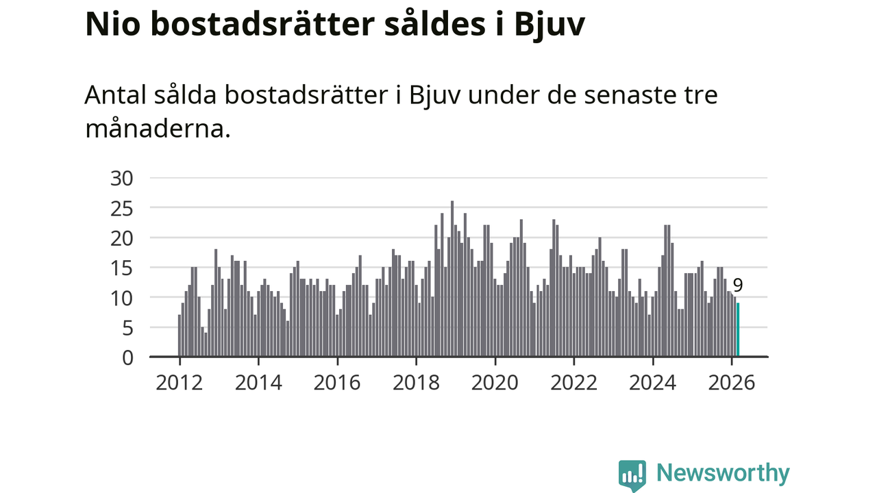 Mellan januari och mars gjordes sammanlagt nio affärer med bostadsrätter i Bjuvs kommun. Det kan jämföras med 15 vid motsvarande tid i fjol.