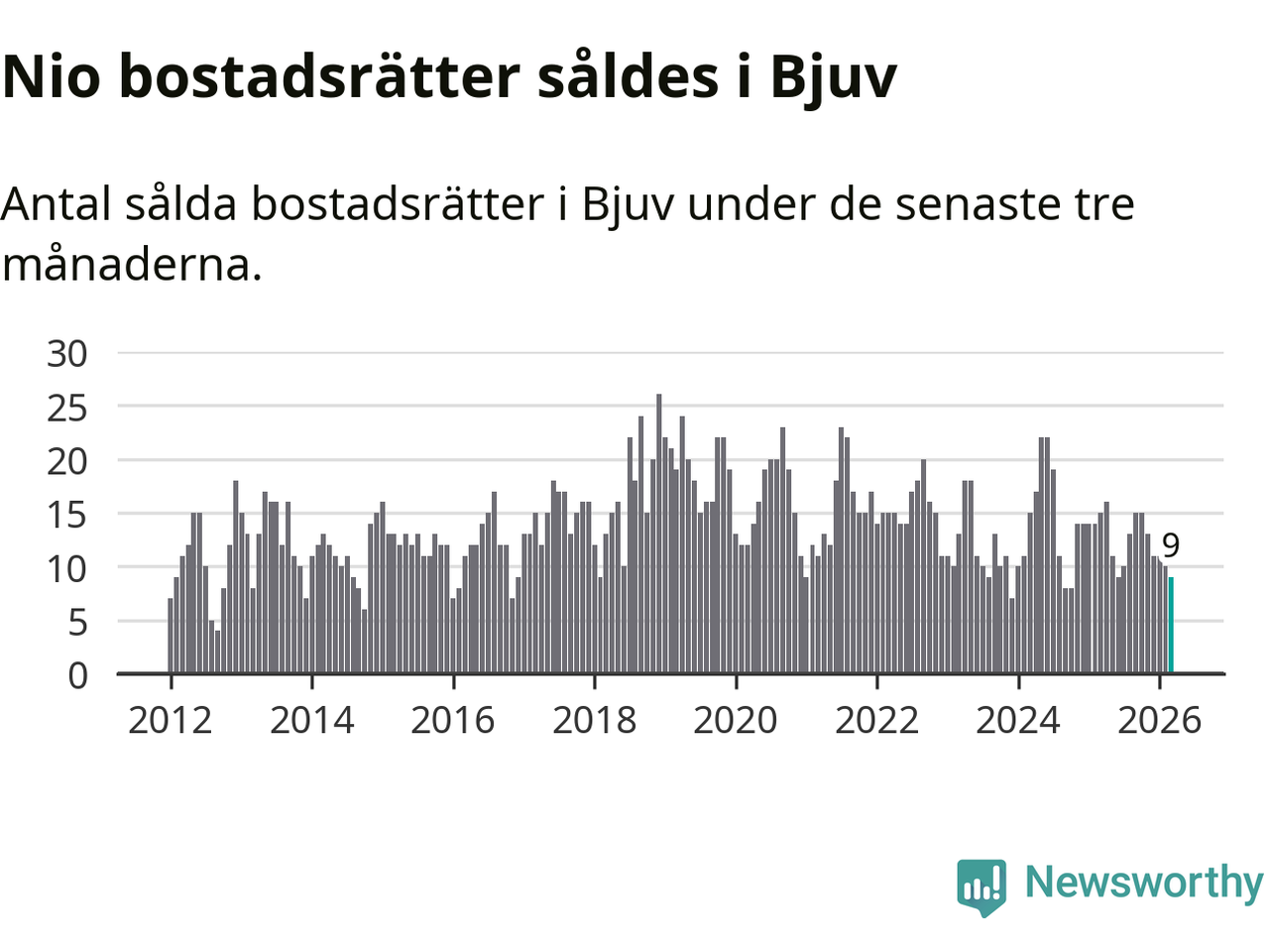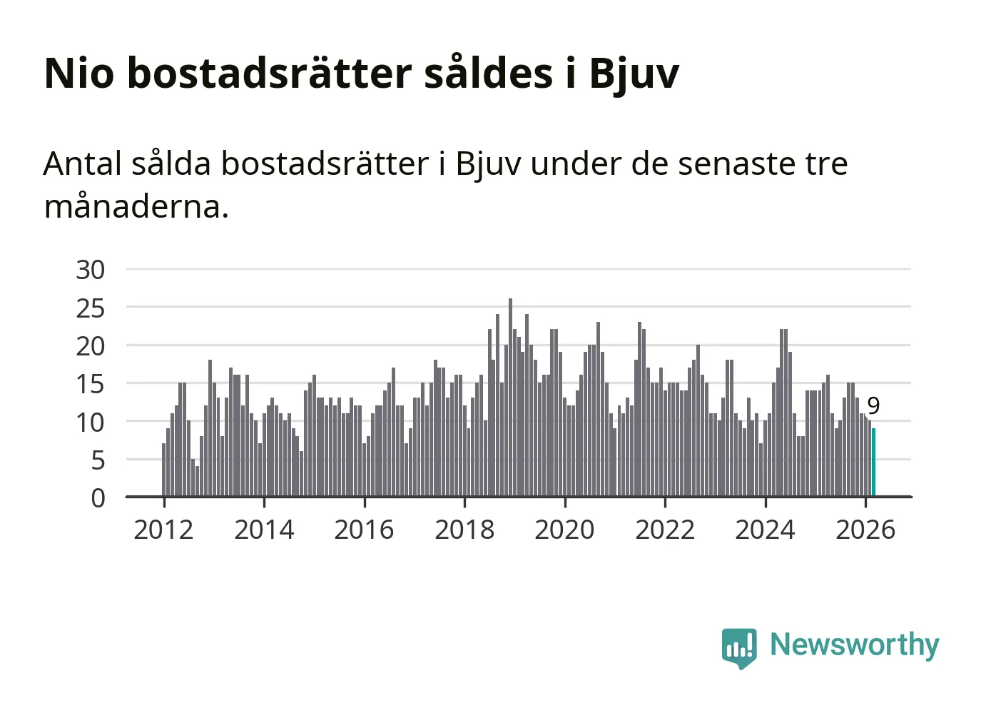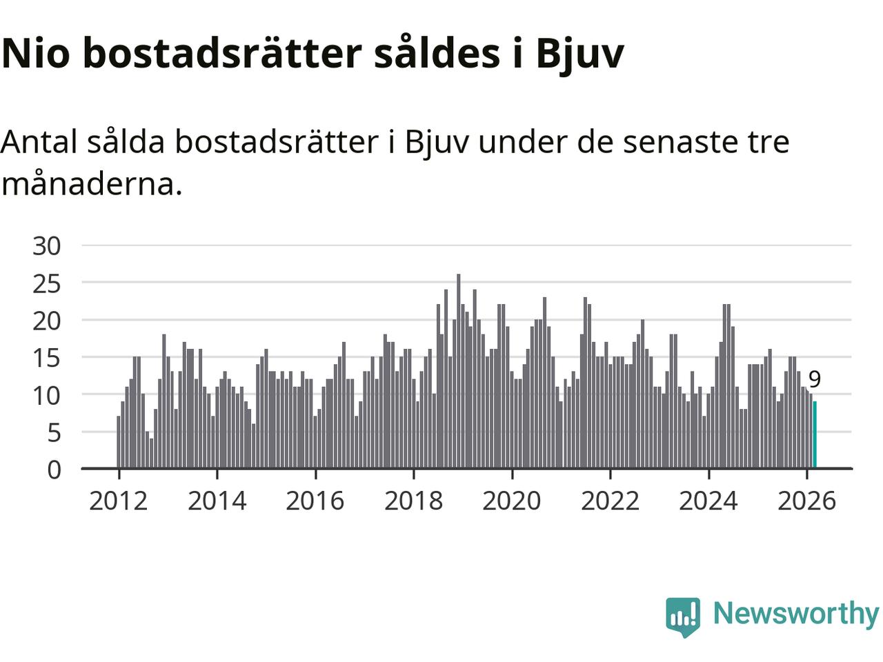 Mellan januari och mars gjordes sammanlagt nio affärer med bostadsrätter i Bjuvs kommun. Det kan jämföras med 15 vid motsvarande tid i fjol.