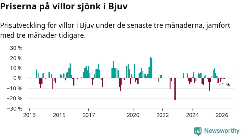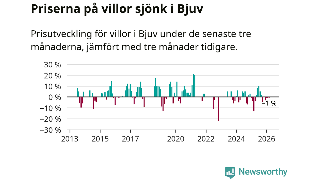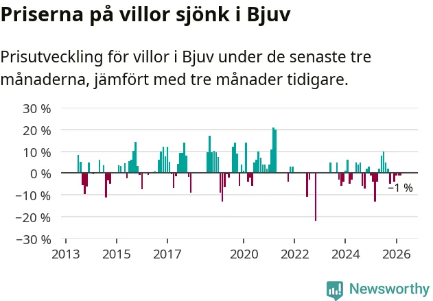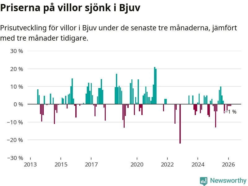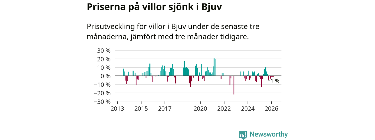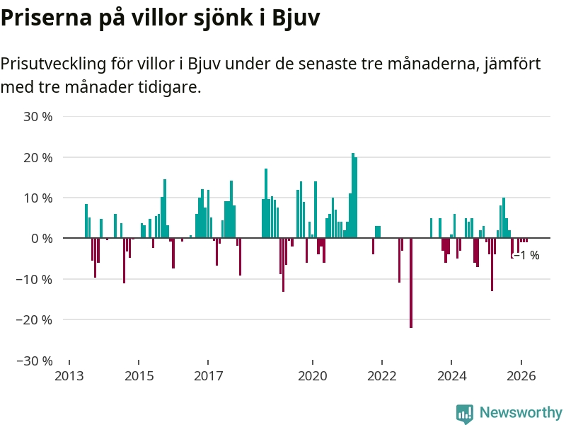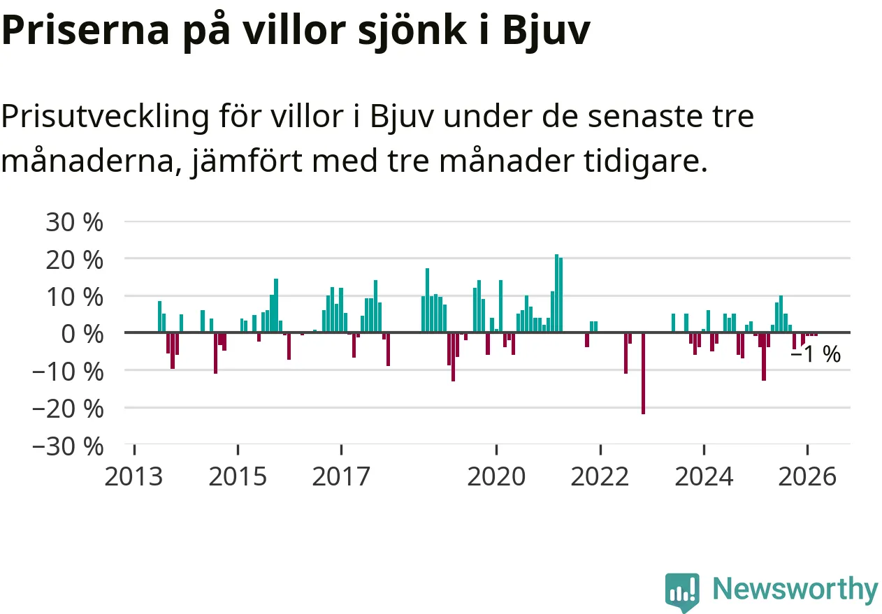 Villapriserna har gått ner i Bjuvs kommun. Medelpriset på försäljningarna under de senaste tre månaderna visar på en nedgång med 1 procent.