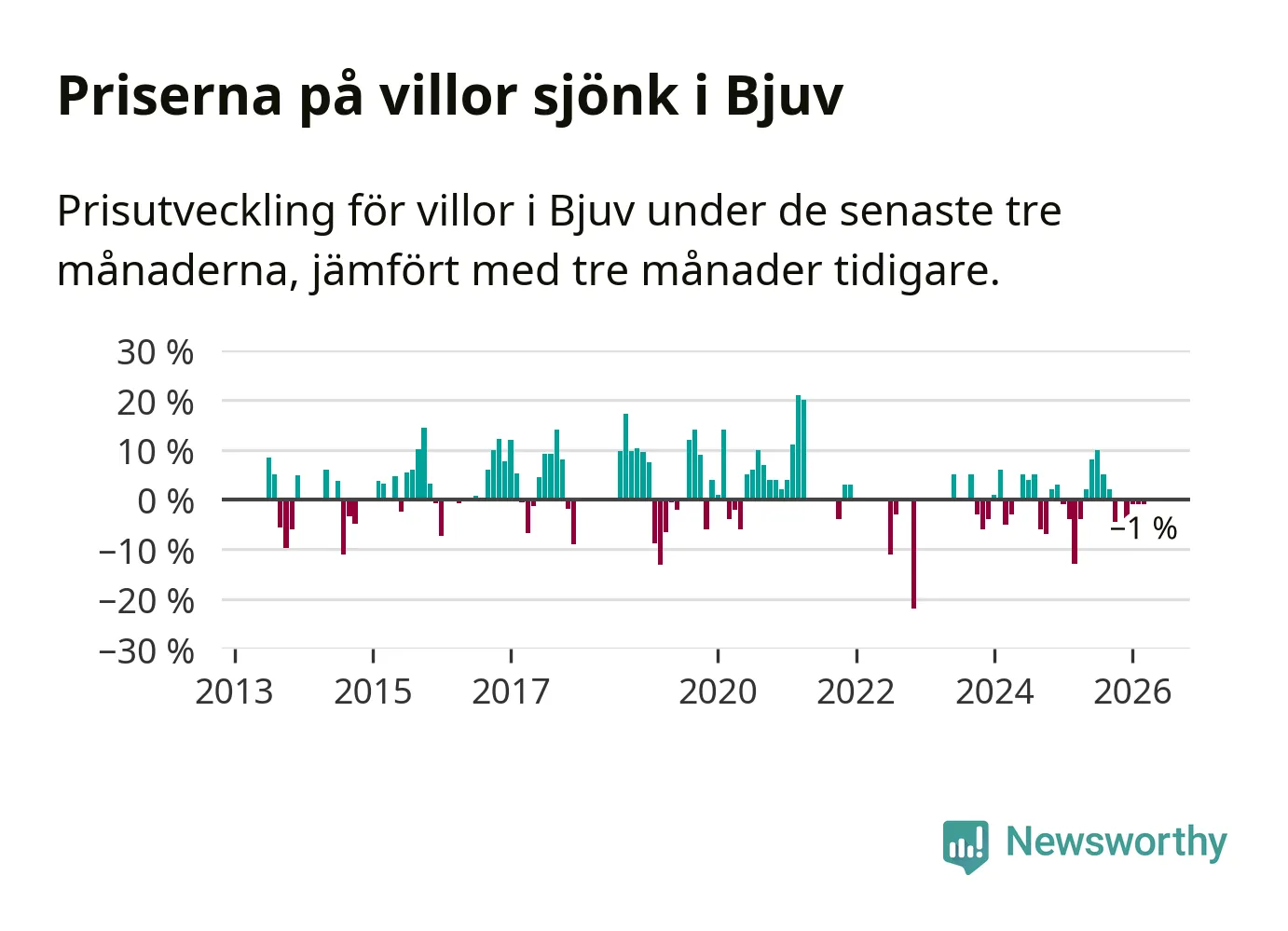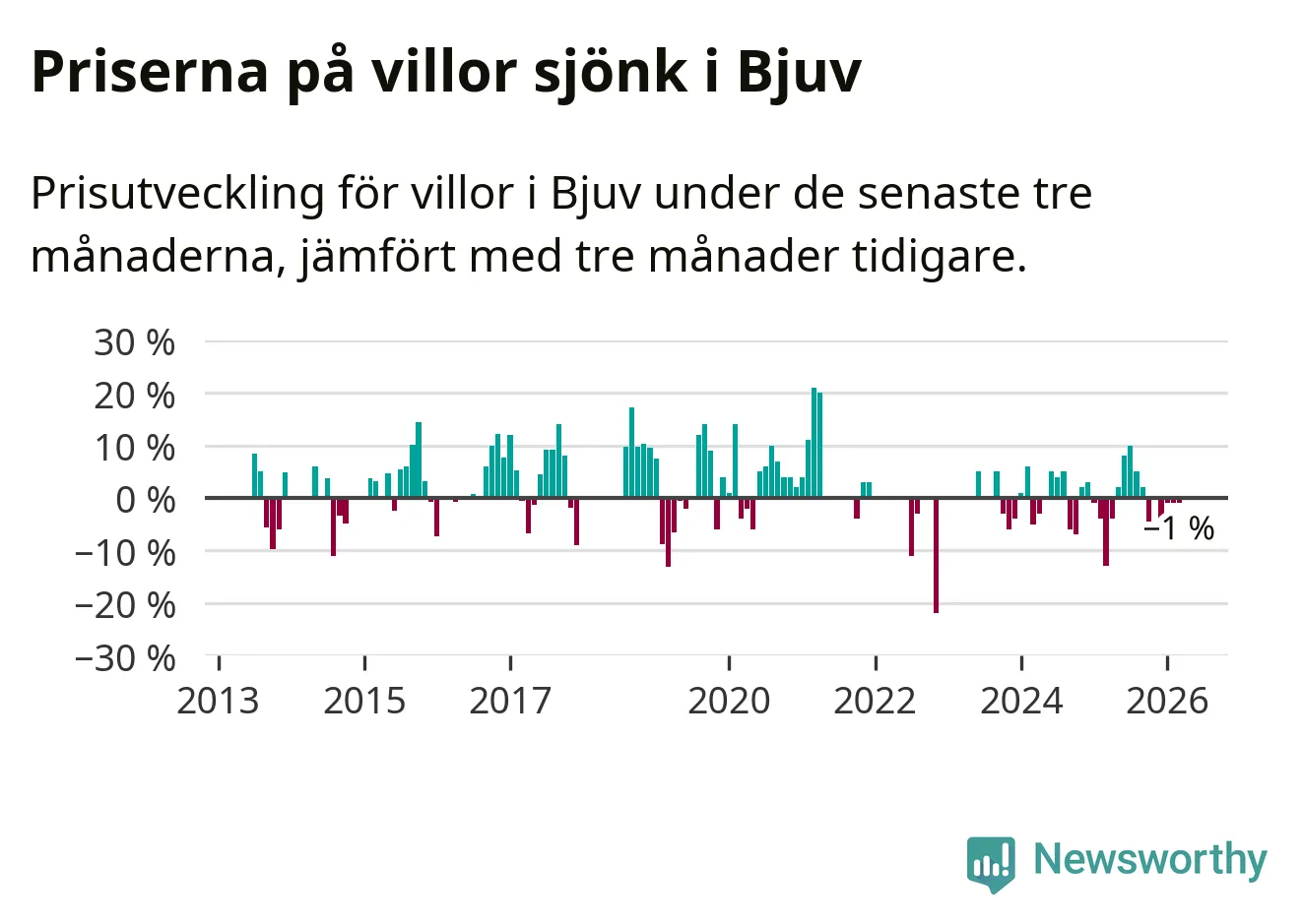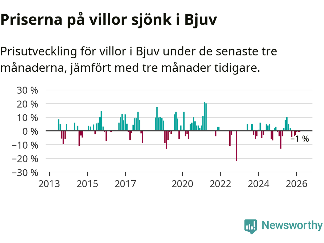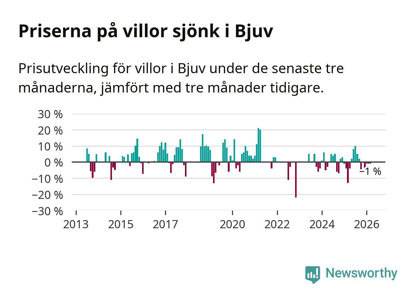 Villapriserna har gått ner i Bjuvs kommun. Medelpriset på försäljningarna under de senaste tre månaderna visar på en nedgång med 1 procent.