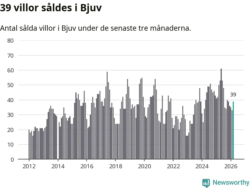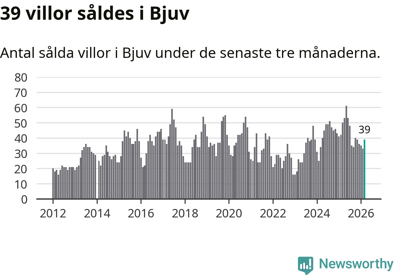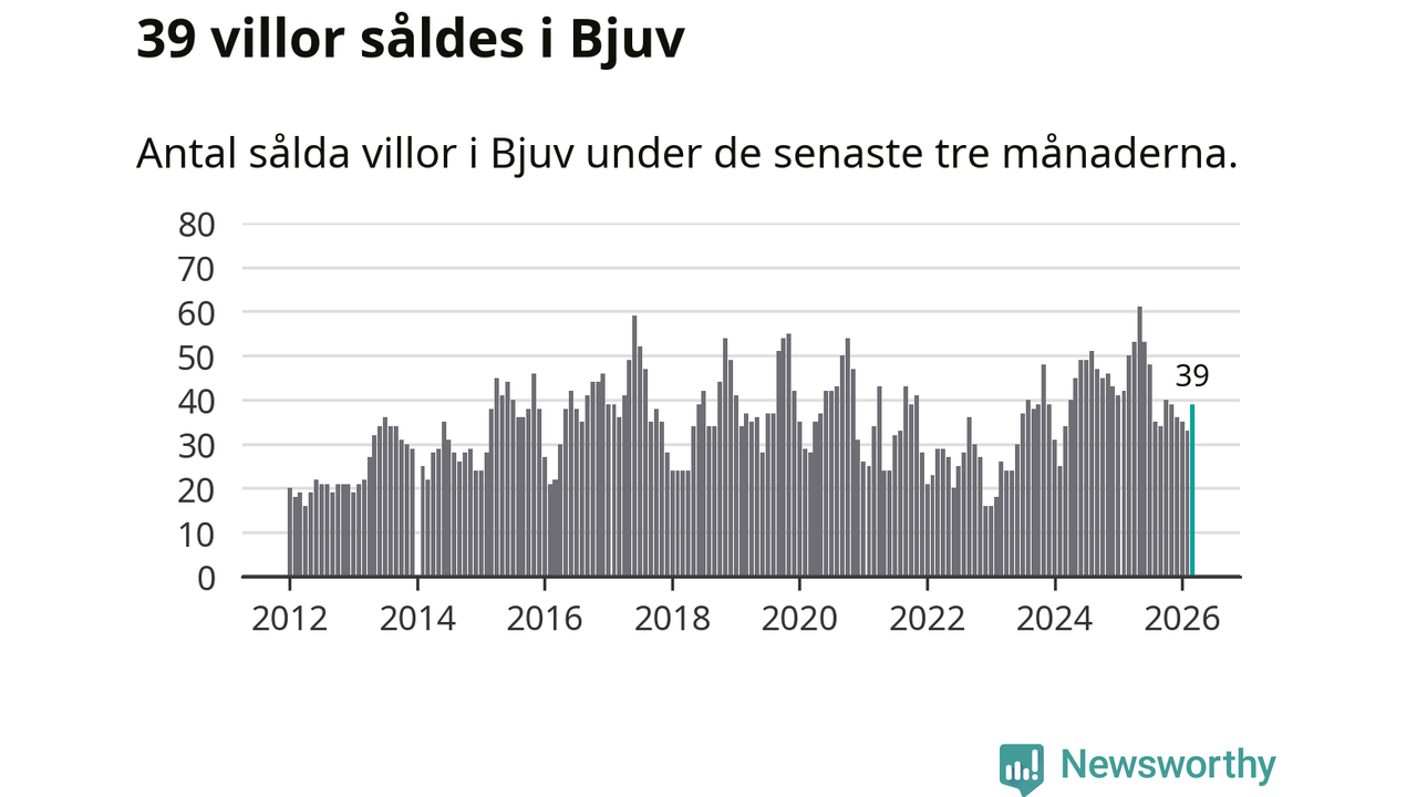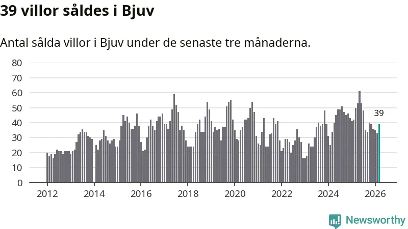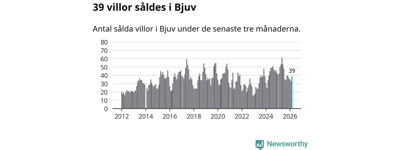 Sammanlagt såldes 39 villor i Bjuvs kommun mellan januari och mars till ett genomsnittligt pris på 2,0 miljoner kronor. I fjol gjordes 50 affärer vid den här tiden på året.