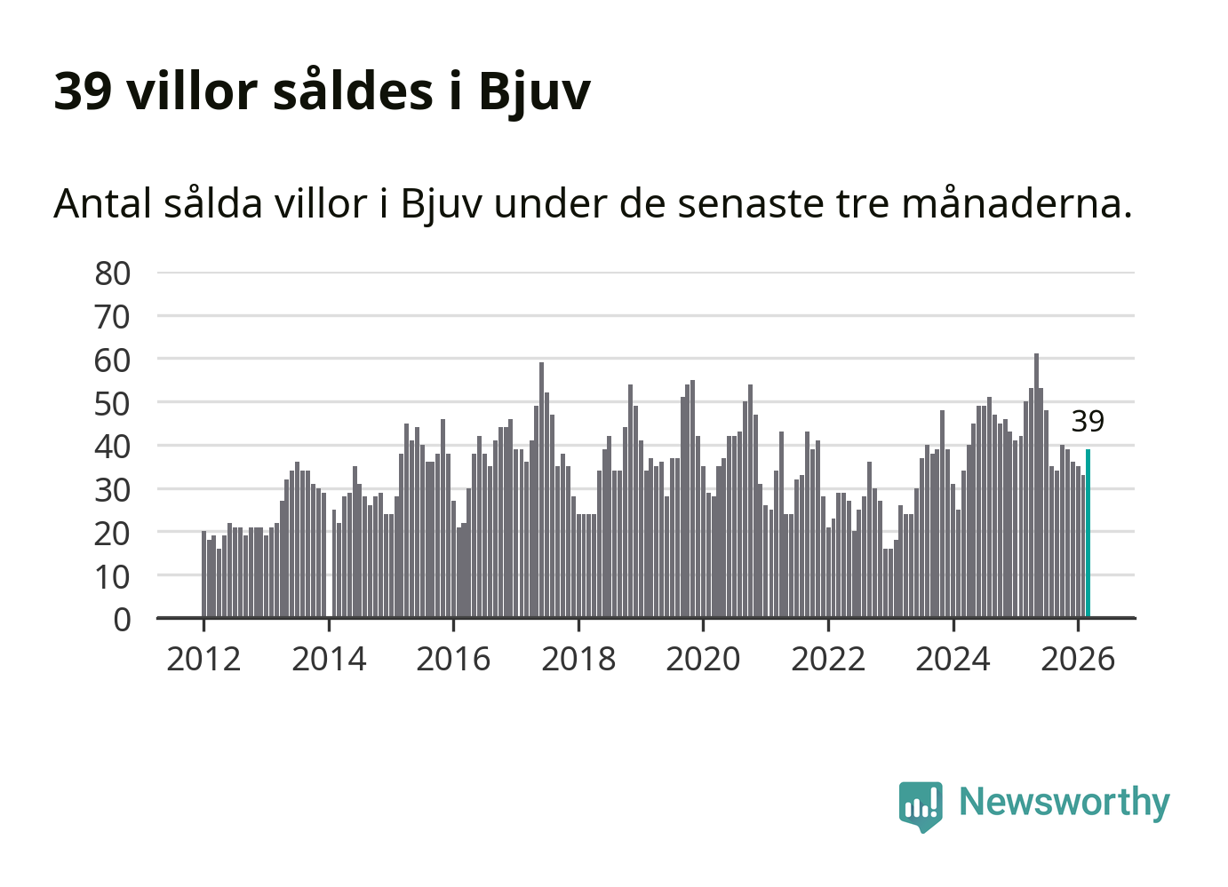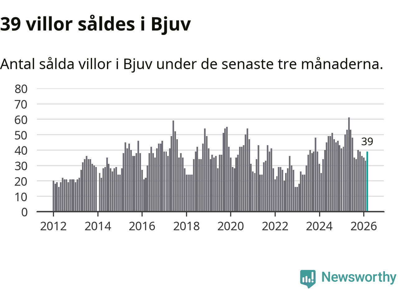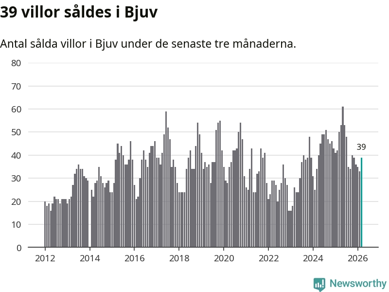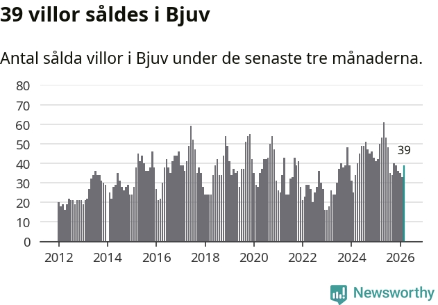 Sammanlagt såldes 39 villor i Bjuvs kommun mellan januari och mars till ett genomsnittligt pris på 2,0 miljoner kronor. I fjol gjordes 50 affärer vid den här tiden på året.