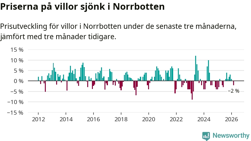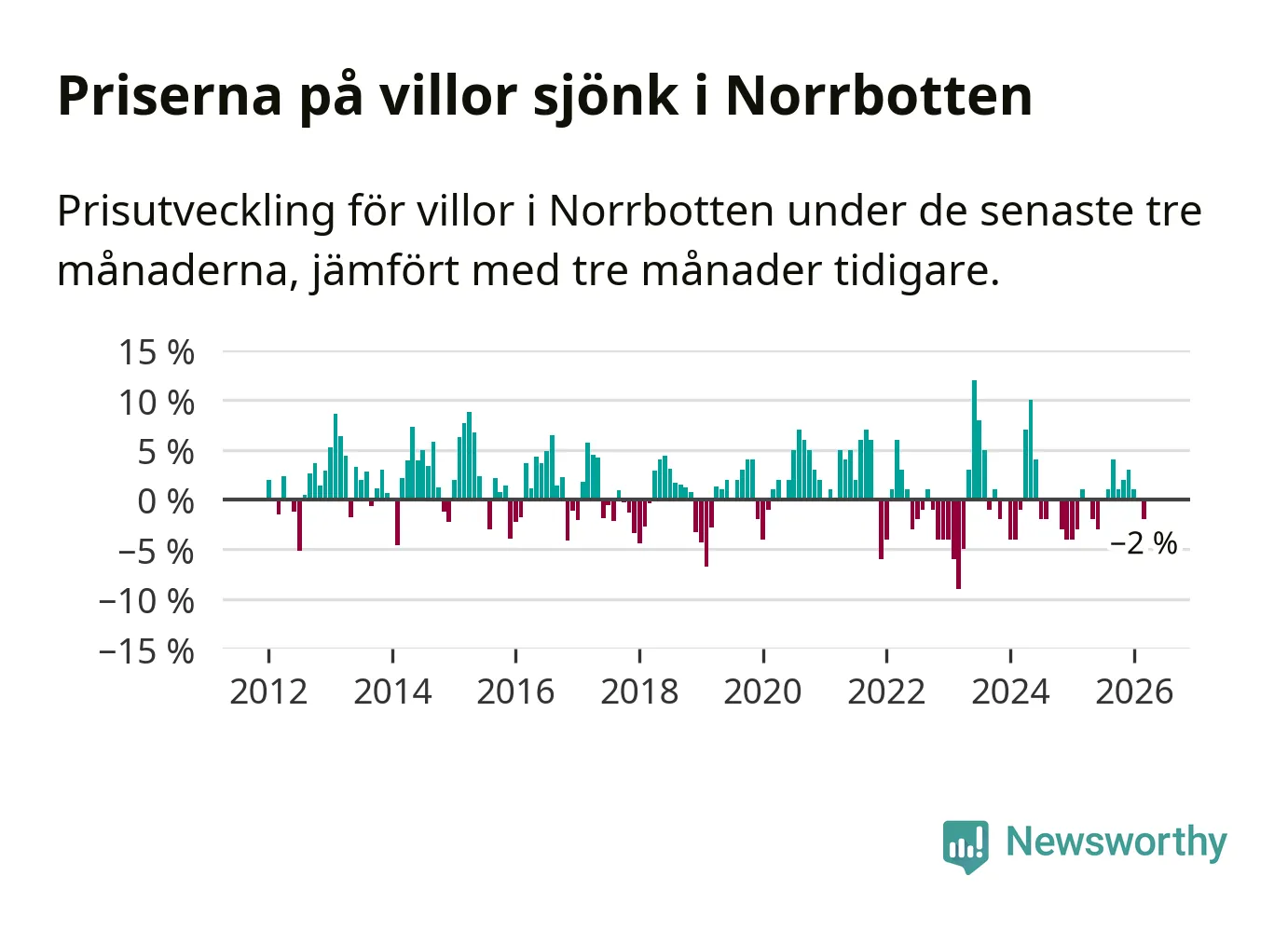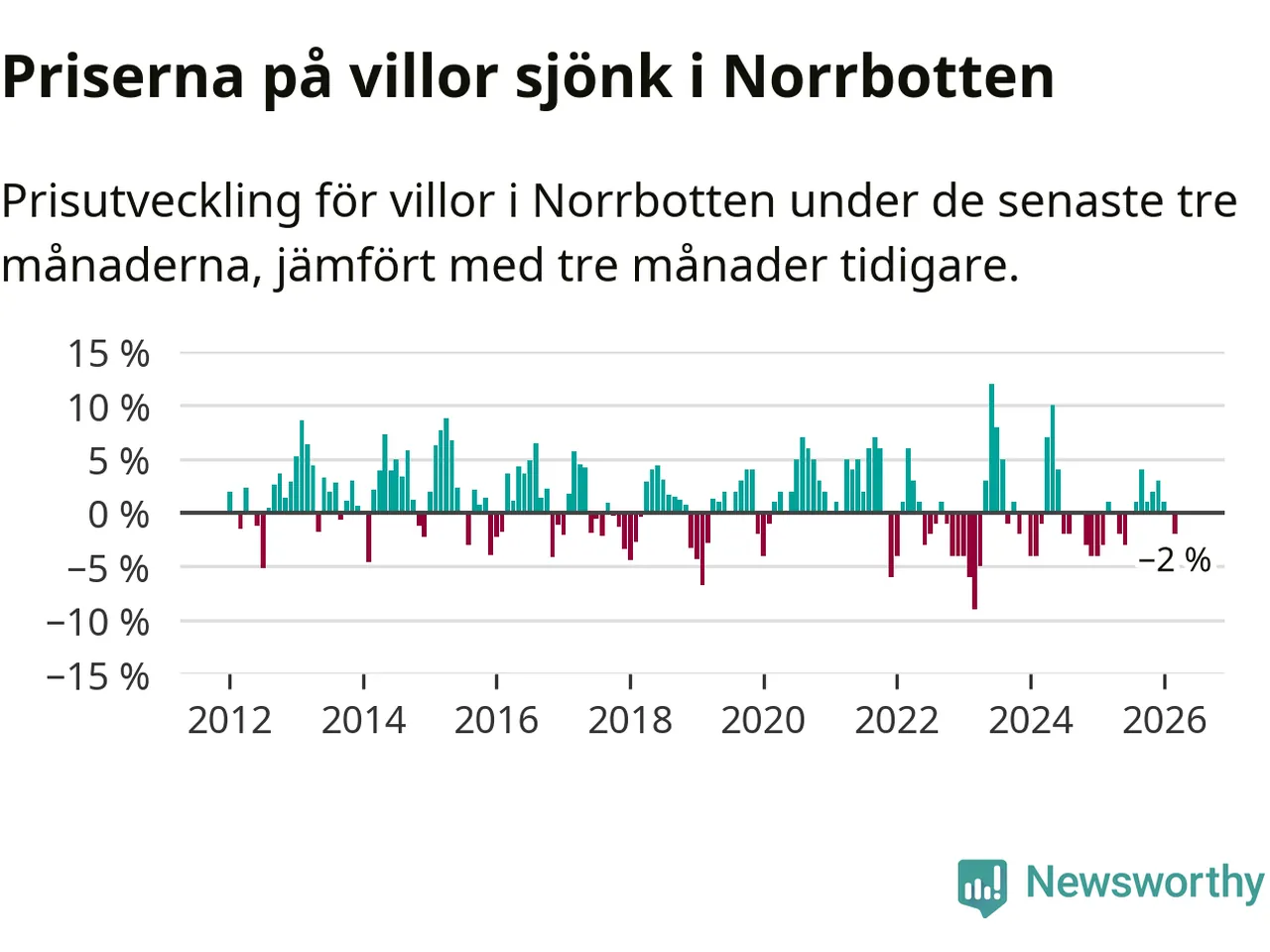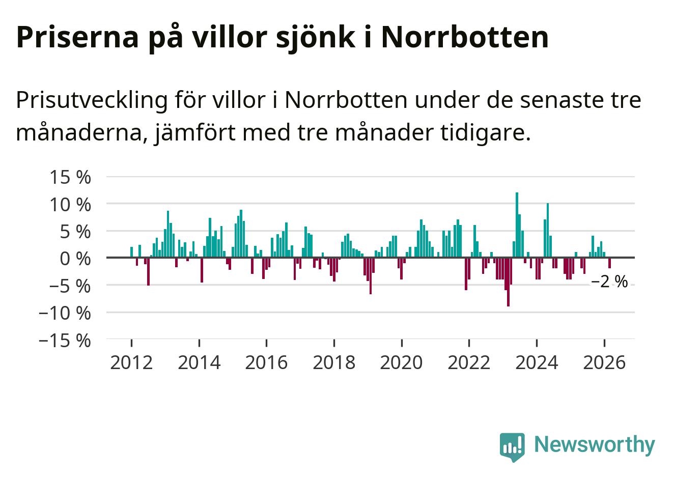 Villapriserna har gått ner i Norrbottens län. Medelpriset på försäljningarna under de senaste tre månaderna visar på en nedgång med 2 procent.