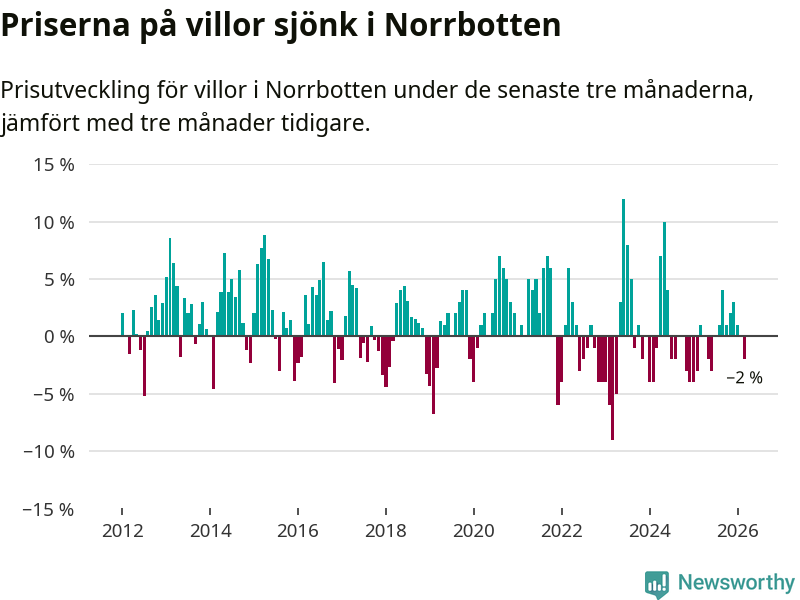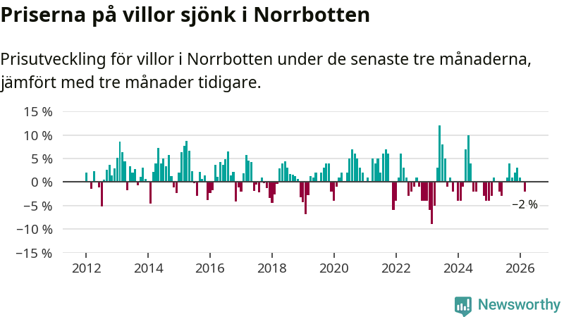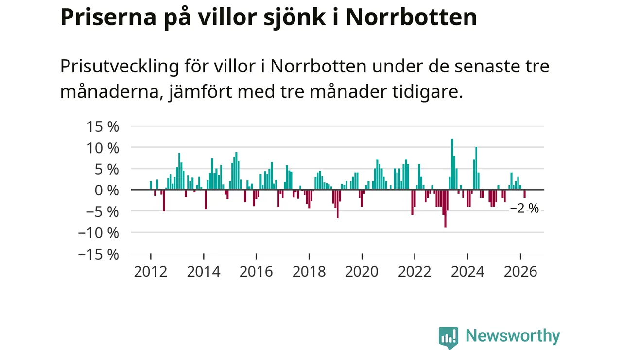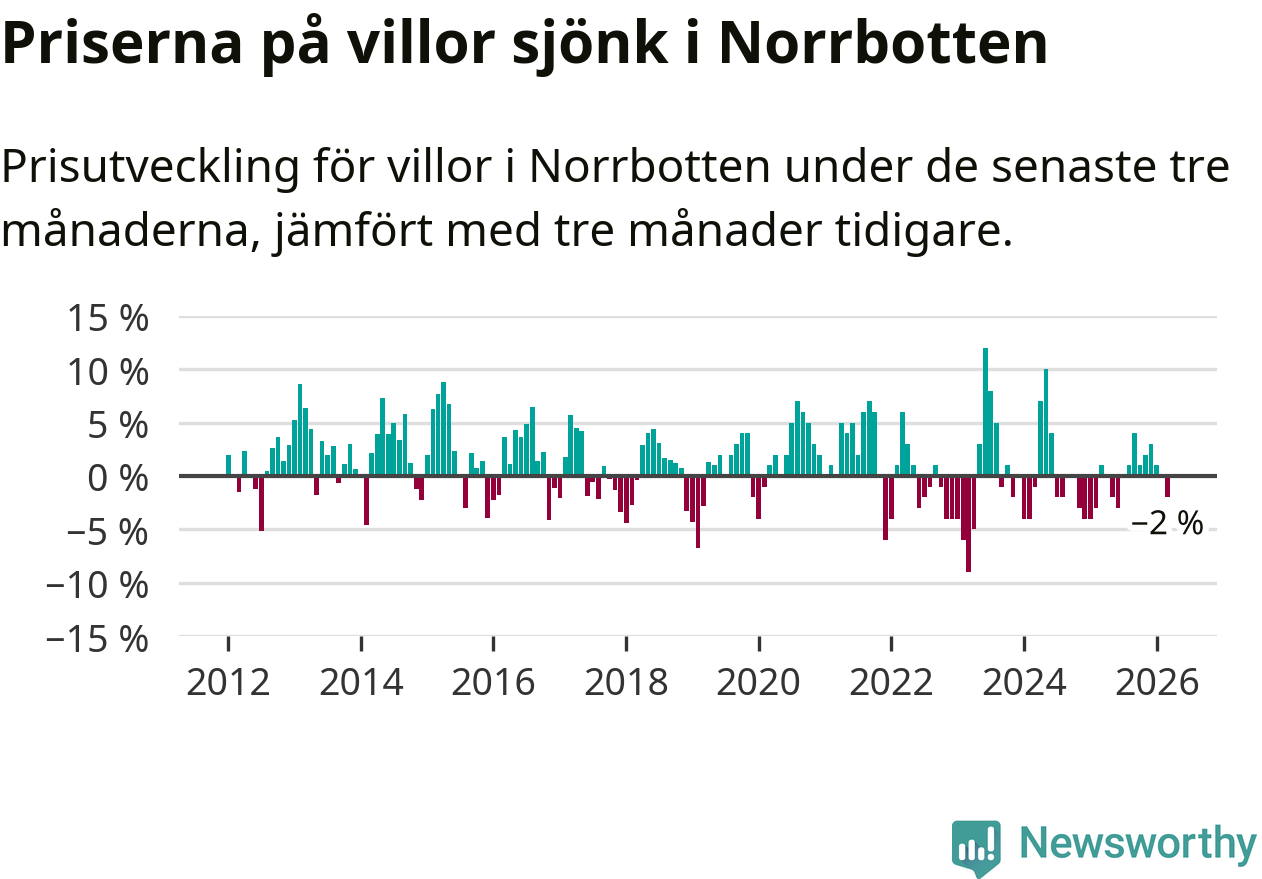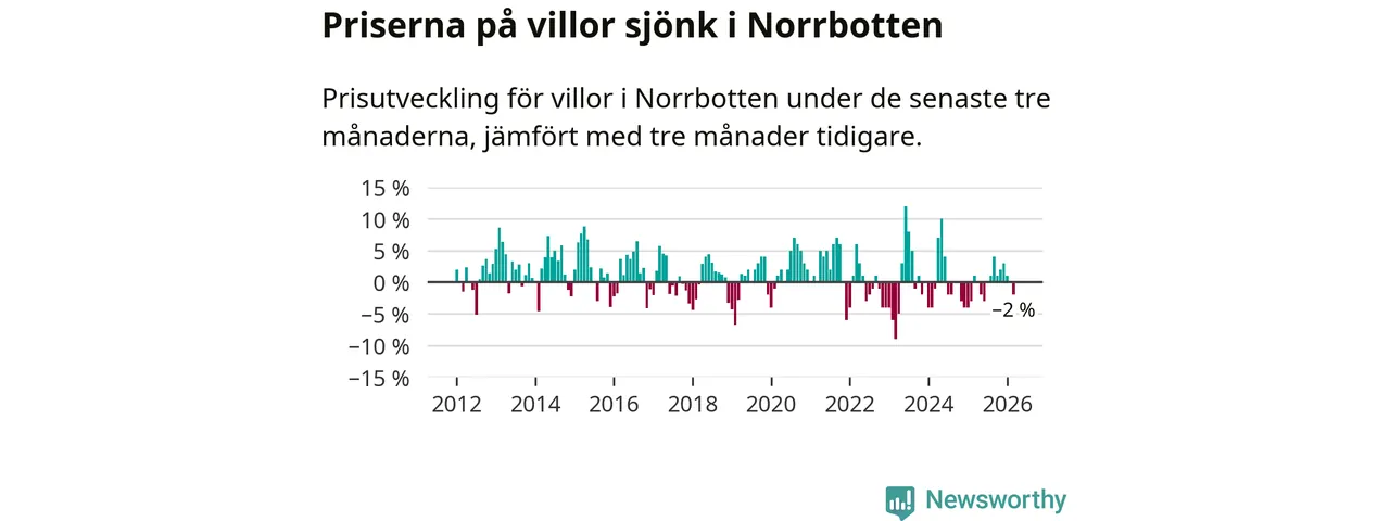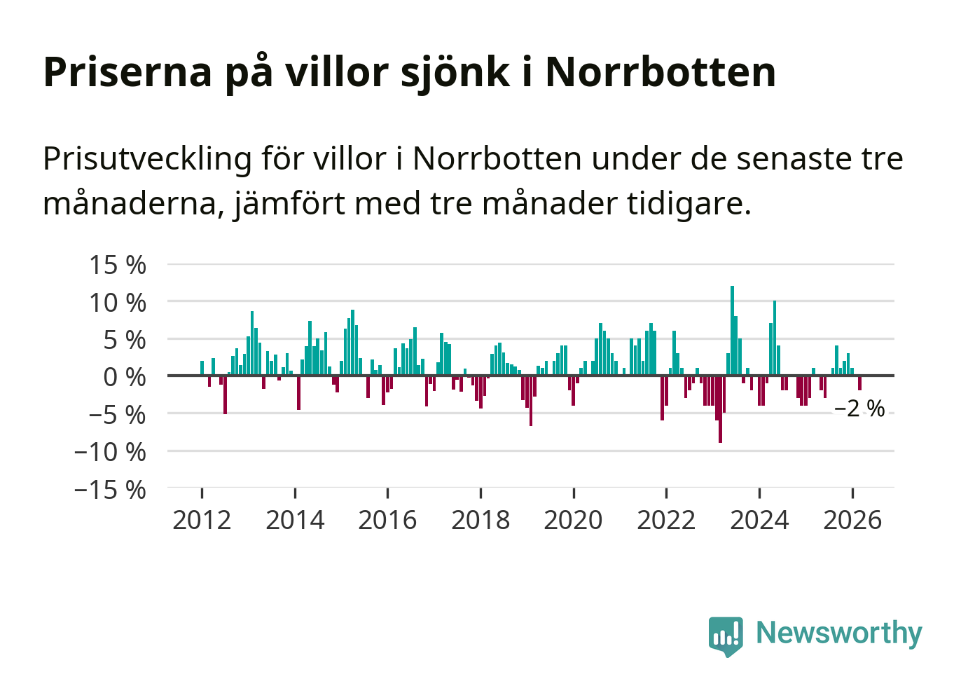 Villapriserna har gått ner i Norrbottens län. Medelpriset på försäljningarna under de senaste tre månaderna visar på en nedgång med 2 procent.