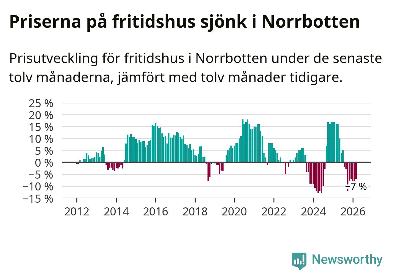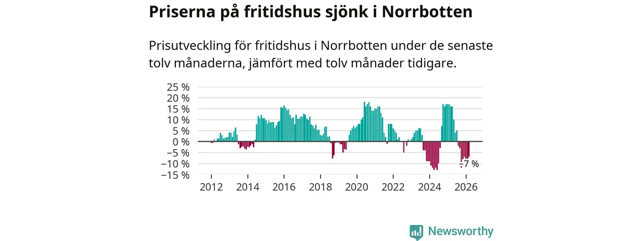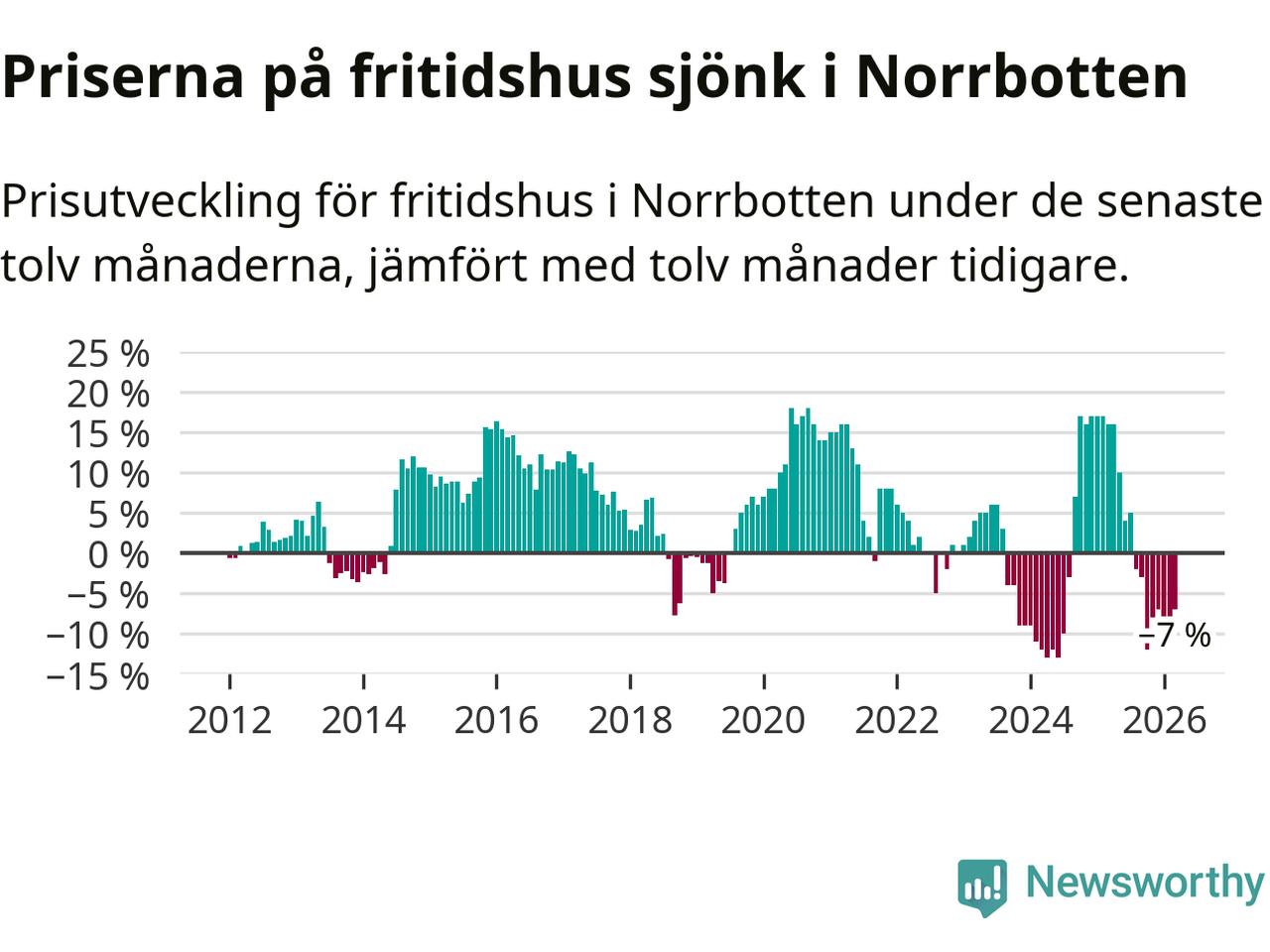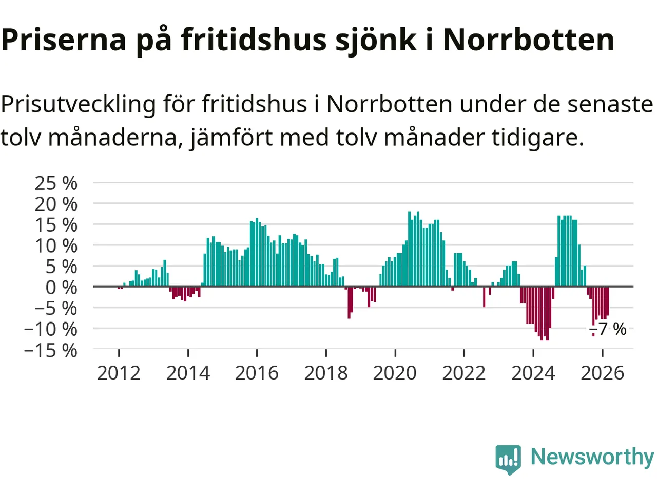 Priserna på fritidshus har gått ner i Norrbottens län. Medelpriset på försäljningarna under de senaste tolv månaderna visar på en nedgång med 7 procent.