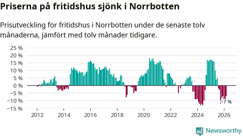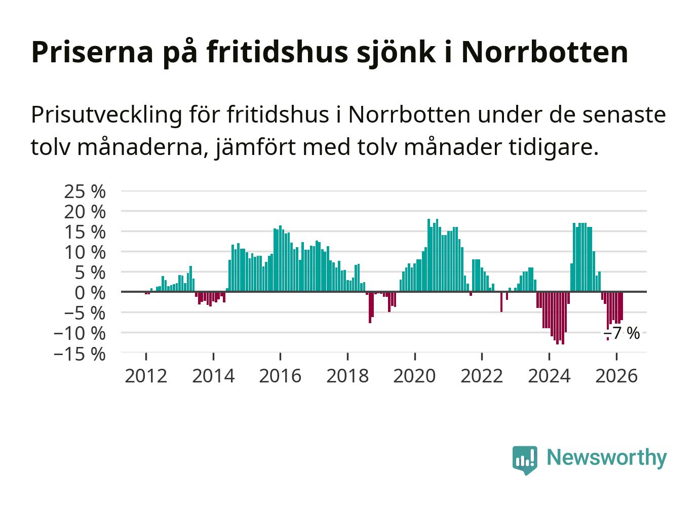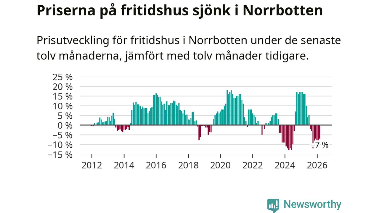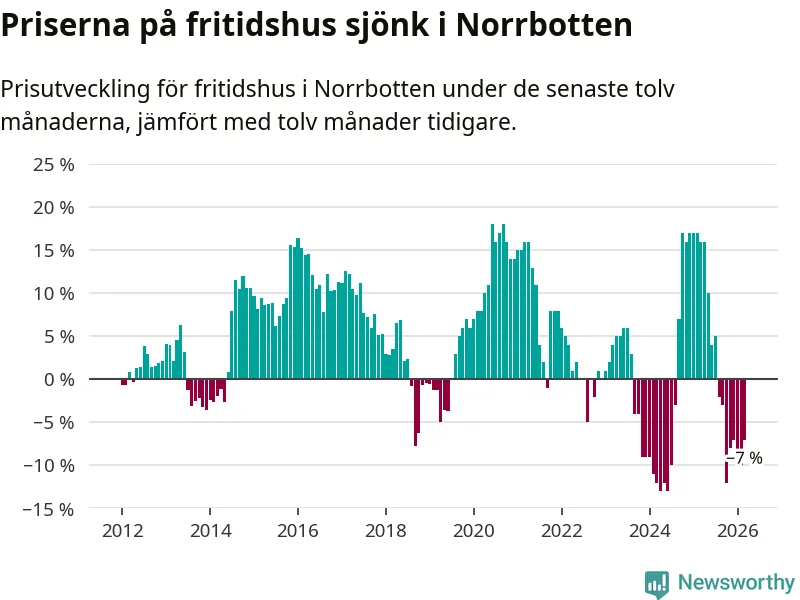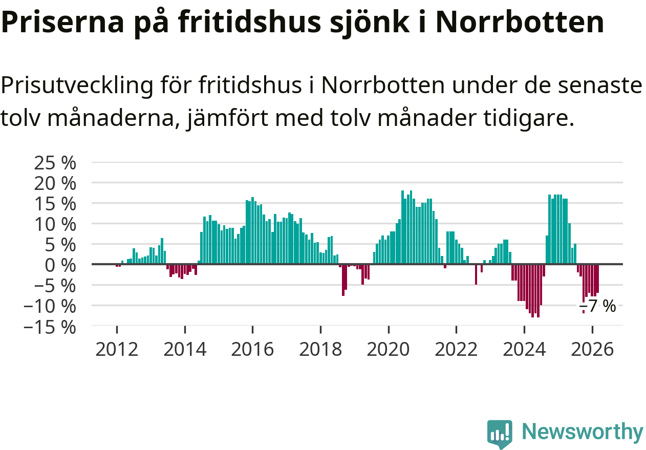 Priserna på fritidshus har gått ner i Norrbottens län. Medelpriset på försäljningarna under de senaste tolv månaderna visar på en nedgång med 7 procent.