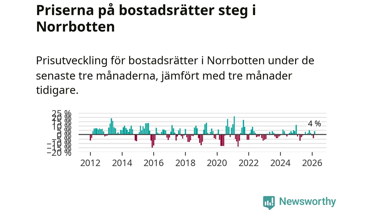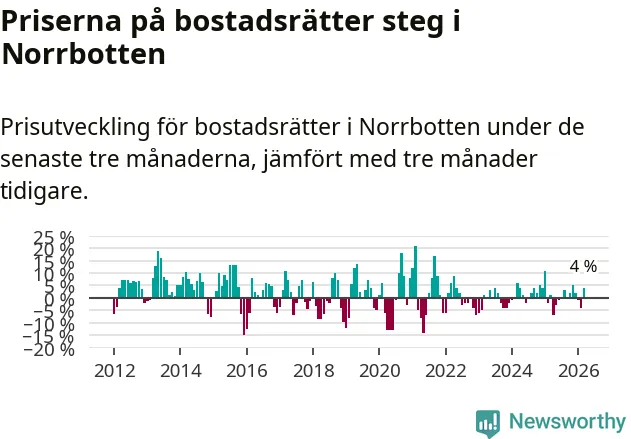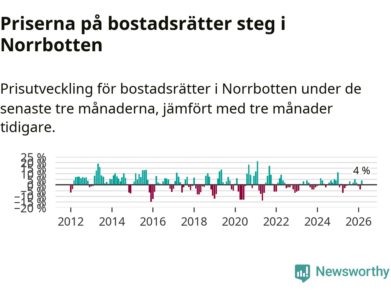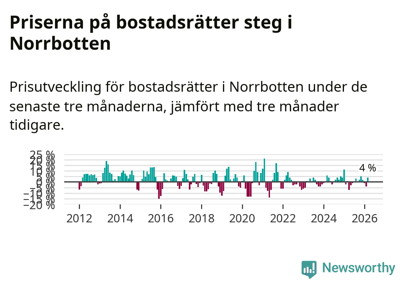 Priserna på bostadsrätter har gått upp i Norrbottens län. Medelpriset på försäljningarna under de senaste tre månaderna visar på en uppgång med 4 procent.