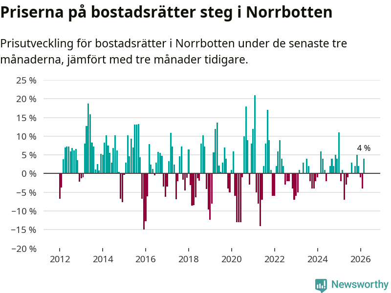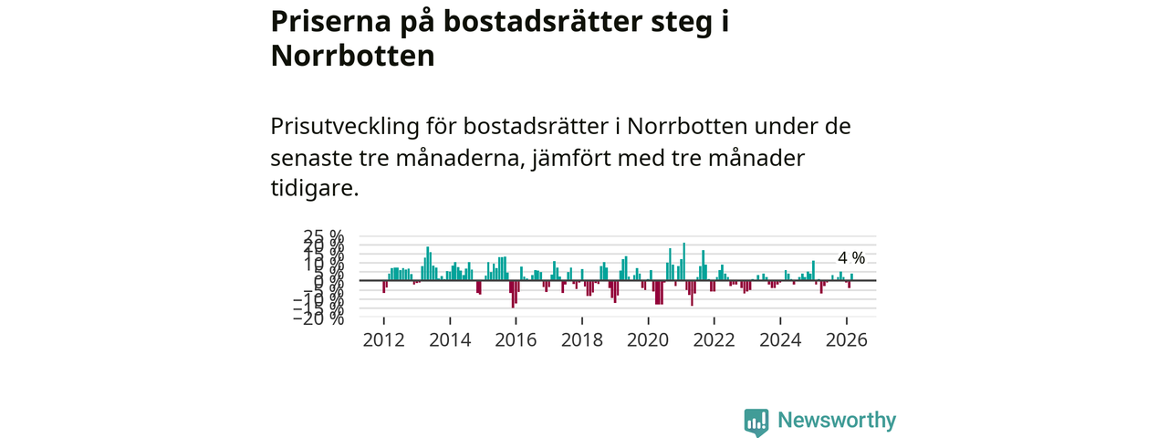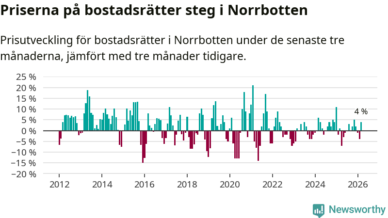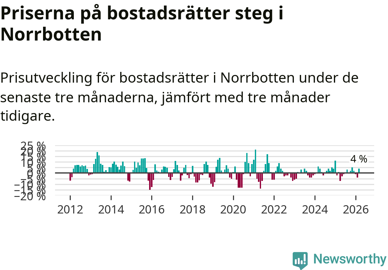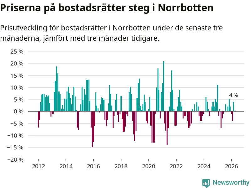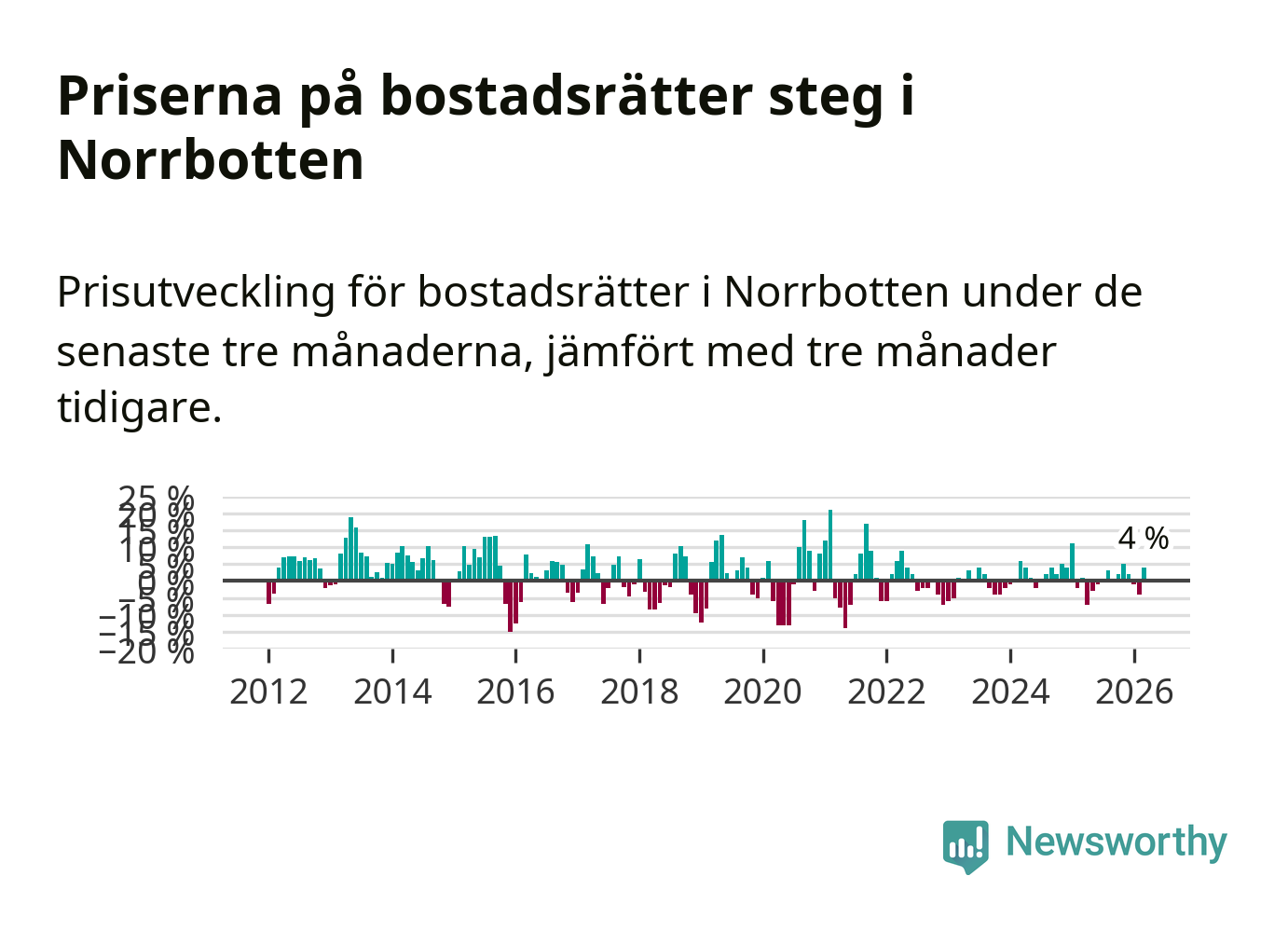 Priserna på bostadsrätter har gått upp i Norrbottens län. Medelpriset på försäljningarna under de senaste tre månaderna visar på en uppgång med 4 procent.