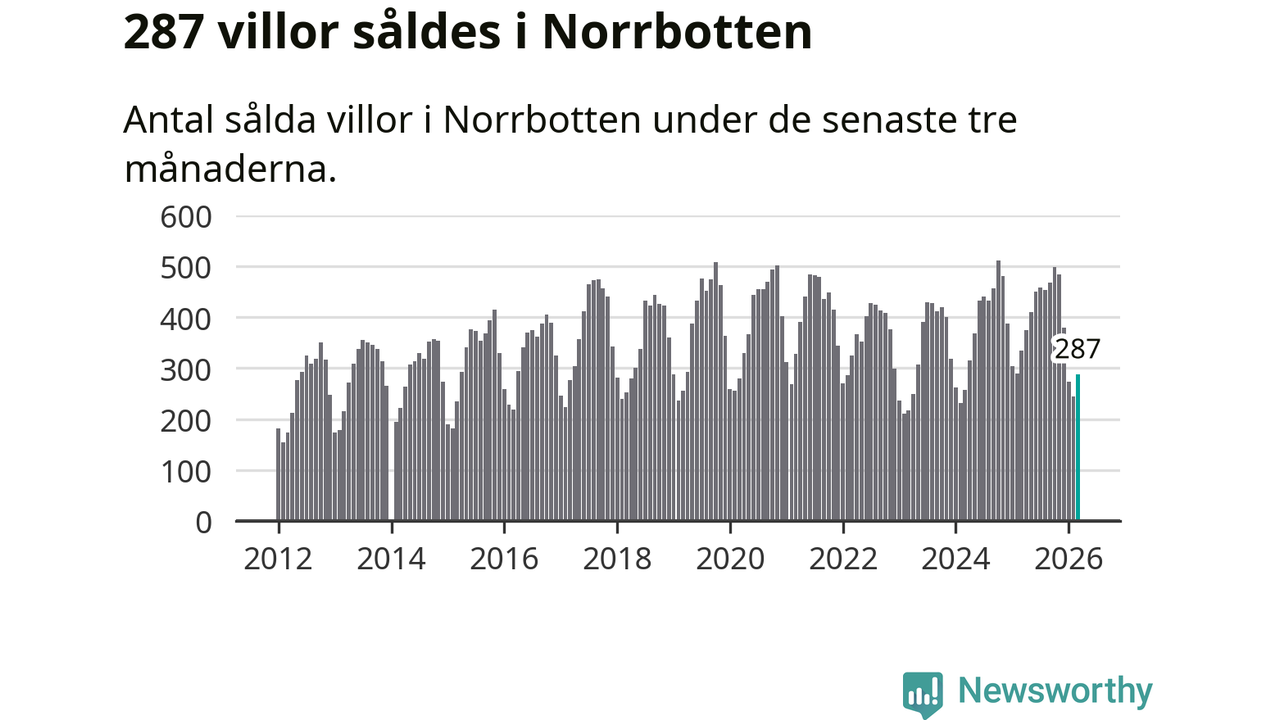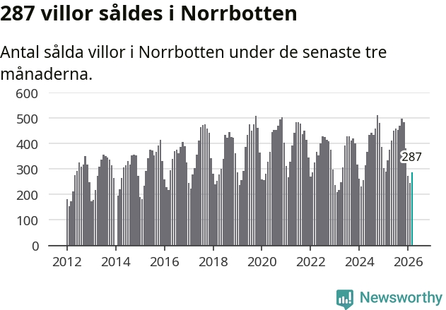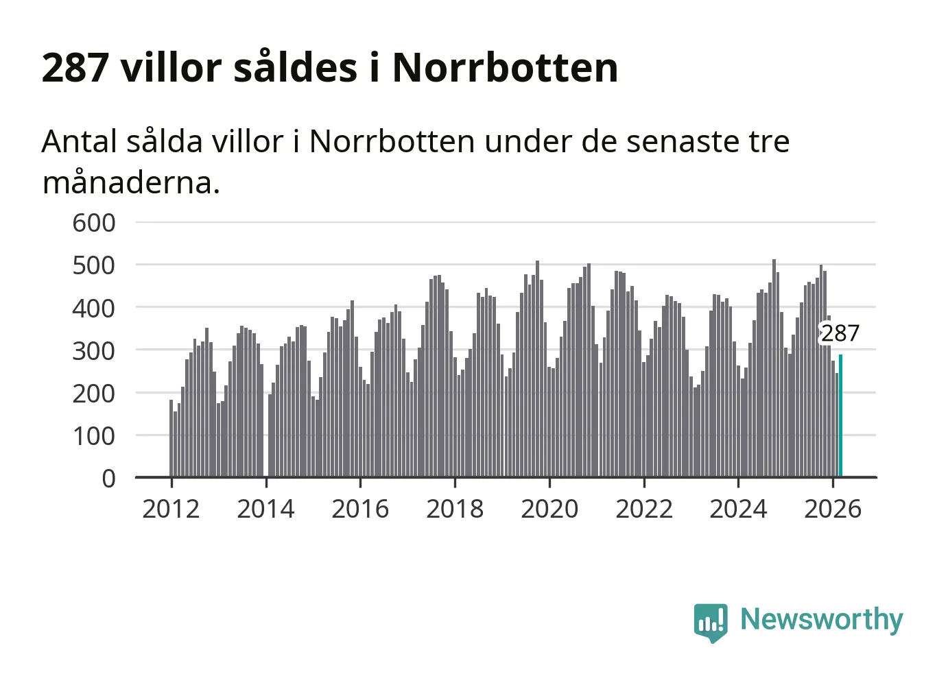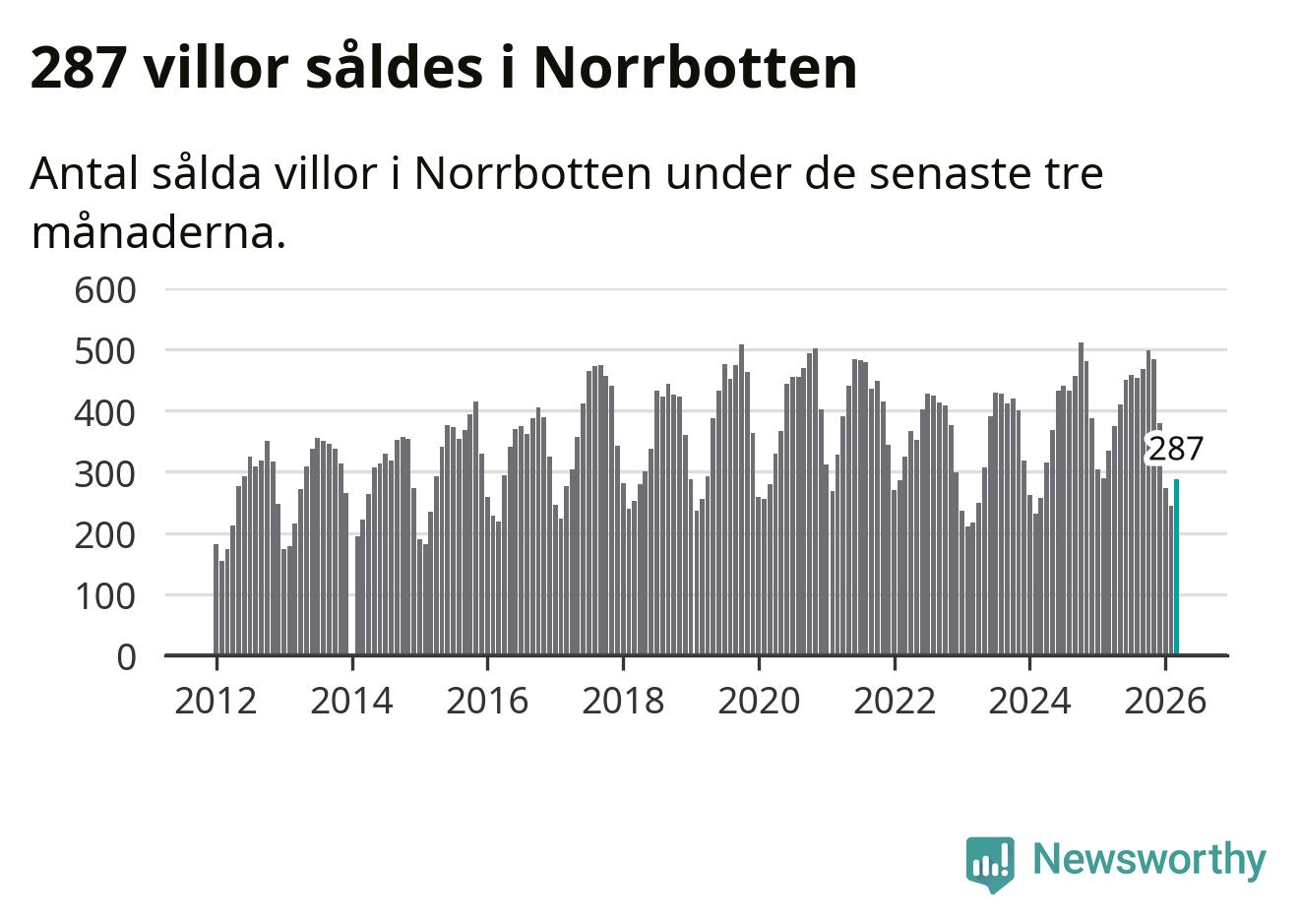 Sammanlagt såldes 287 villor i Norrbottens län mellan januari och mars till ett genomsnittligt pris på 2,5 miljoner kronor. I fjol gjordes 334 affärer vid den här tiden på året.