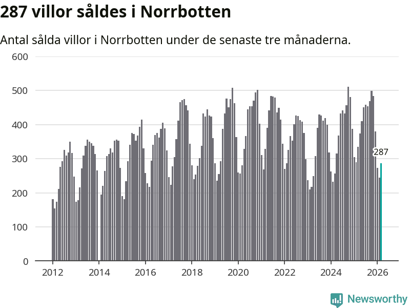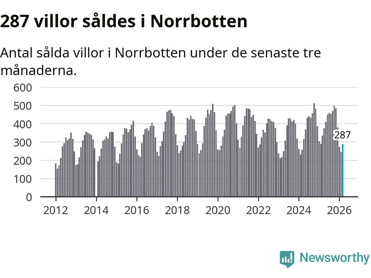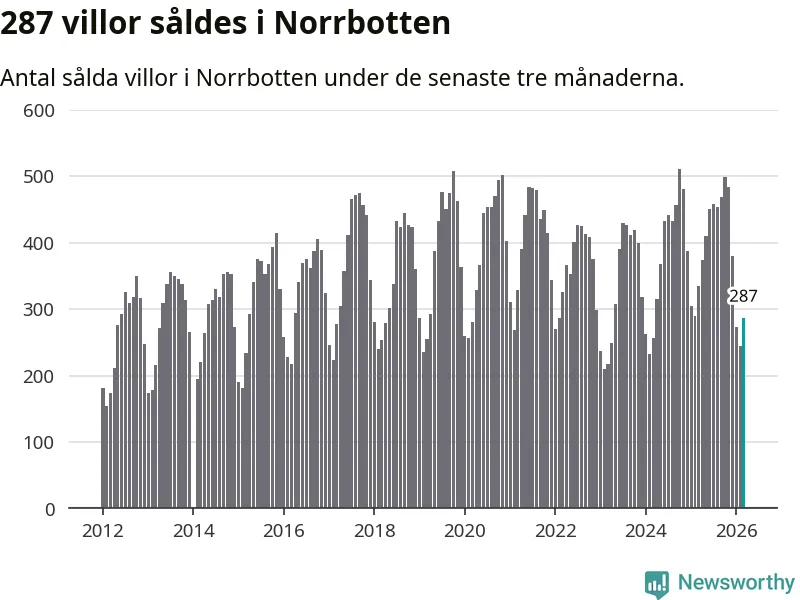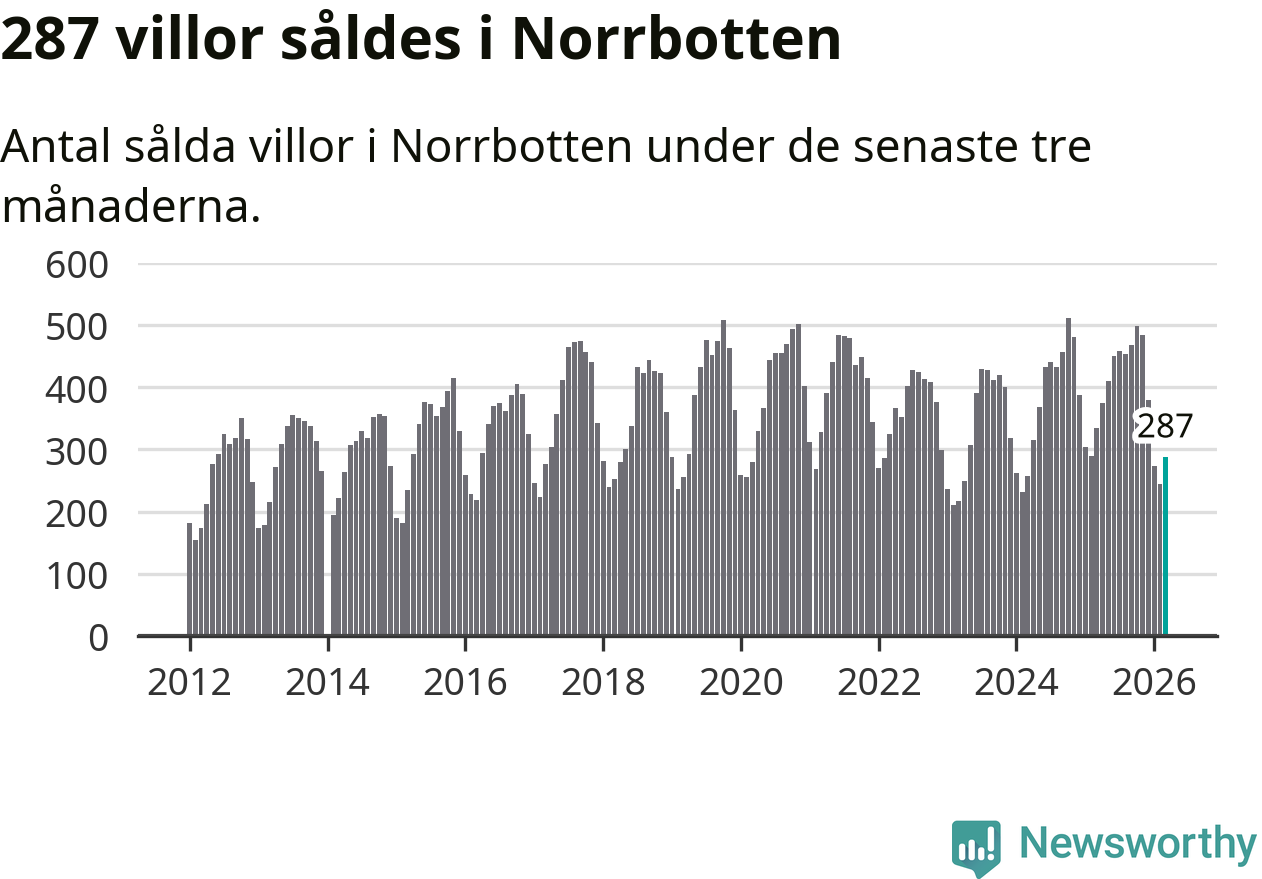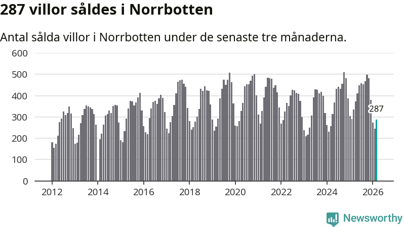 Sammanlagt såldes 287 villor i Norrbottens län mellan januari och mars till ett genomsnittligt pris på 2,5 miljoner kronor. I fjol gjordes 334 affärer vid den här tiden på året.