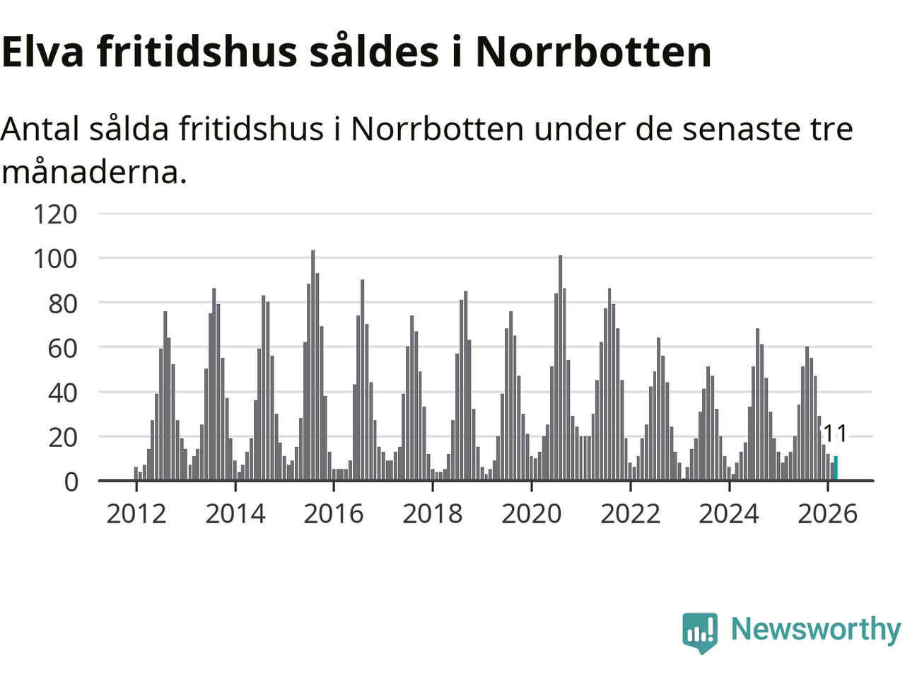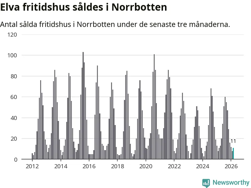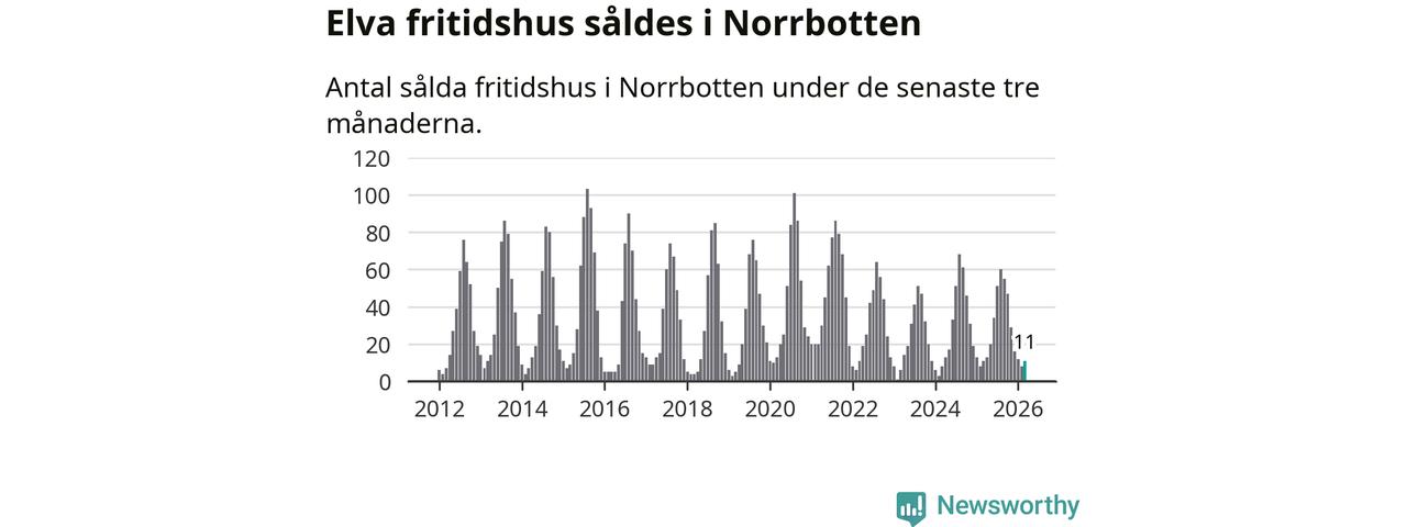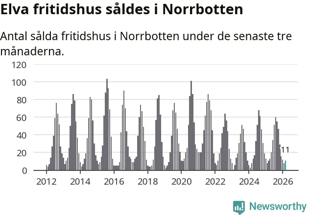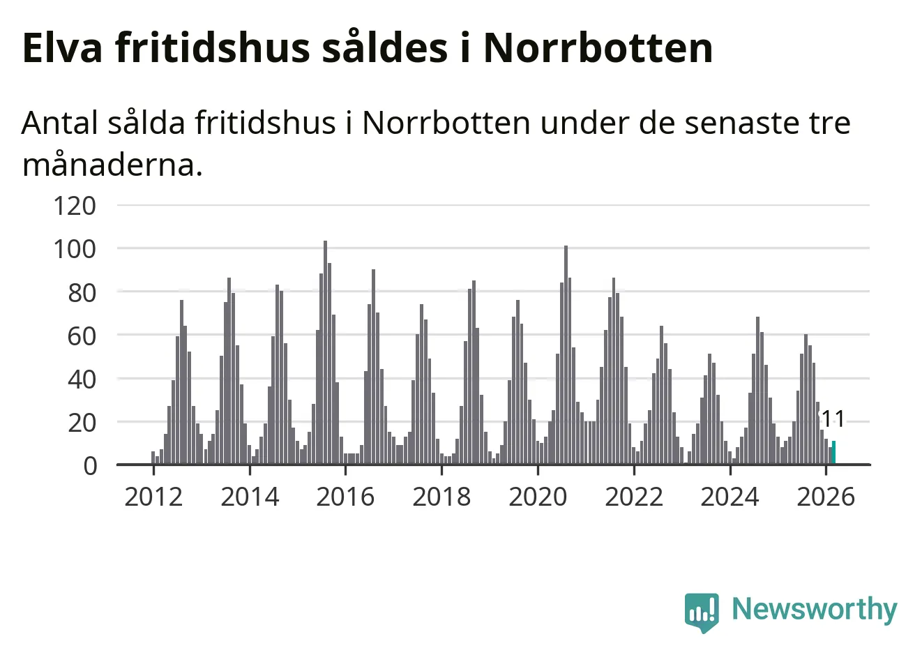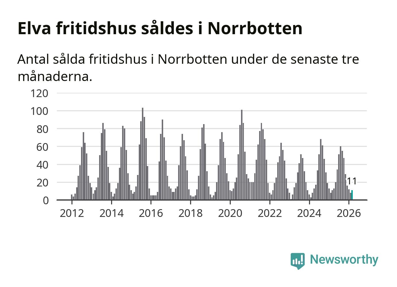 Sammanlagt såldes elva fritidshus i Norrbottens län mellan januari och mars till ett genomsnittligt pris på 1,4 miljoner kronor. I fjol gjordes elva affärer vid den här tiden på året.