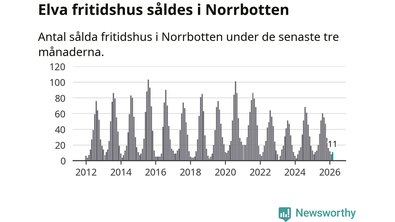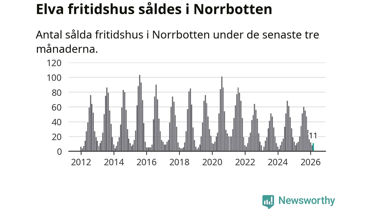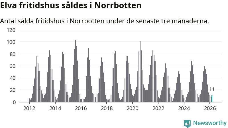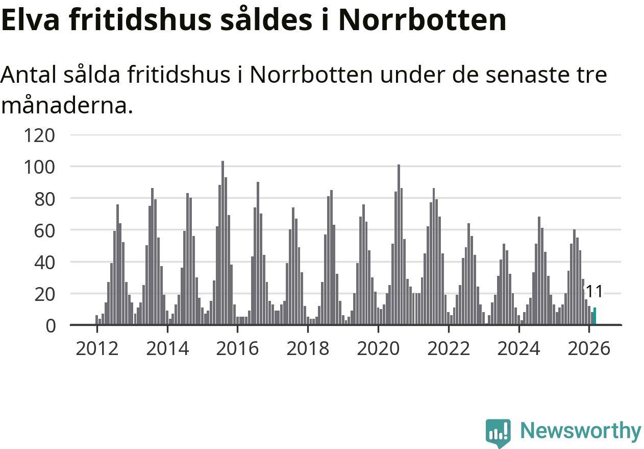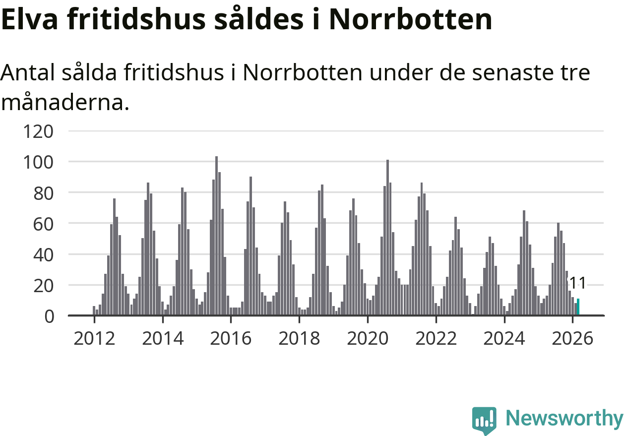 Sammanlagt såldes elva fritidshus i Norrbottens län mellan januari och mars till ett genomsnittligt pris på 1,4 miljoner kronor. I fjol gjordes elva affärer vid den här tiden på året.