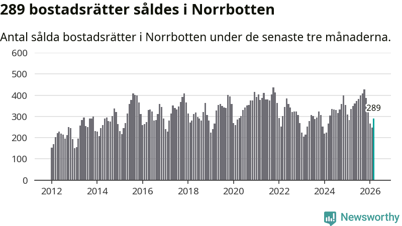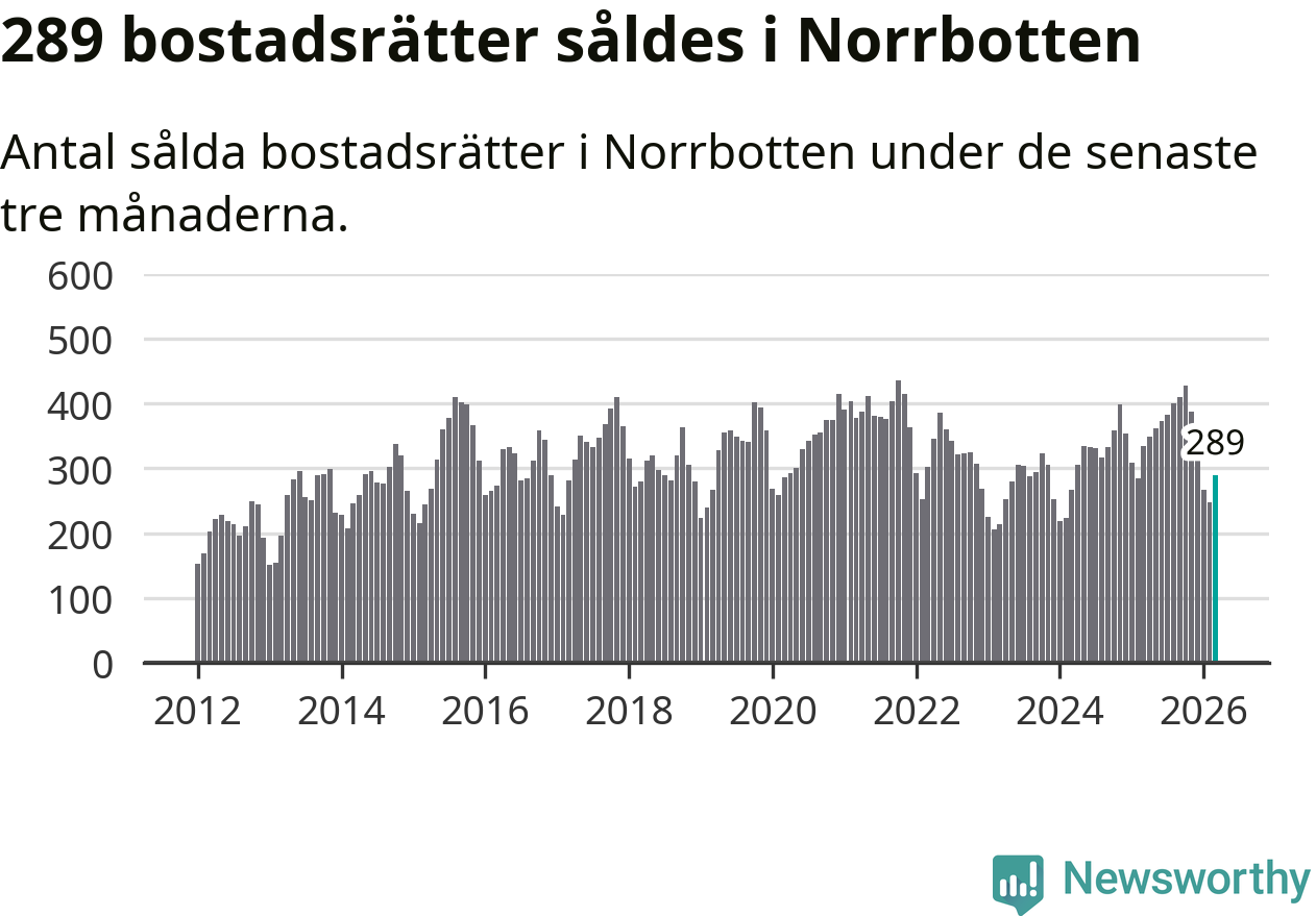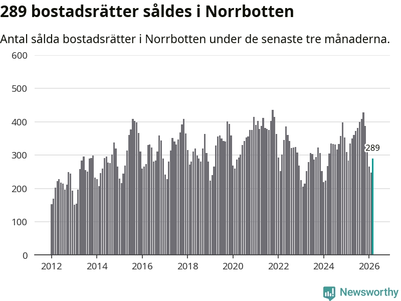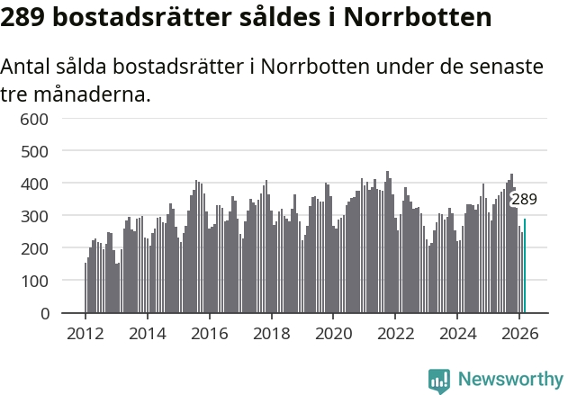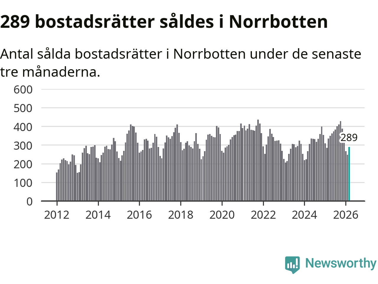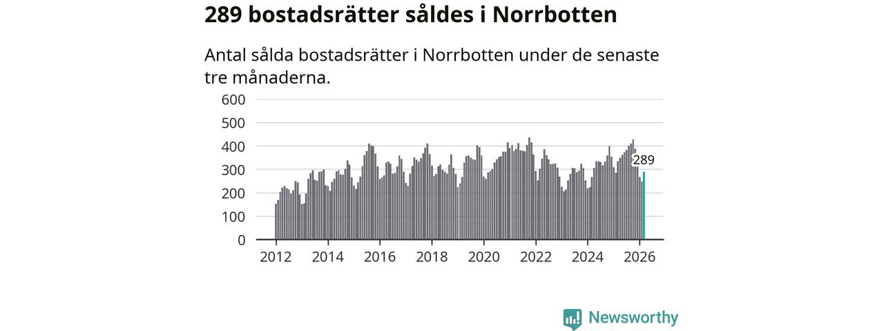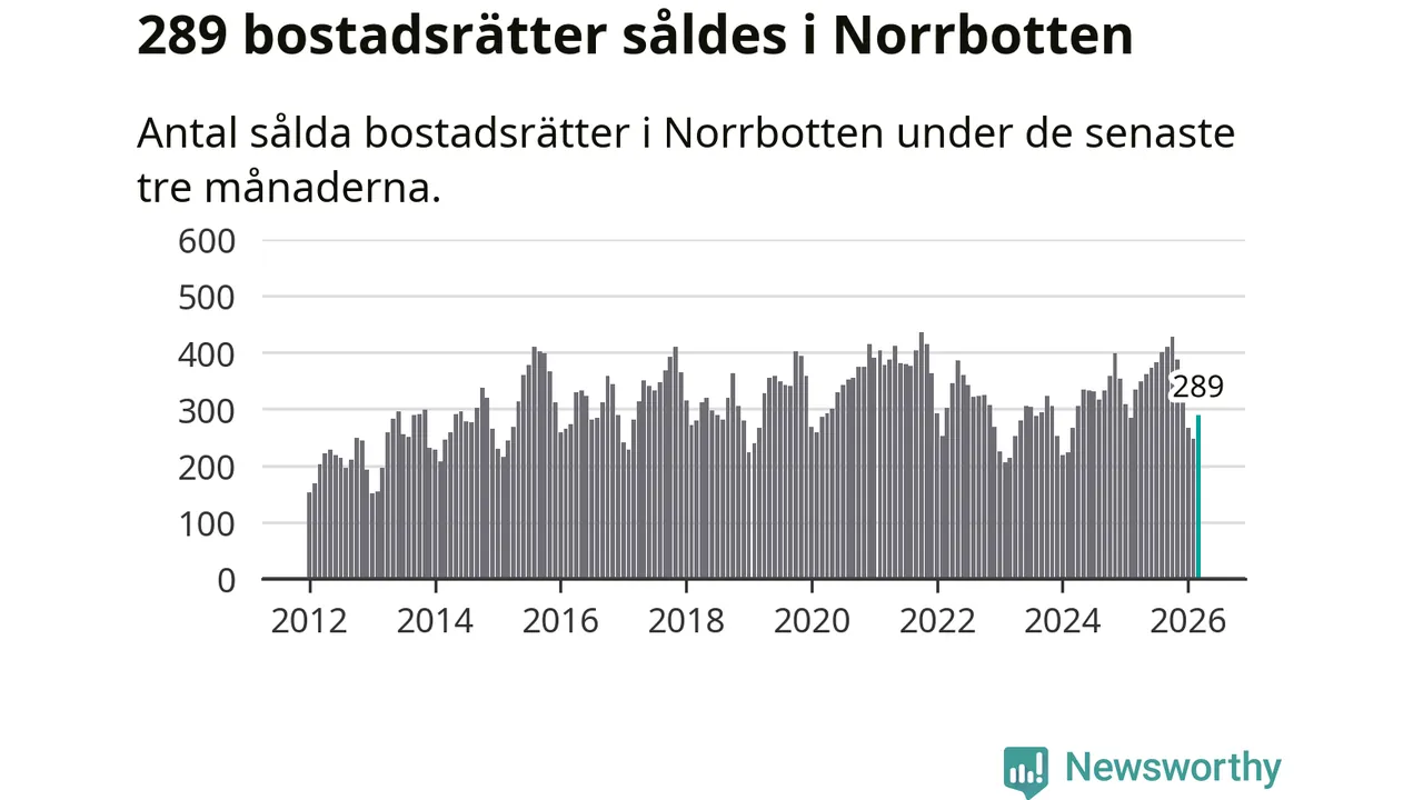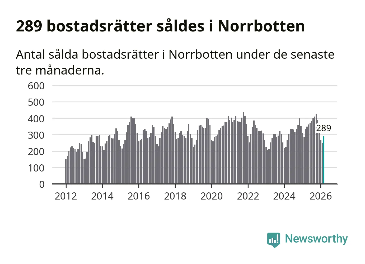 Sammanlagt såldes 289 bostadsrätter i Norrbottens län mellan januari och mars till ett genomsnittligt pris på 1,7 miljoner kronor. I fjol gjordes 335 affärer vid den här tiden på året.