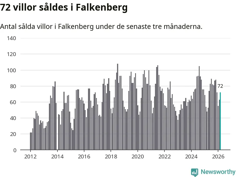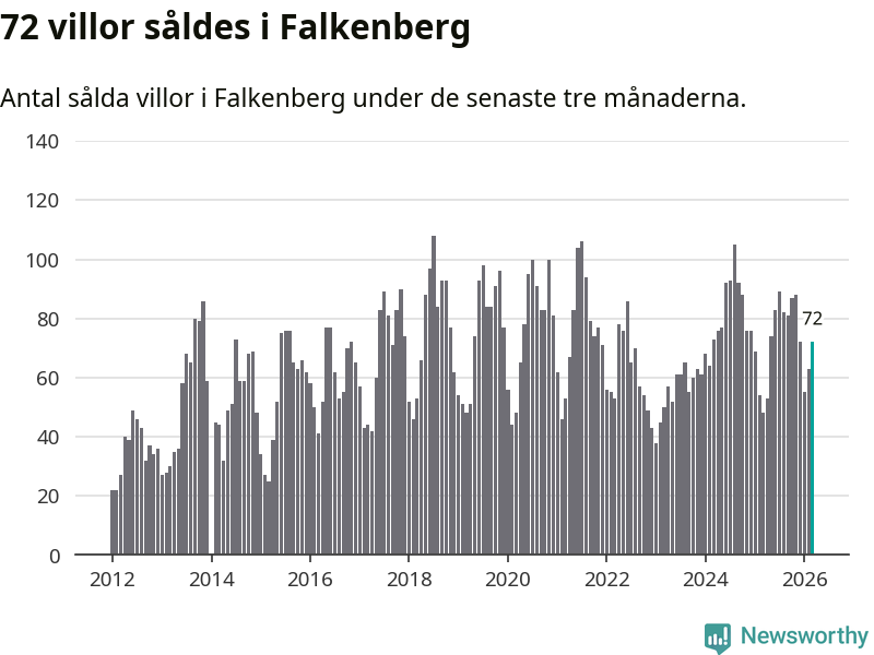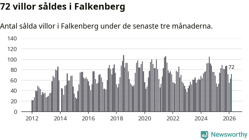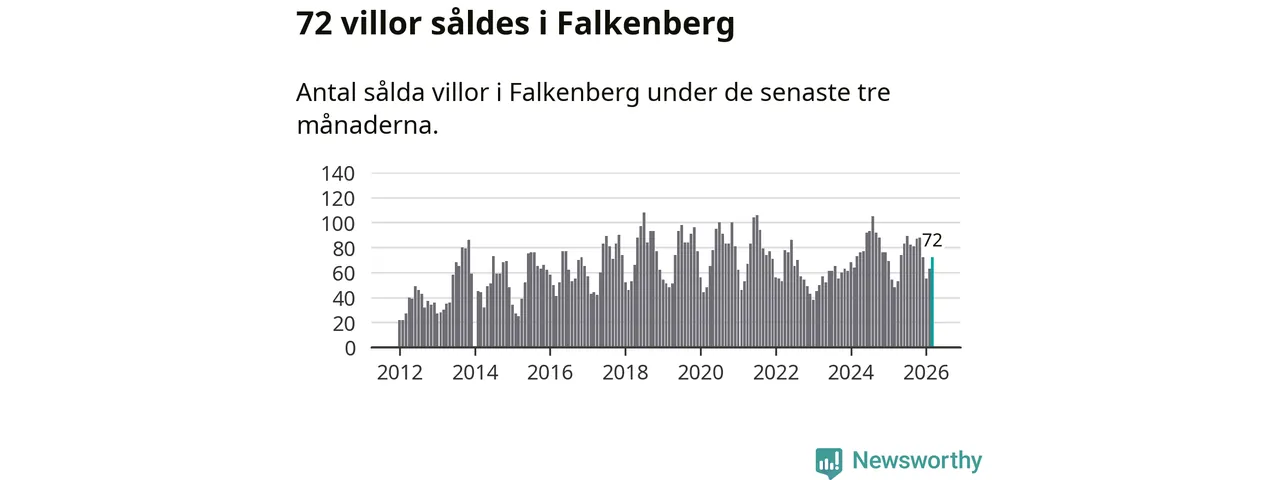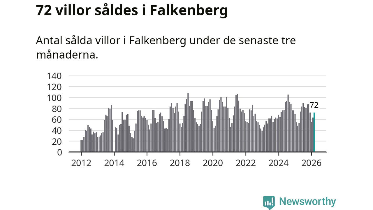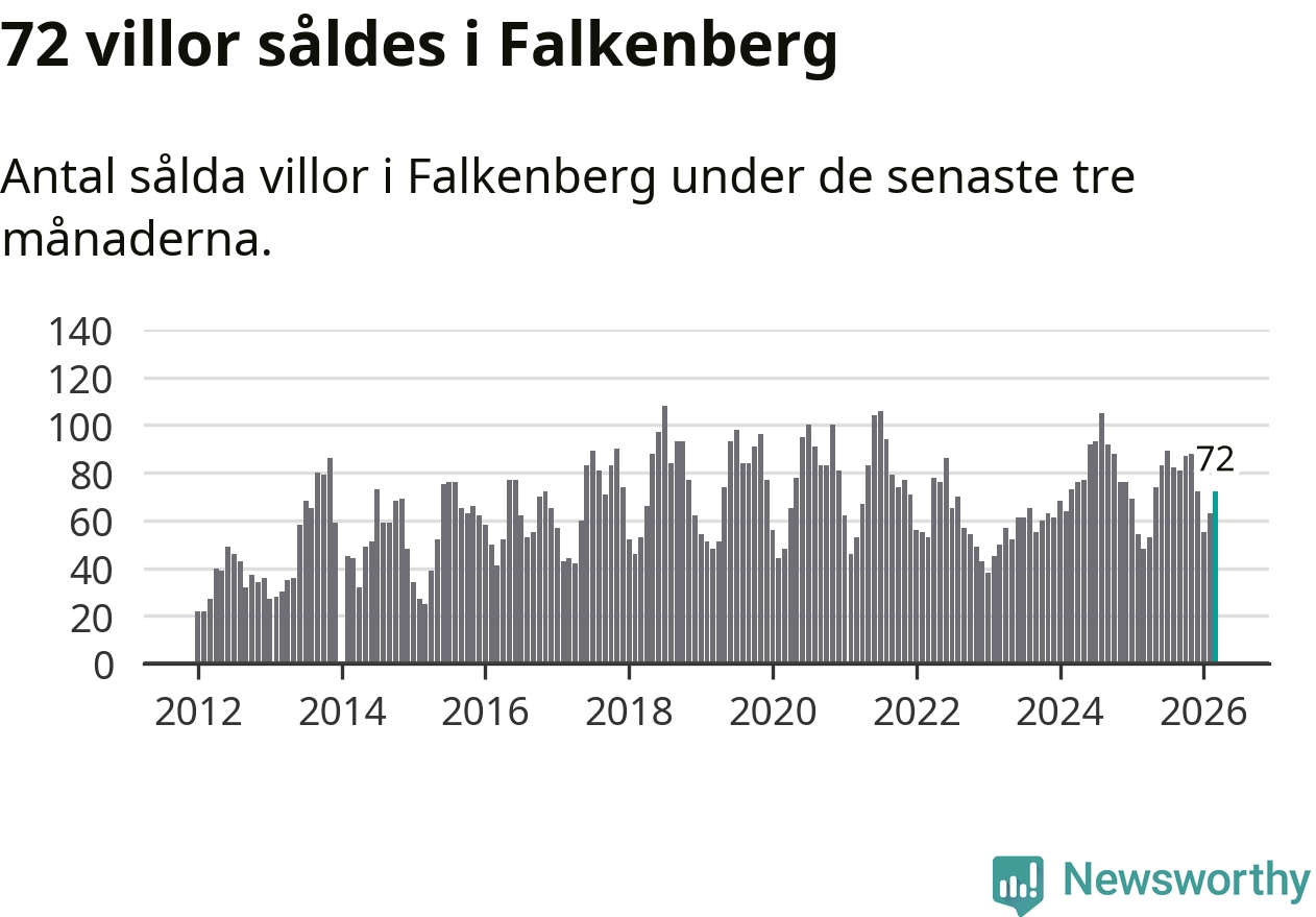Mellan januari och mars såldes 72 villor i Falkenbergs kommun. Det är relativt många sett till aktiviteten på bostadsmarknaden i kommunen under de senaste tolv månaderna, samt det historiska snittet för den här tiden på året.