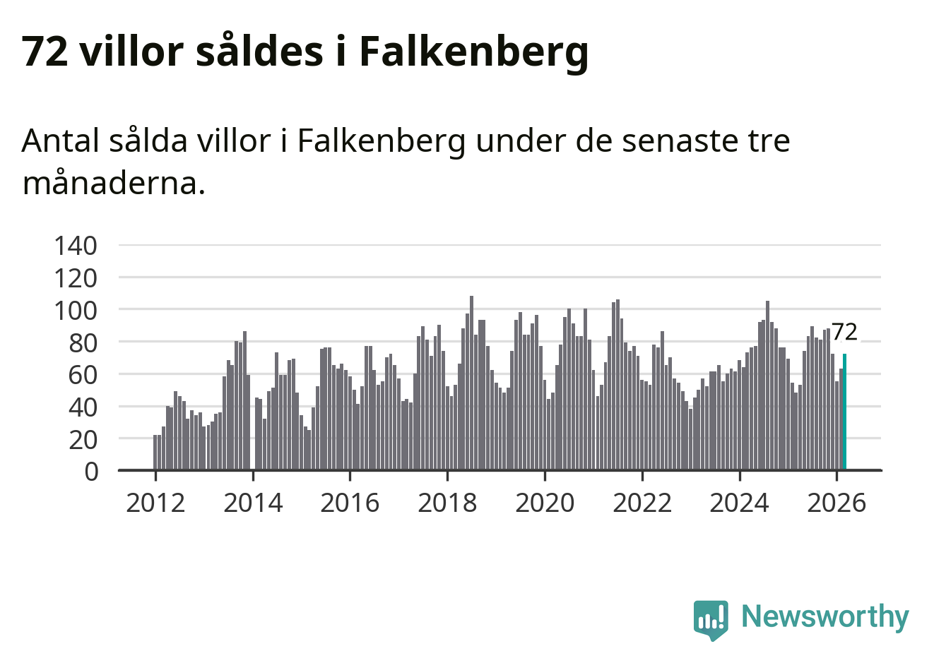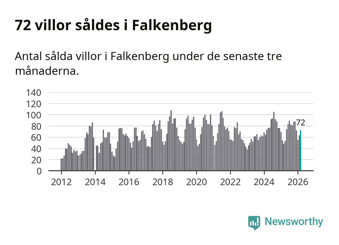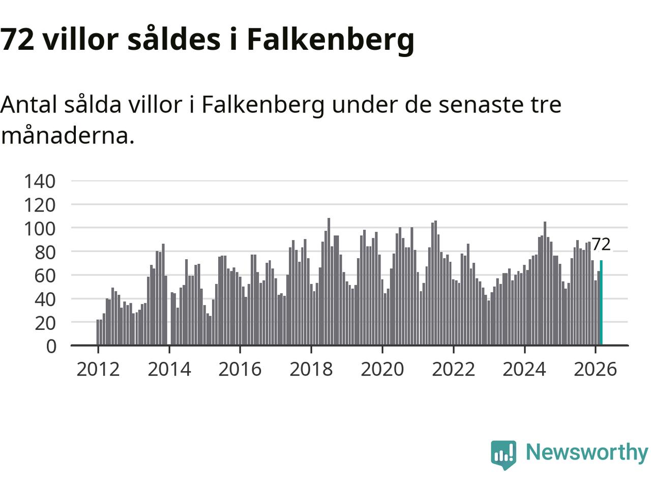 Mellan januari och mars såldes 72 villor i Falkenbergs kommun. Det är relativt många sett till aktiviteten på bostadsmarknaden i kommunen under de senaste tolv månaderna, samt det historiska snittet för den här tiden på året.
