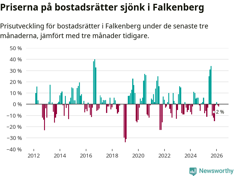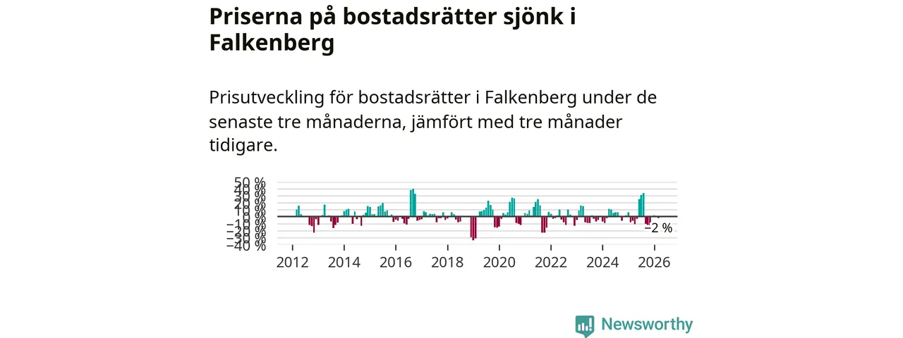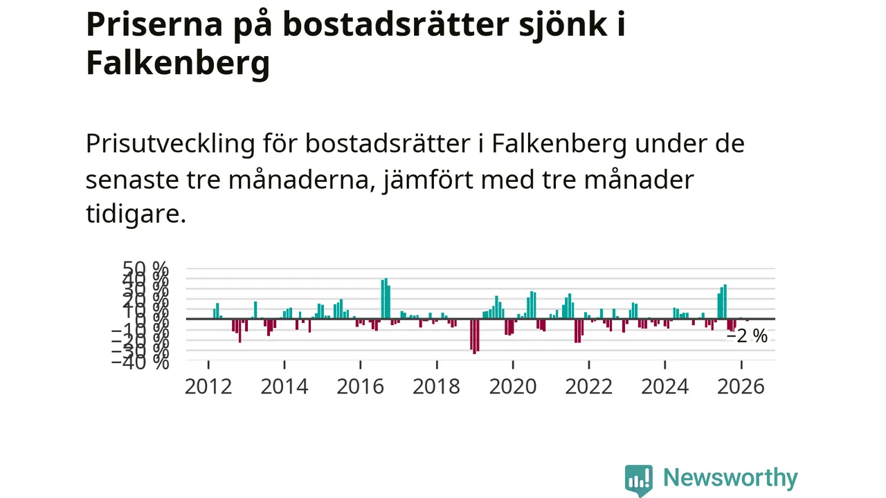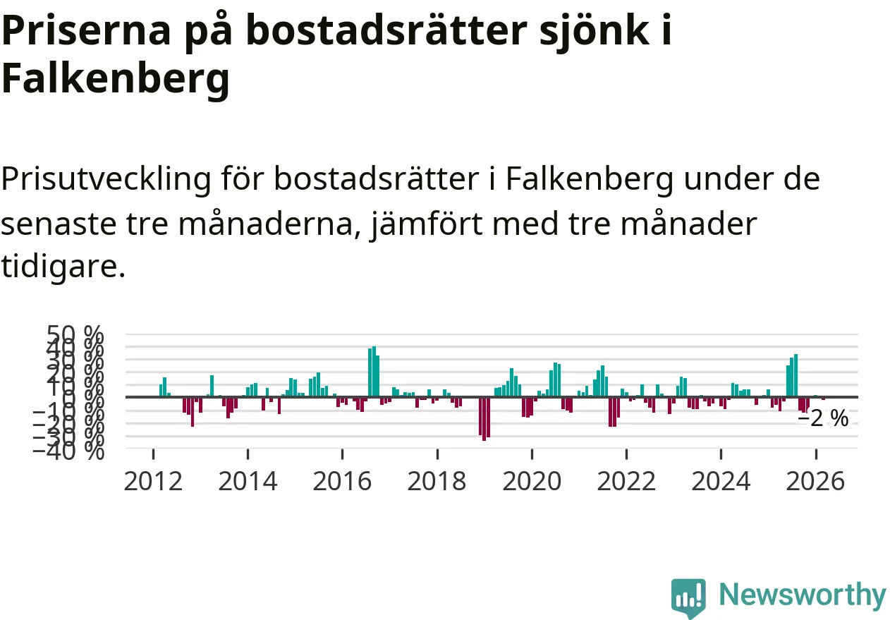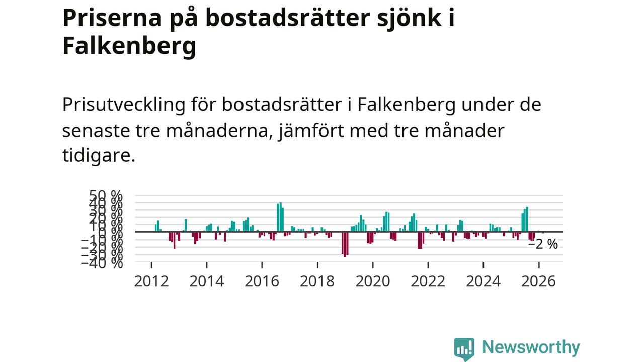 Priserna på bostadsrätter har gått ner i Falkenbergs kommun. Medelpriset på försäljningarna under de senaste tre månaderna visar på en nedgång med 2 procent.