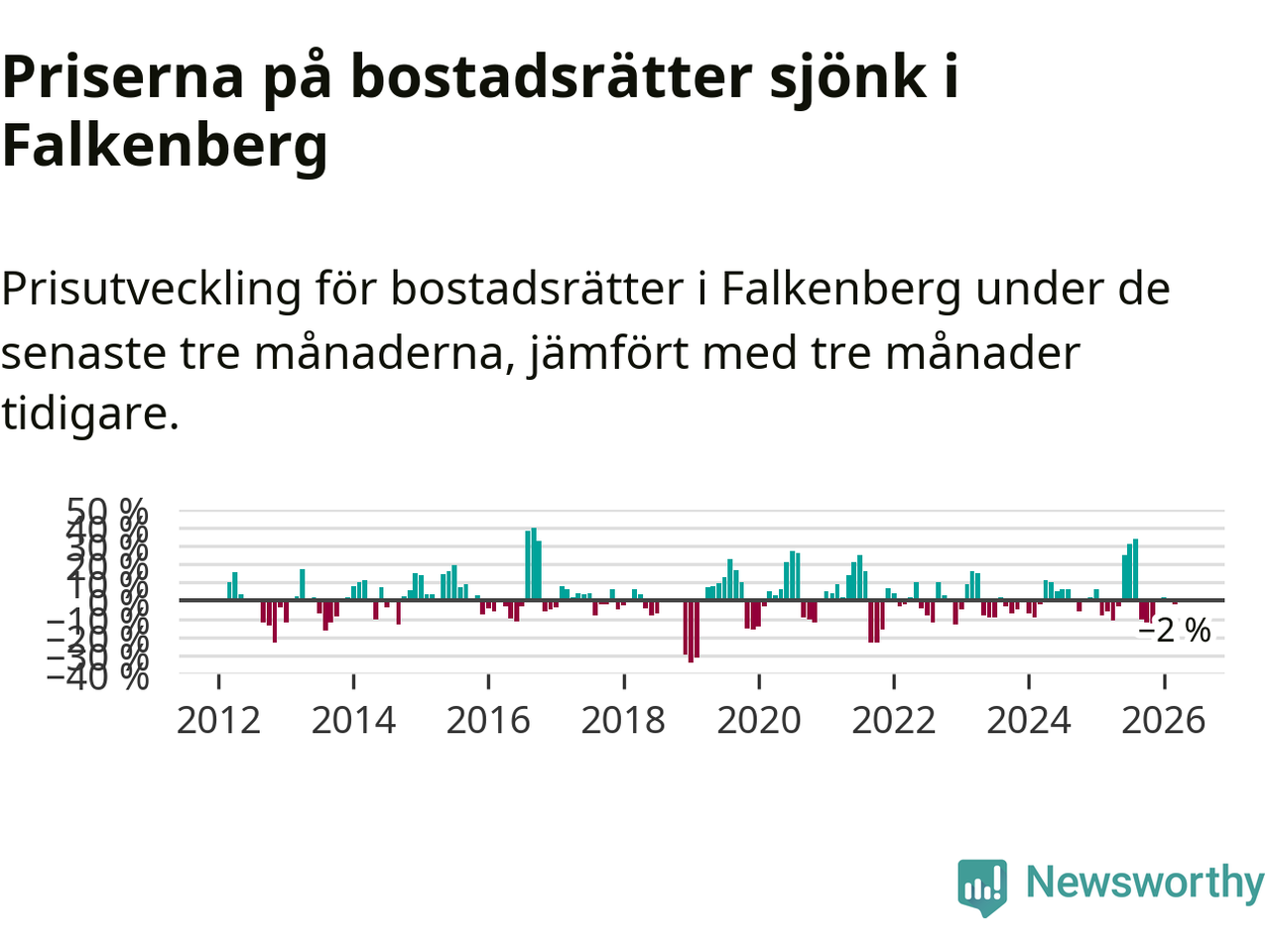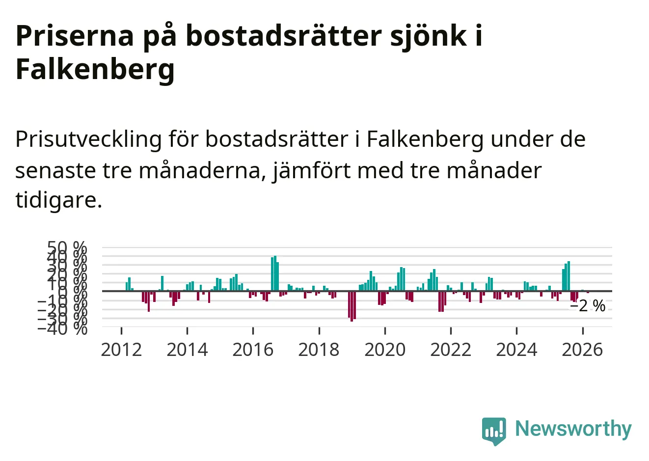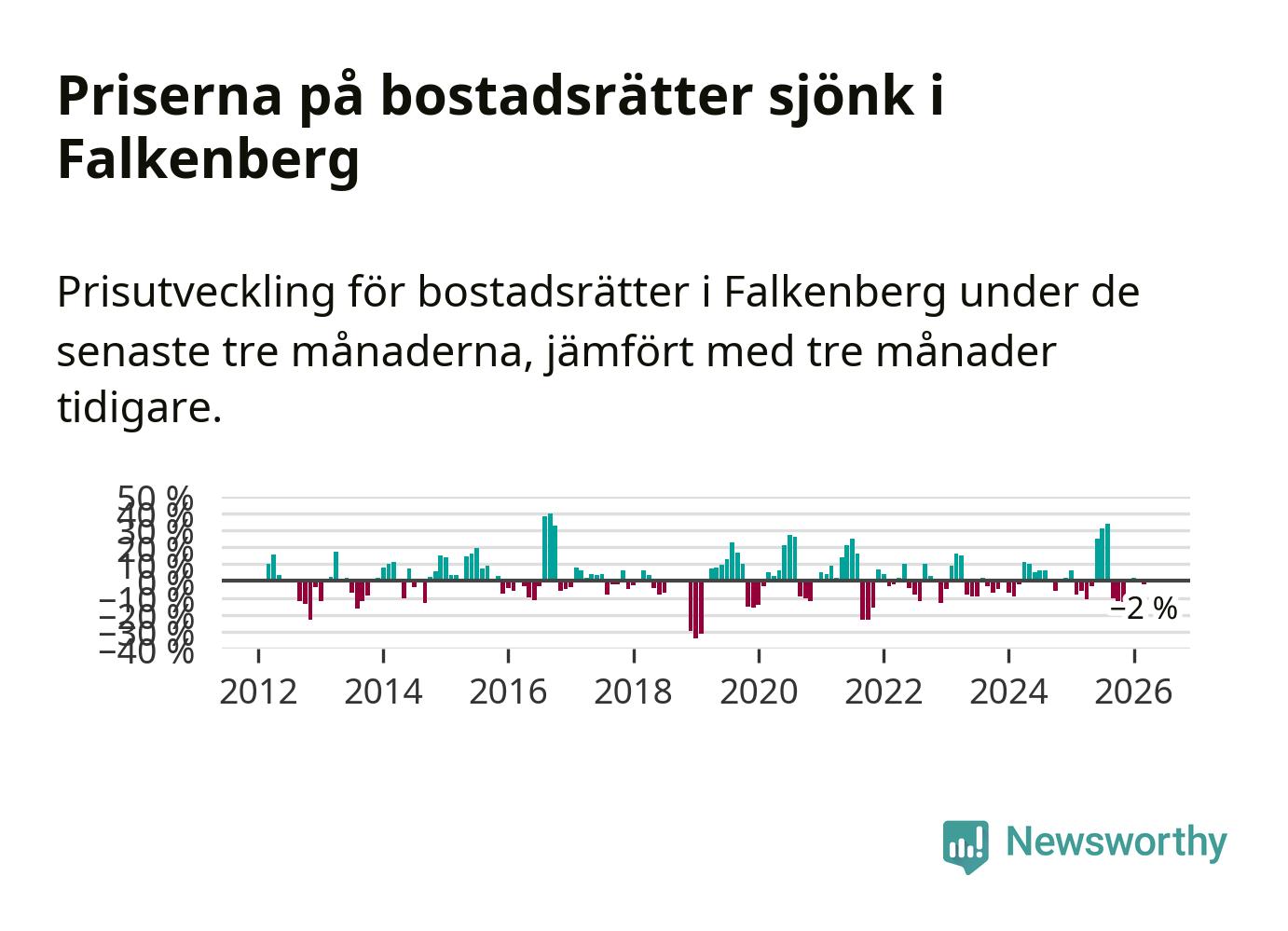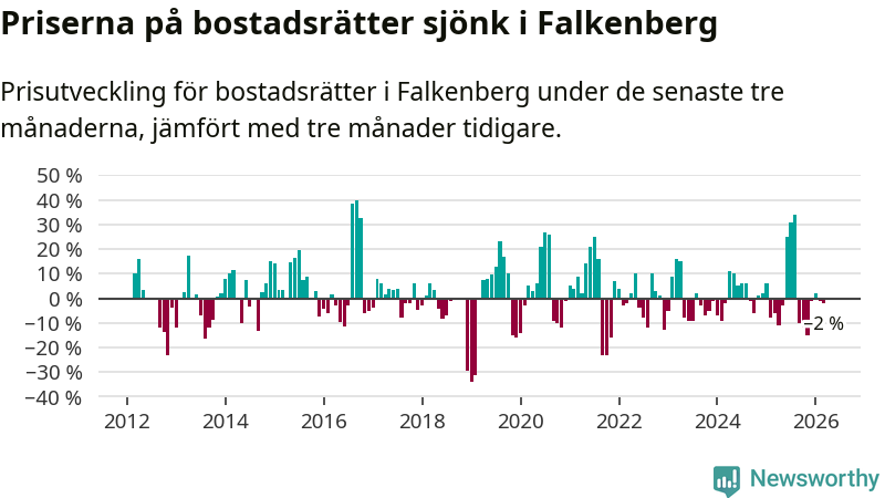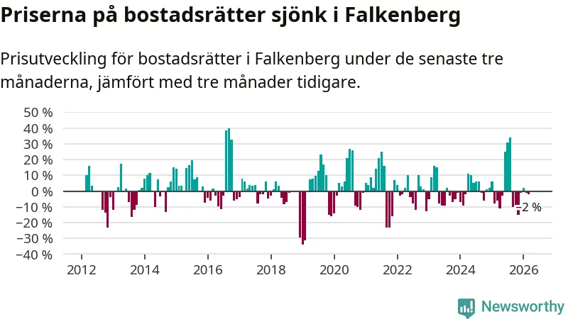 Priserna på bostadsrätter har gått ner i Falkenbergs kommun. Medelpriset på försäljningarna under de senaste tre månaderna visar på en nedgång med 2 procent.