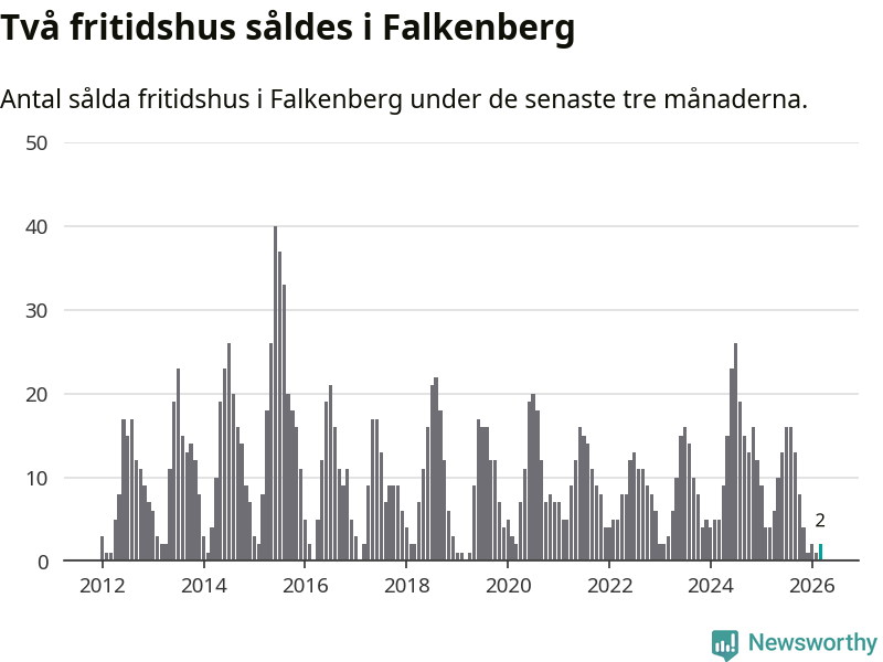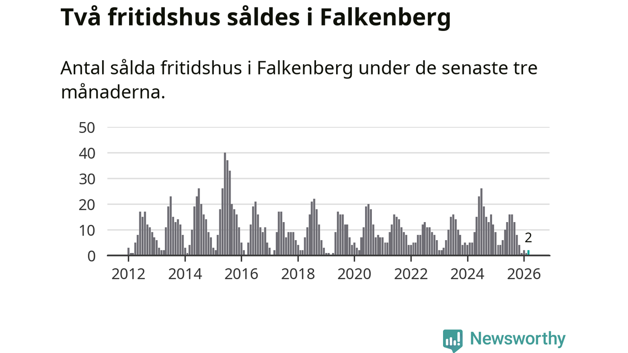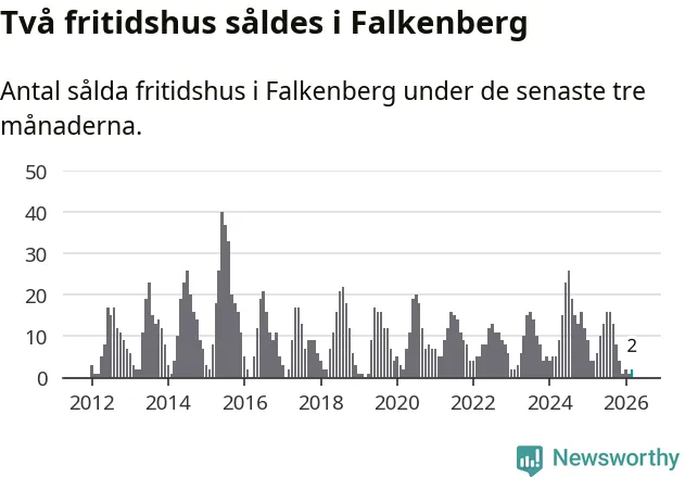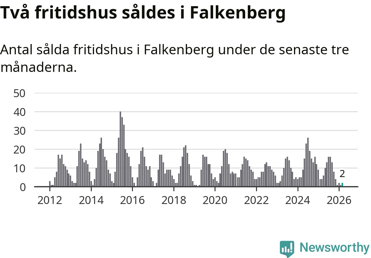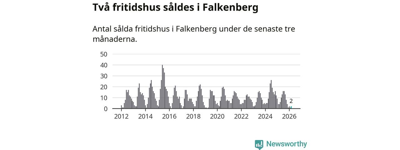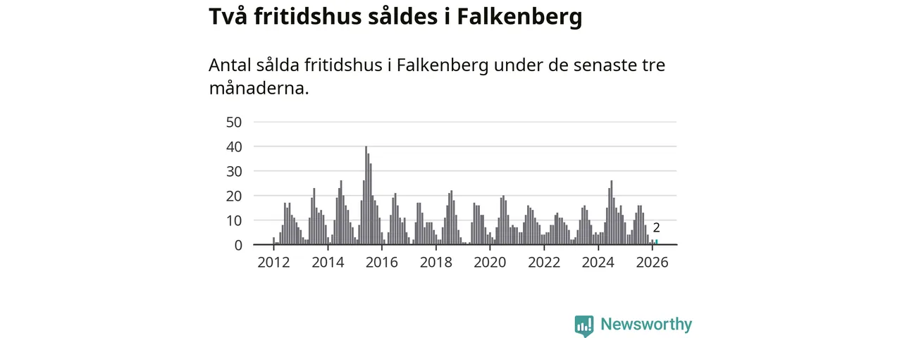 Sammanlagt såldes två fritidshus i Falkenbergs kommun mellan januari och mars till ett genomsnittligt pris på 3,5 miljoner kronor. I fjol gjordes fyra affärer vid den här tiden på året.