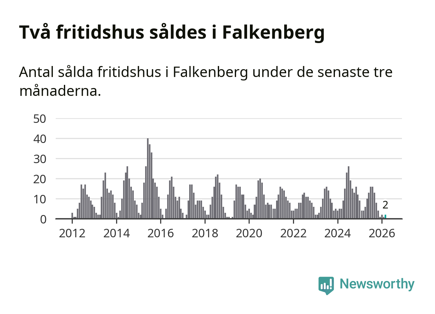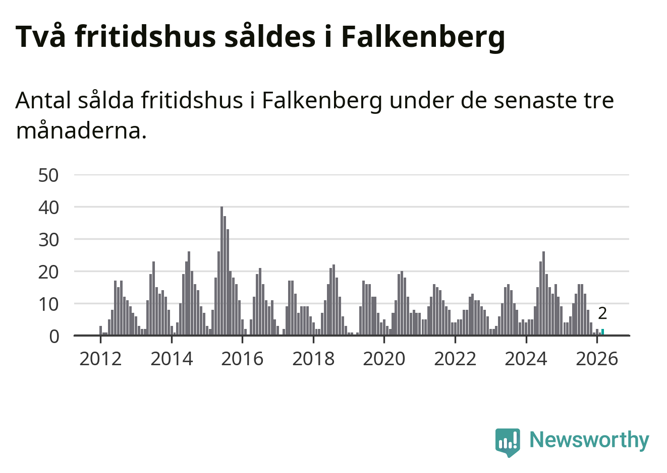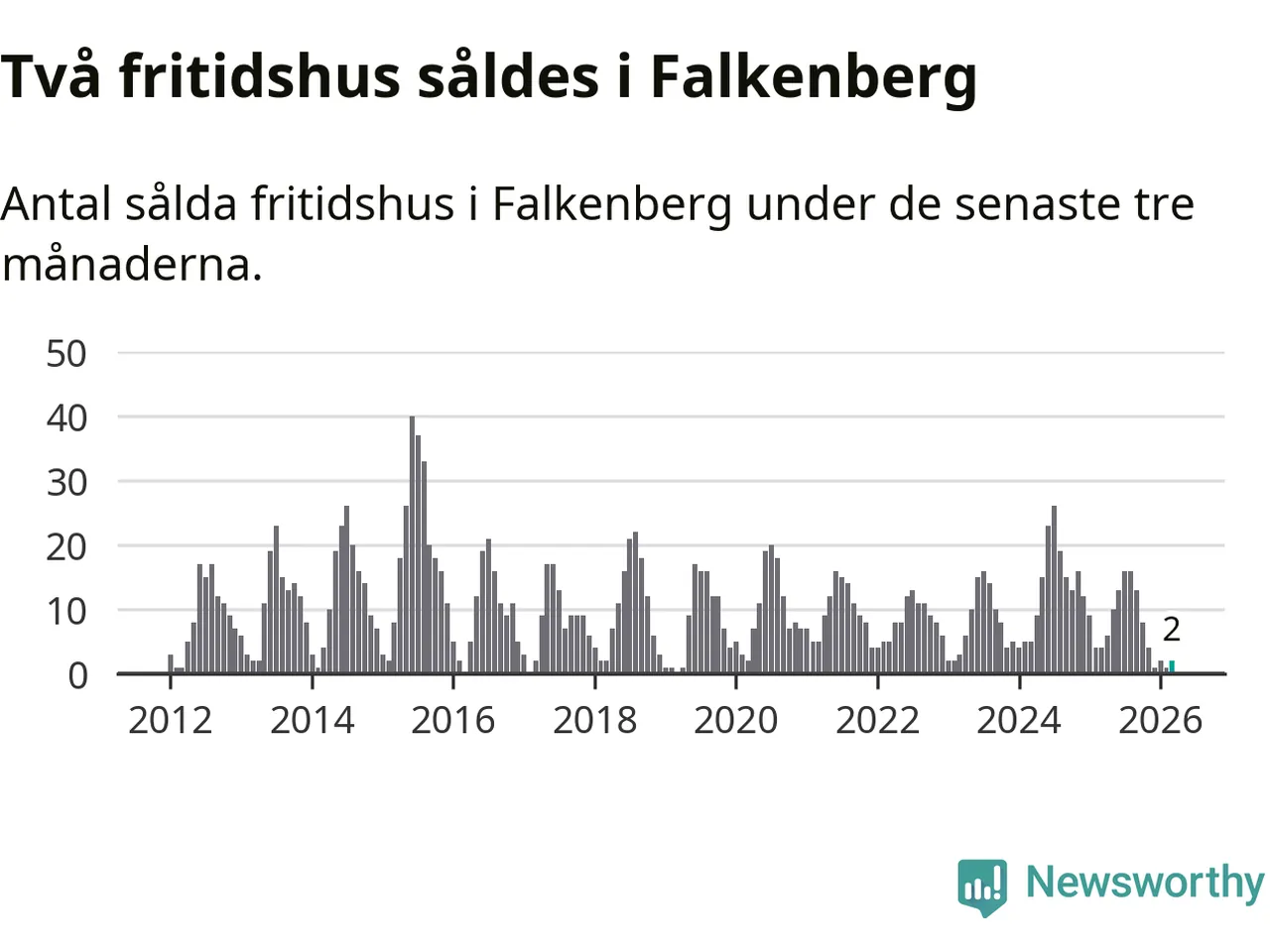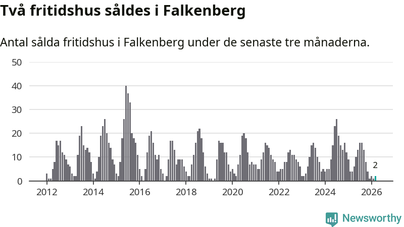 Sammanlagt såldes två fritidshus i Falkenbergs kommun mellan januari och mars till ett genomsnittligt pris på 3,5 miljoner kronor. I fjol gjordes fyra affärer vid den här tiden på året.