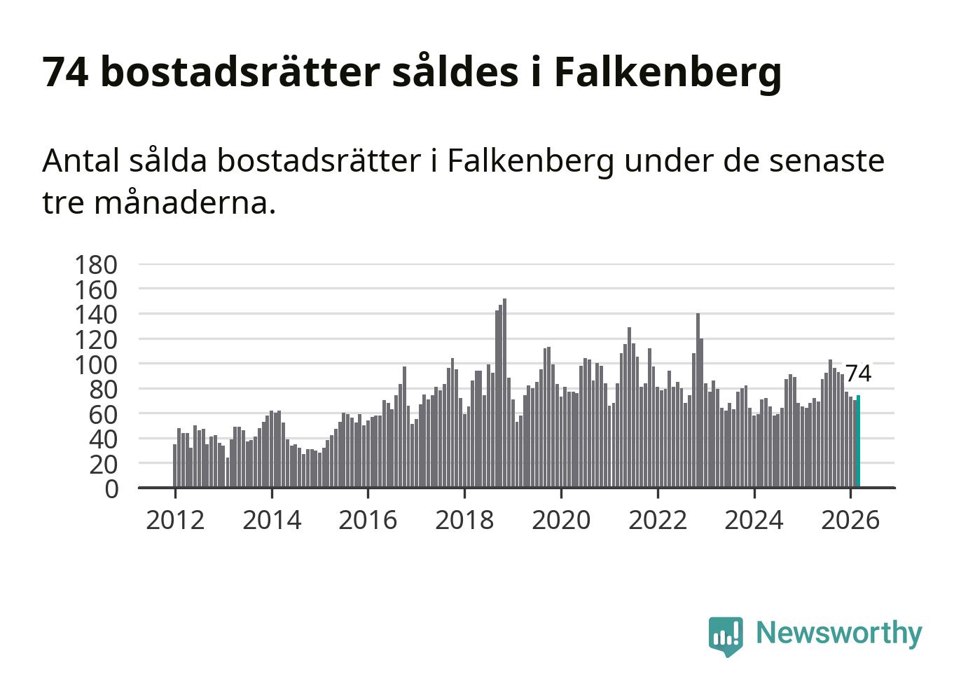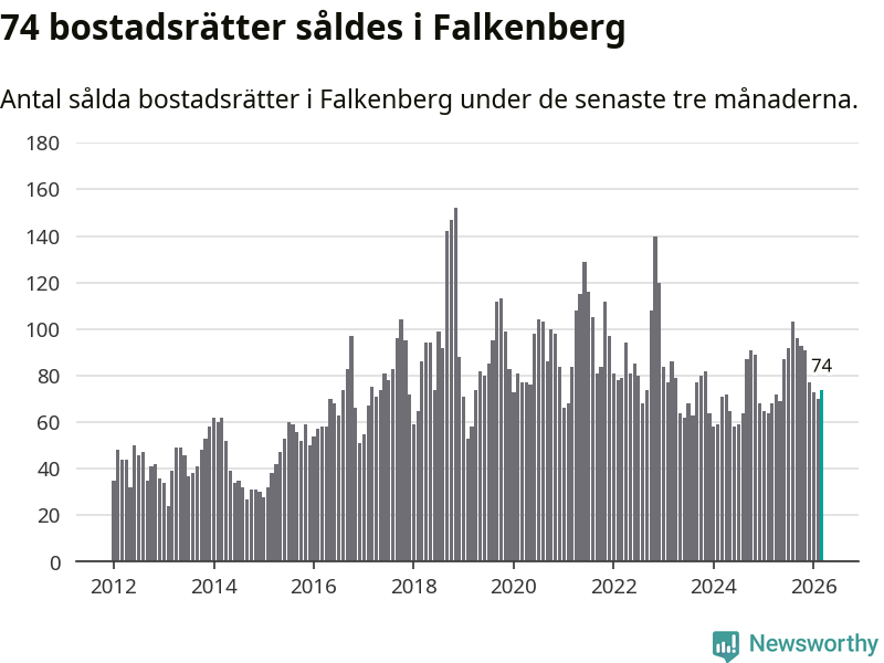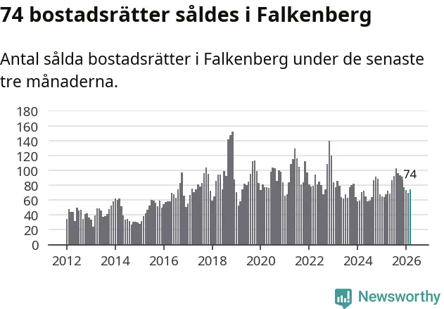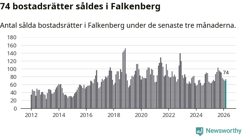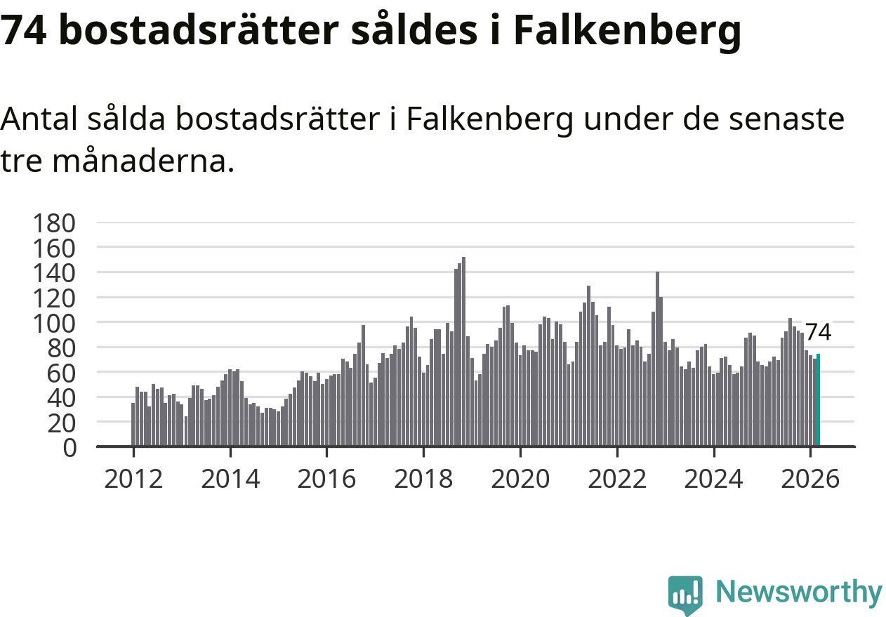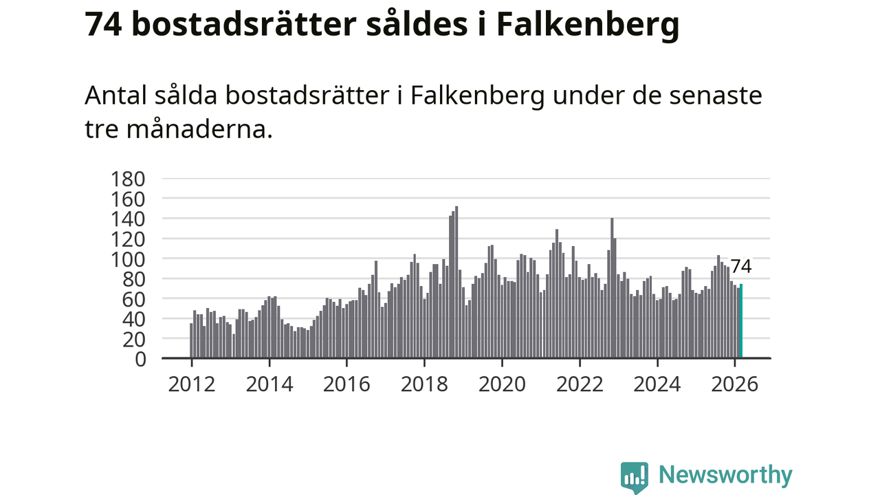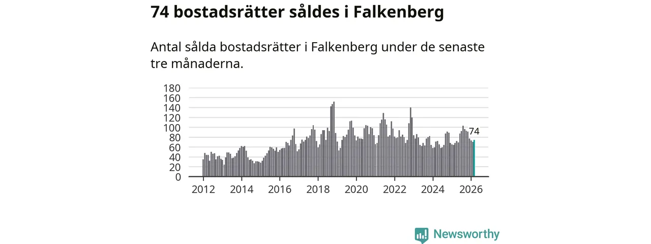 Sammanlagt såldes 74 bostadsrätter i Falkenbergs kommun mellan januari och mars till ett genomsnittligt pris på 1,7 miljoner kronor. I fjol gjordes 68 affärer vid den här tiden på året.