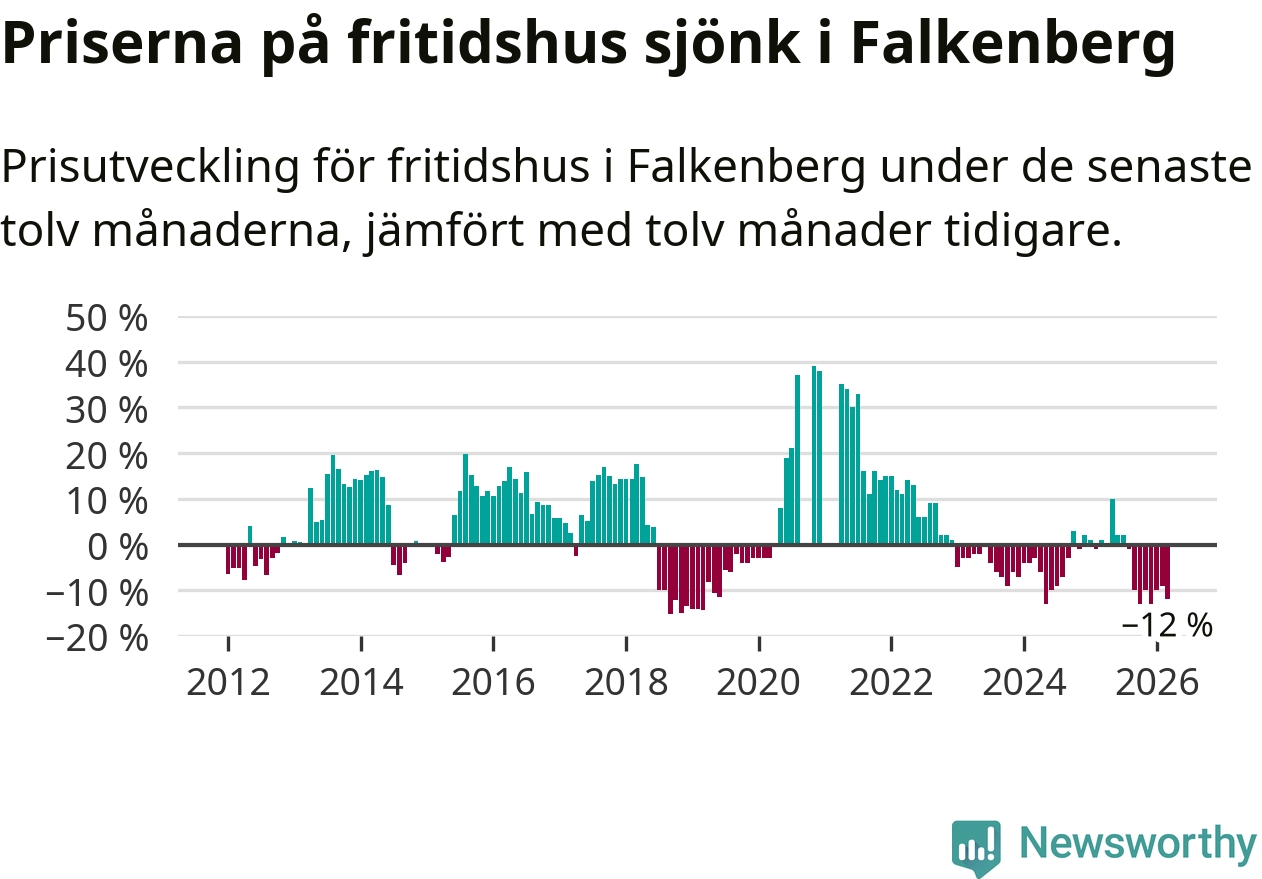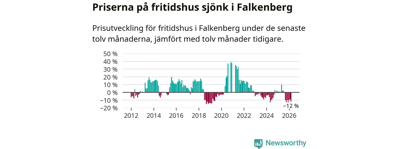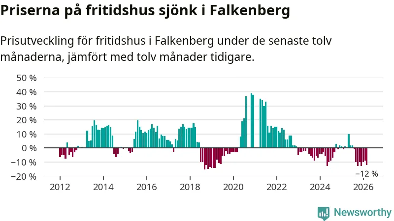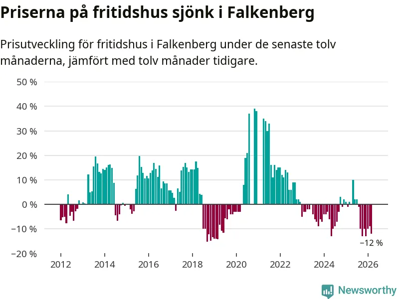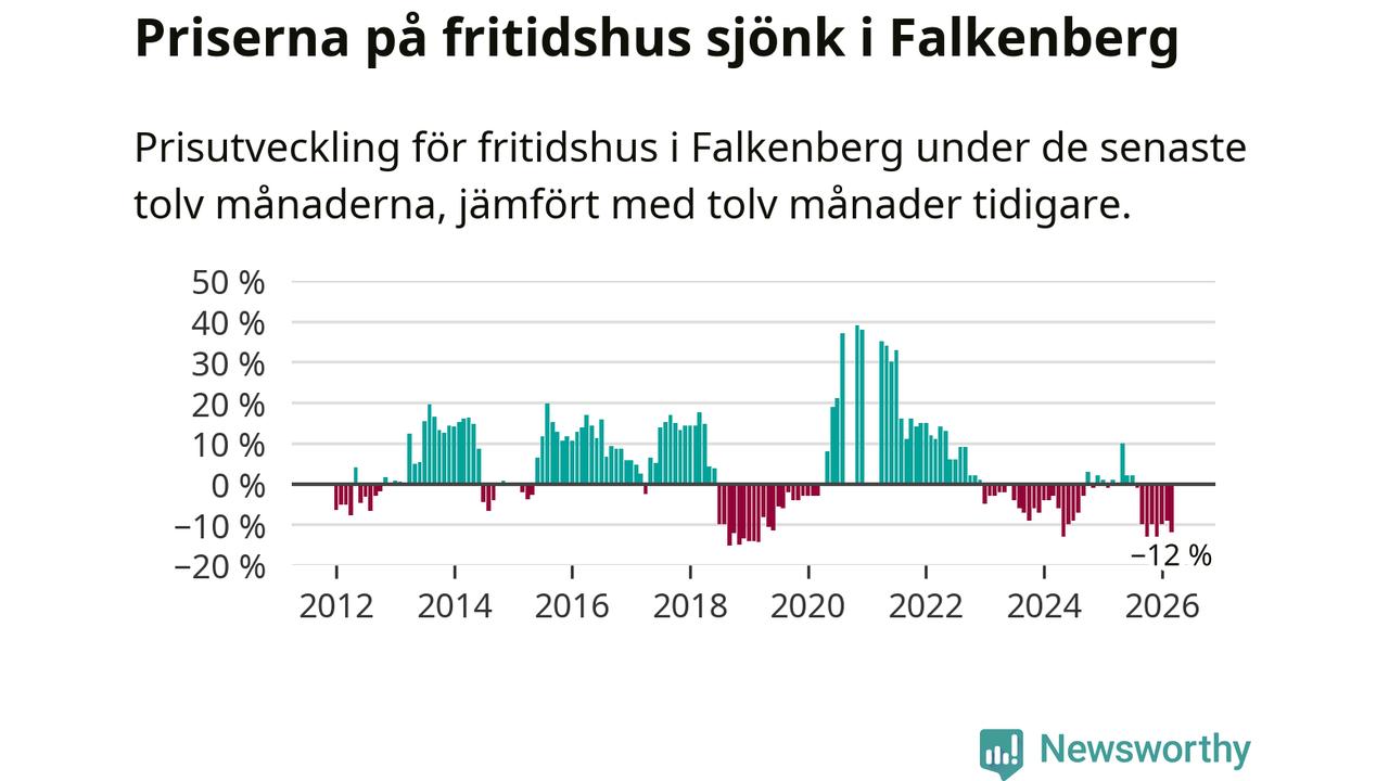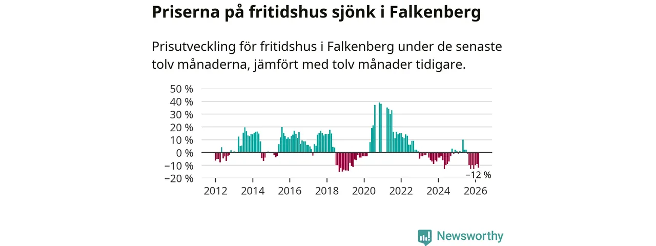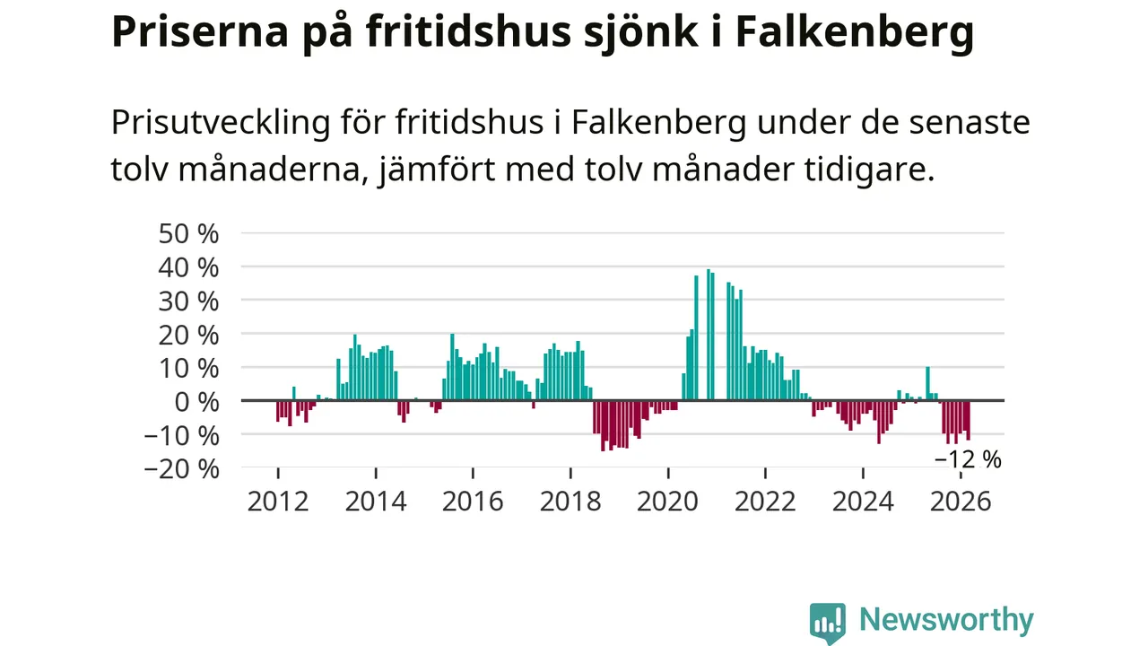 Priserna på fritidshus har gått ner i Falkenbergs kommun. Medelpriset på försäljningarna under de senaste tolv månaderna visar på en nedgång med 12 procent.