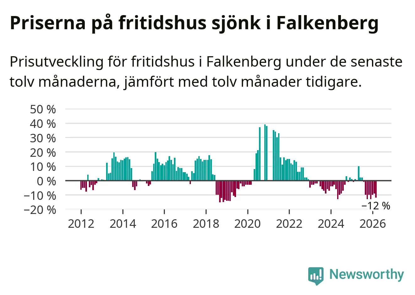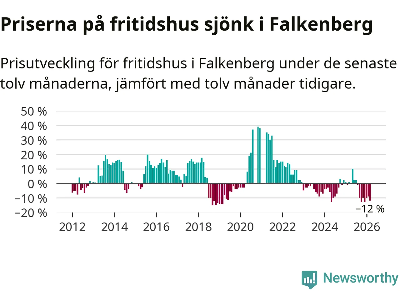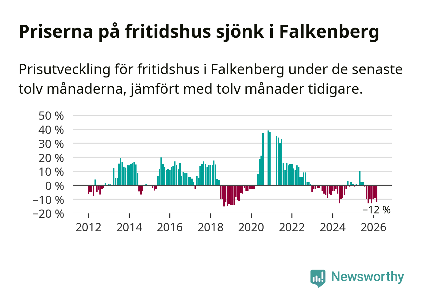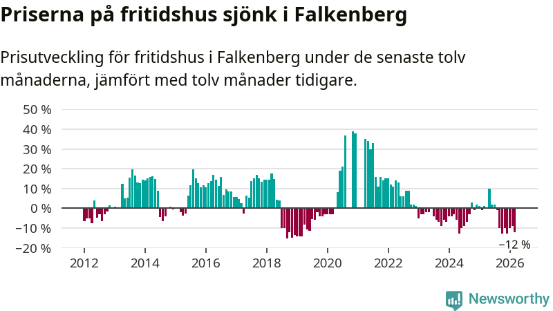 Priserna på fritidshus har gått ner i Falkenbergs kommun. Medelpriset på försäljningarna under de senaste tolv månaderna visar på en nedgång med 12 procent.