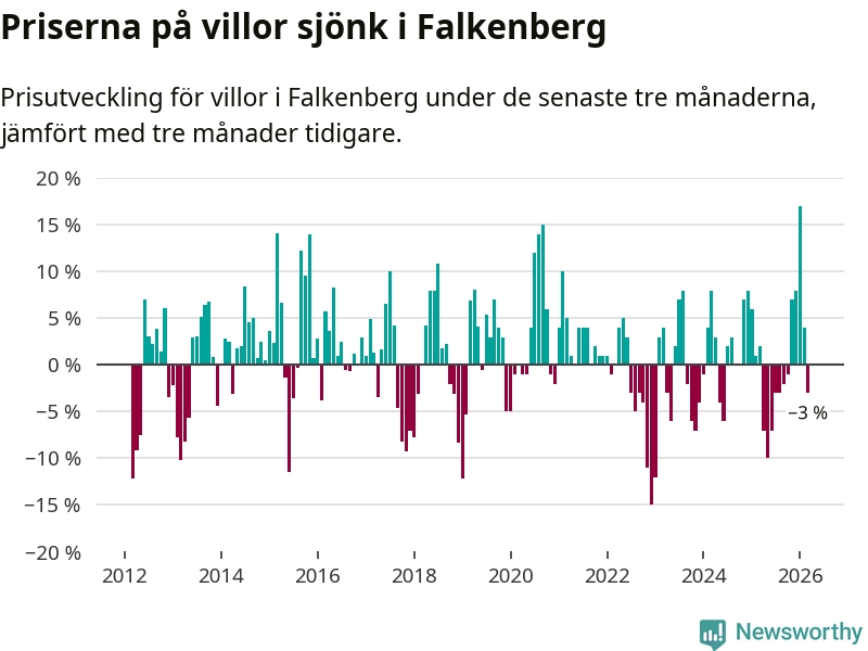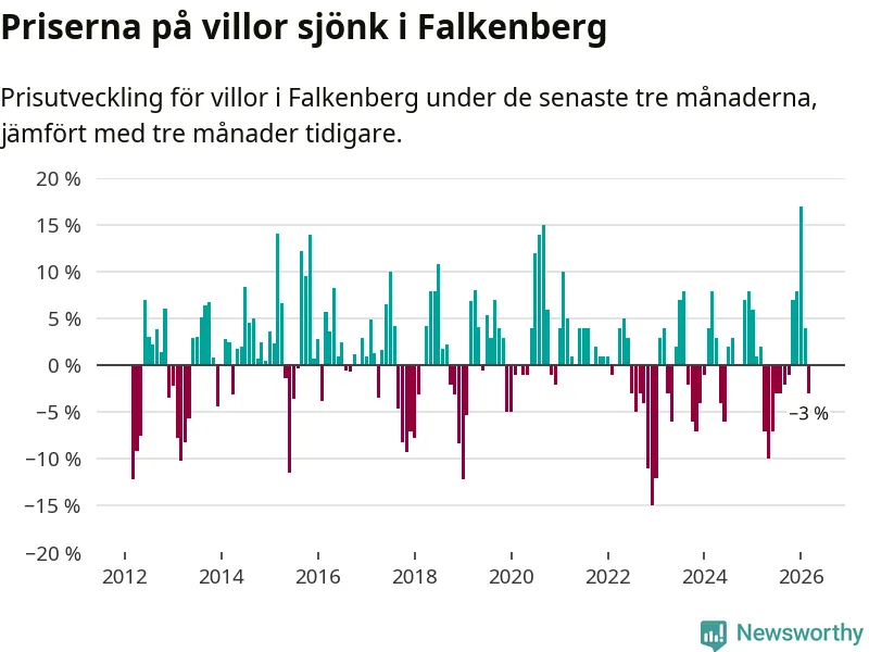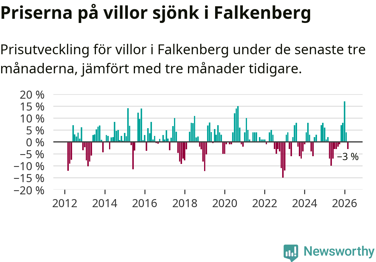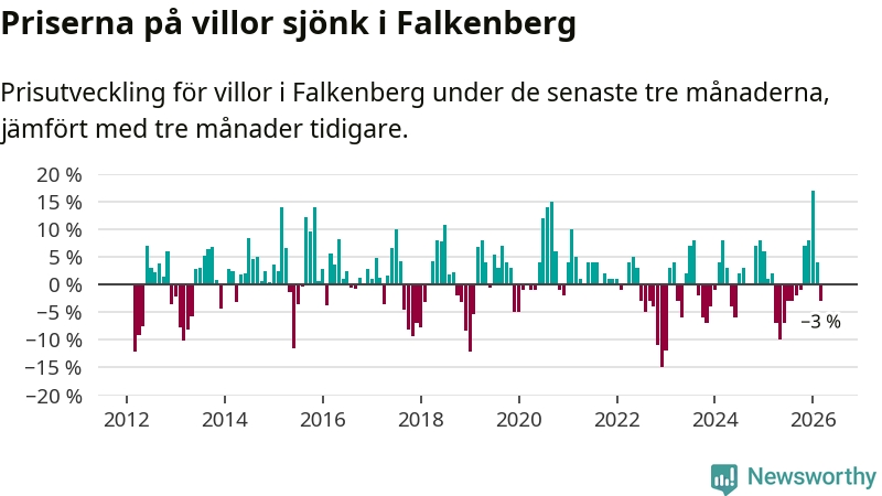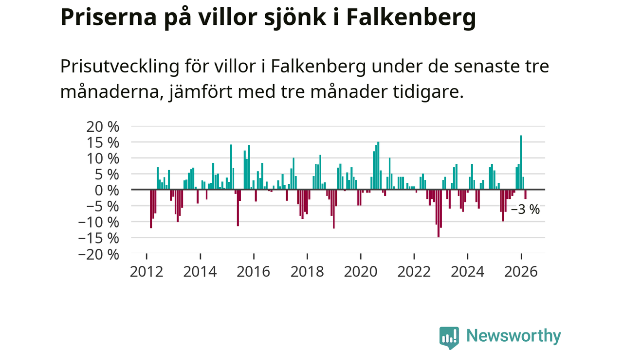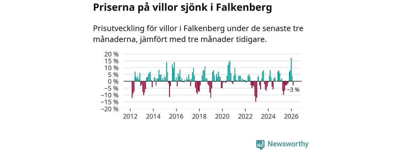 Statistiken visar även på en prisnedgång i Falkenbergs kommun. Medelpriset på försäljningarna av villor i kommunen var 3 procent lägre än för tre månader sedan. I hela Halland däremot ökar villapriserna. I hela länet noterades en prisuppgång på 1 procent.