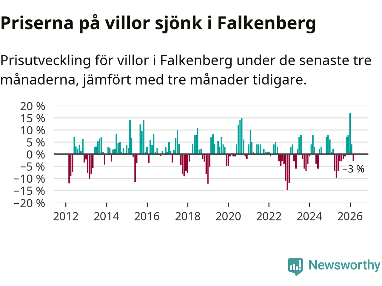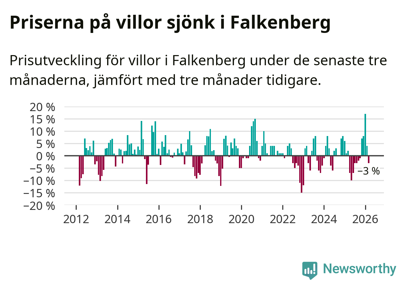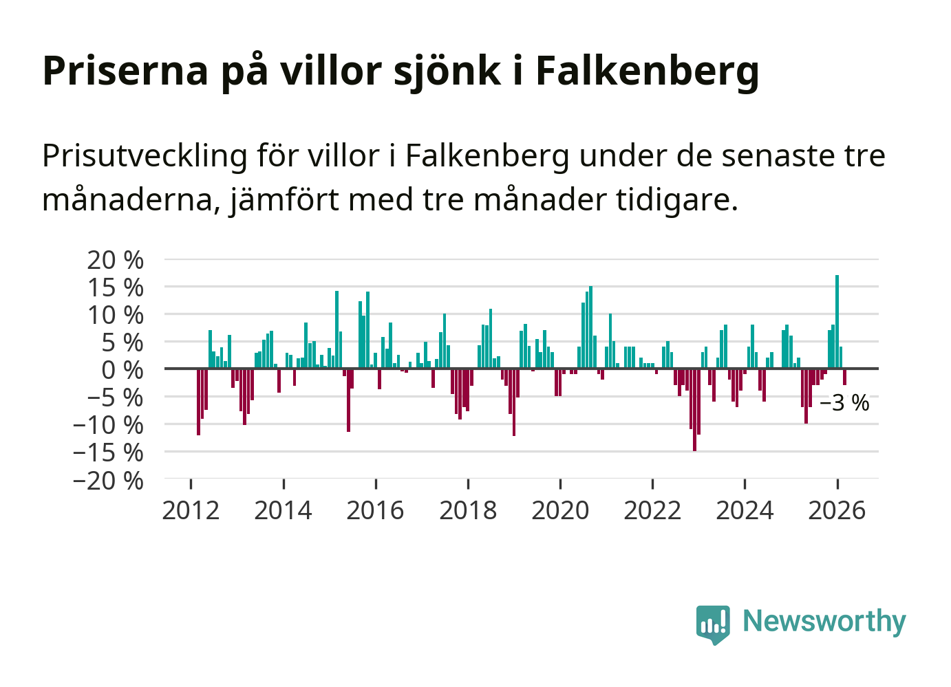 Statistiken visar även på en prisnedgång i Falkenbergs kommun. Medelpriset på försäljningarna av villor i kommunen var 3 procent lägre än för tre månader sedan. I hela Halland däremot ökar villapriserna. I hela länet noterades en prisuppgång på 1 procent.