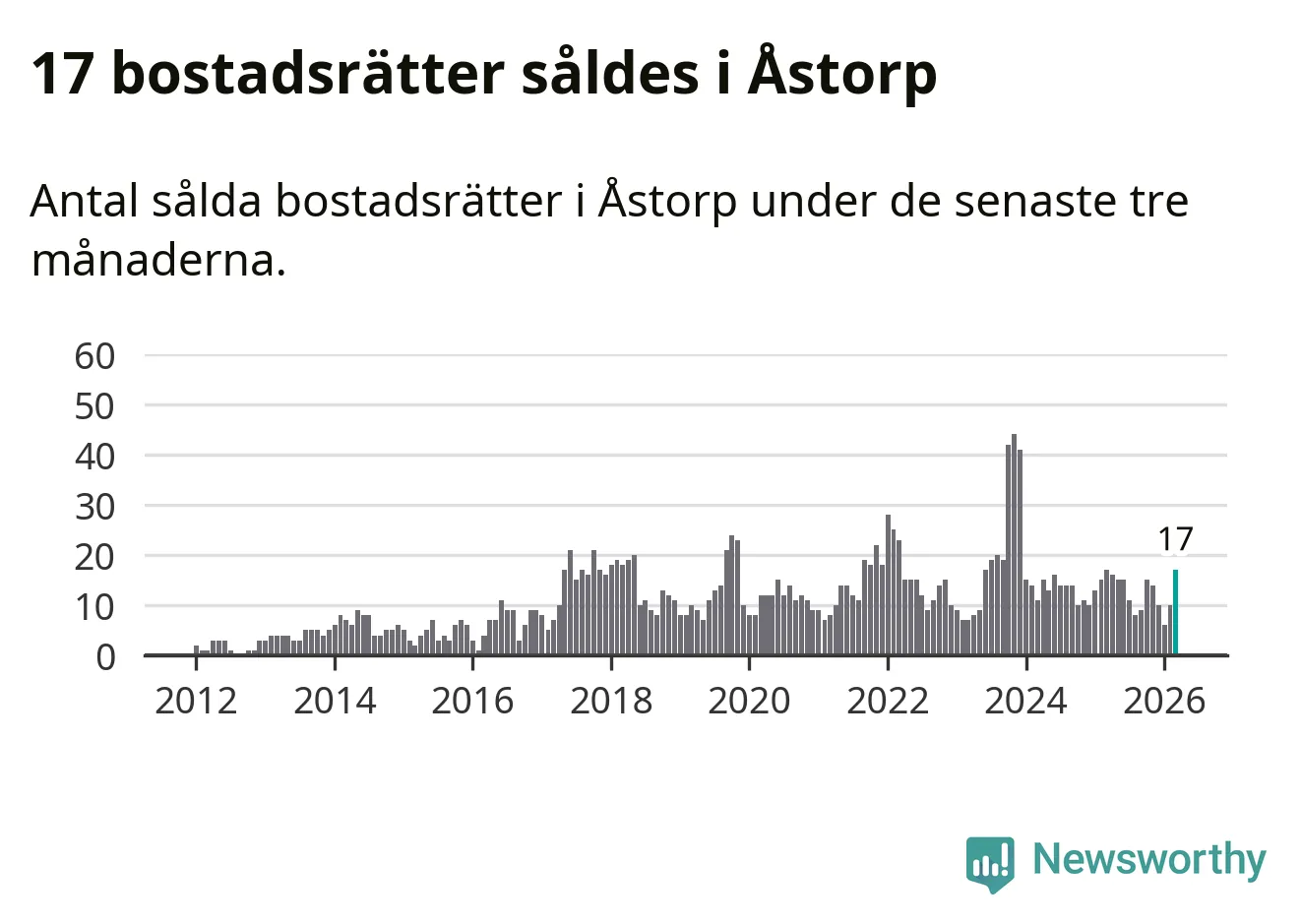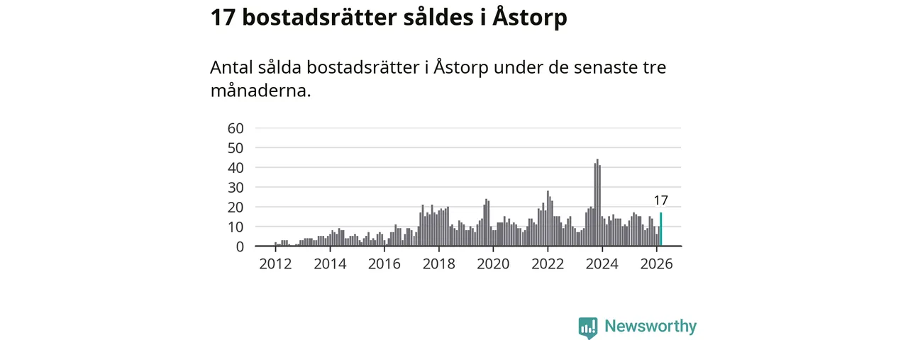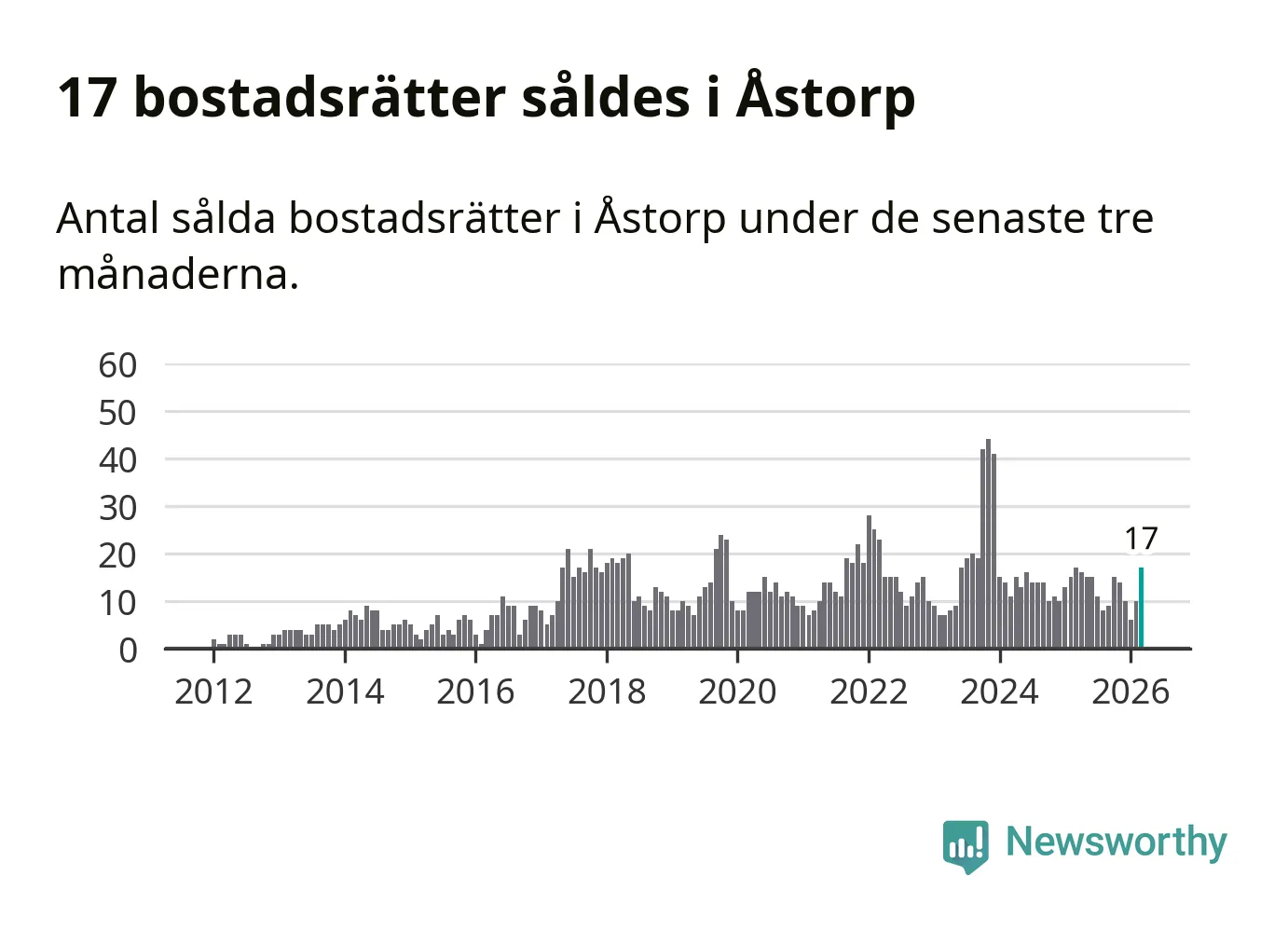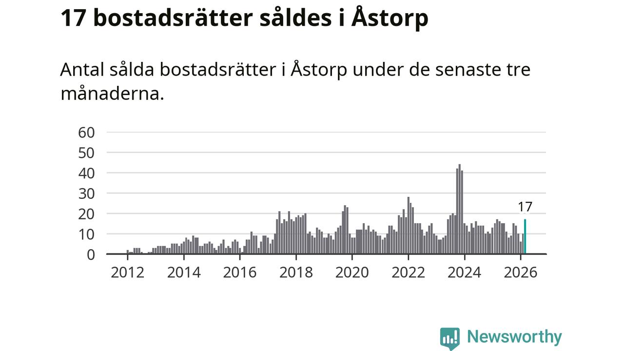 Mellan januari och mars gjordes sammanlagt 17 affärer med bostadsrätter i Åstorps kommun. Det är lika många affärer som vid motsvarande tid i fjol.