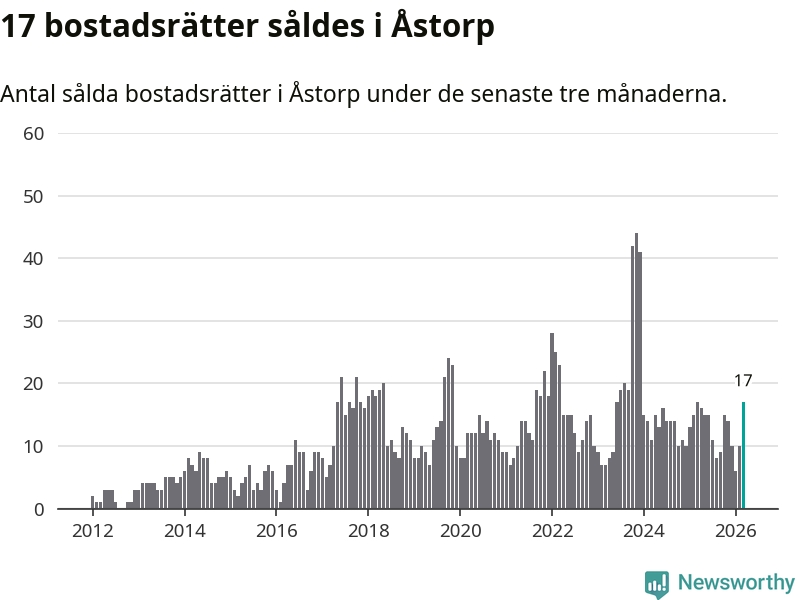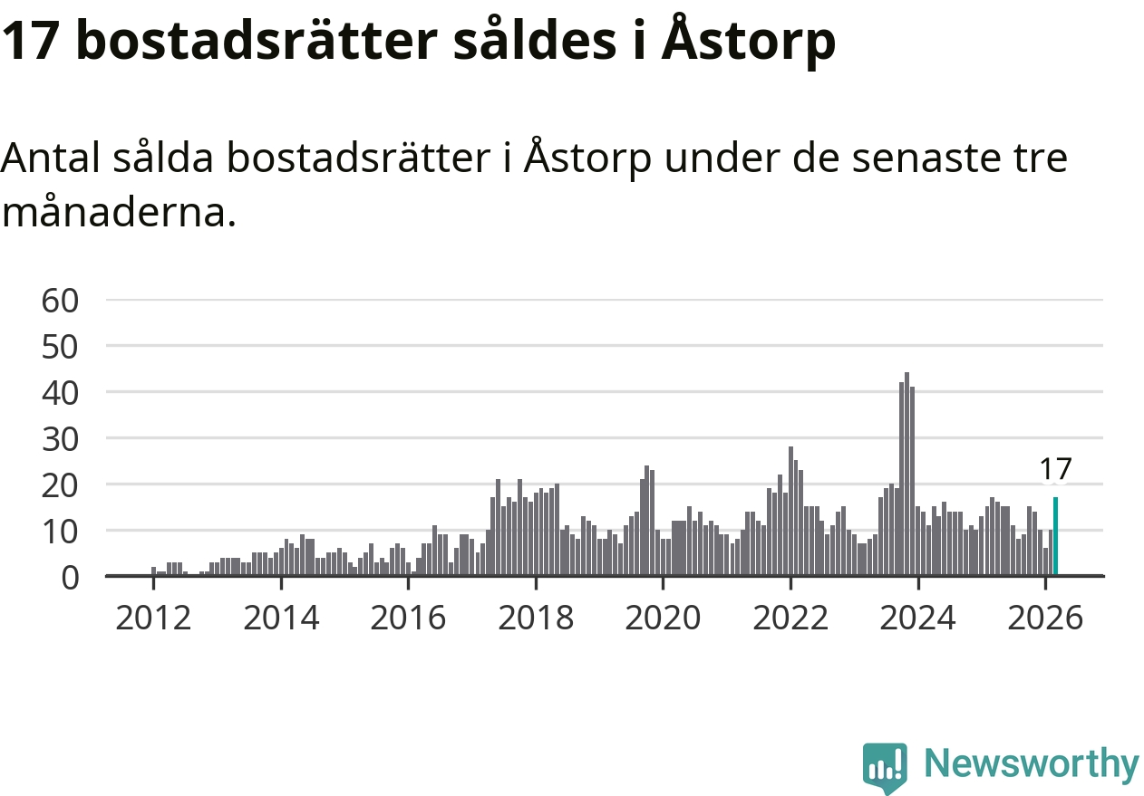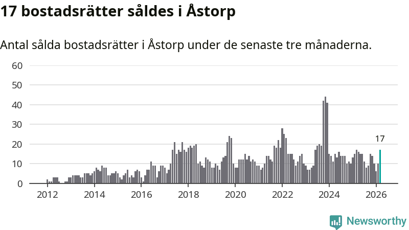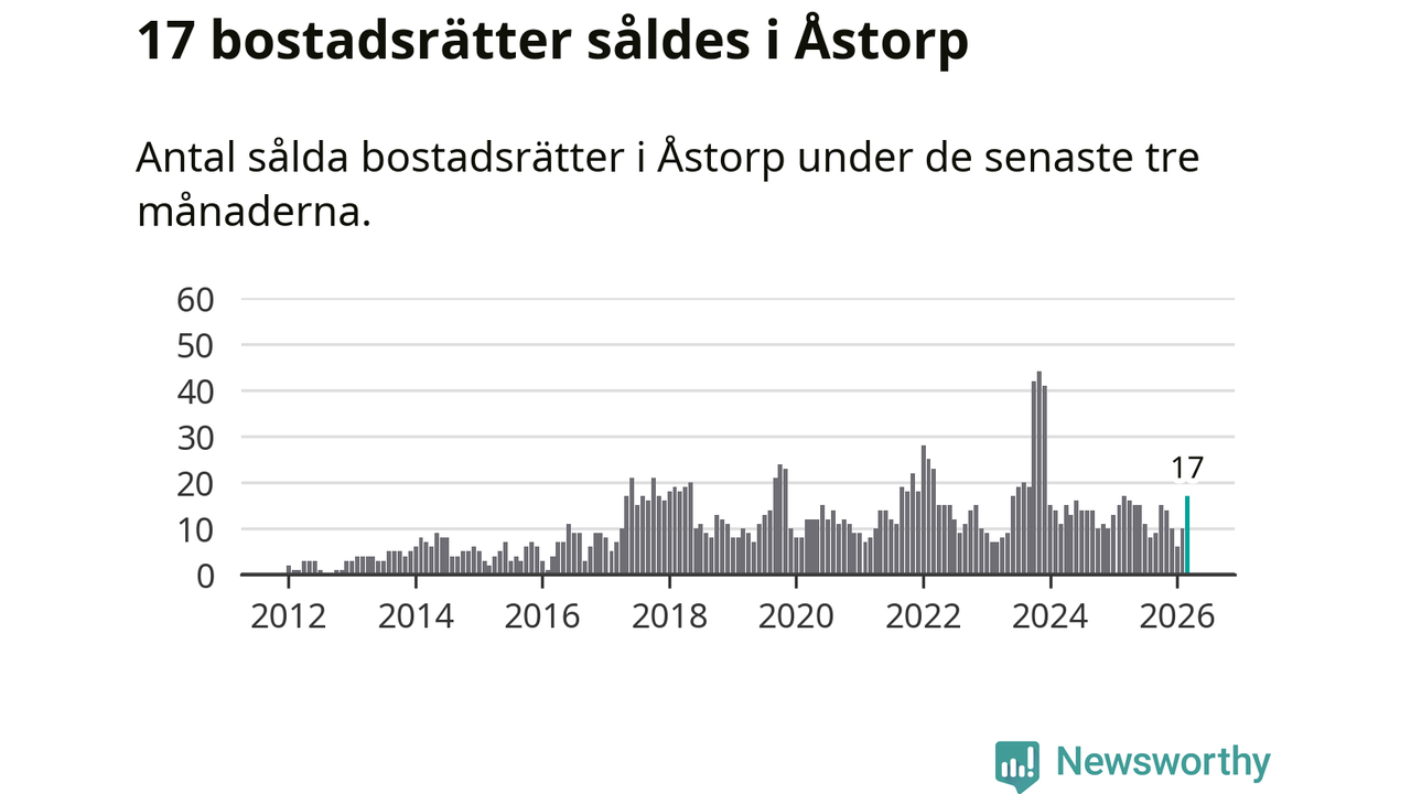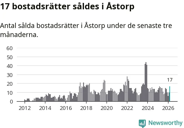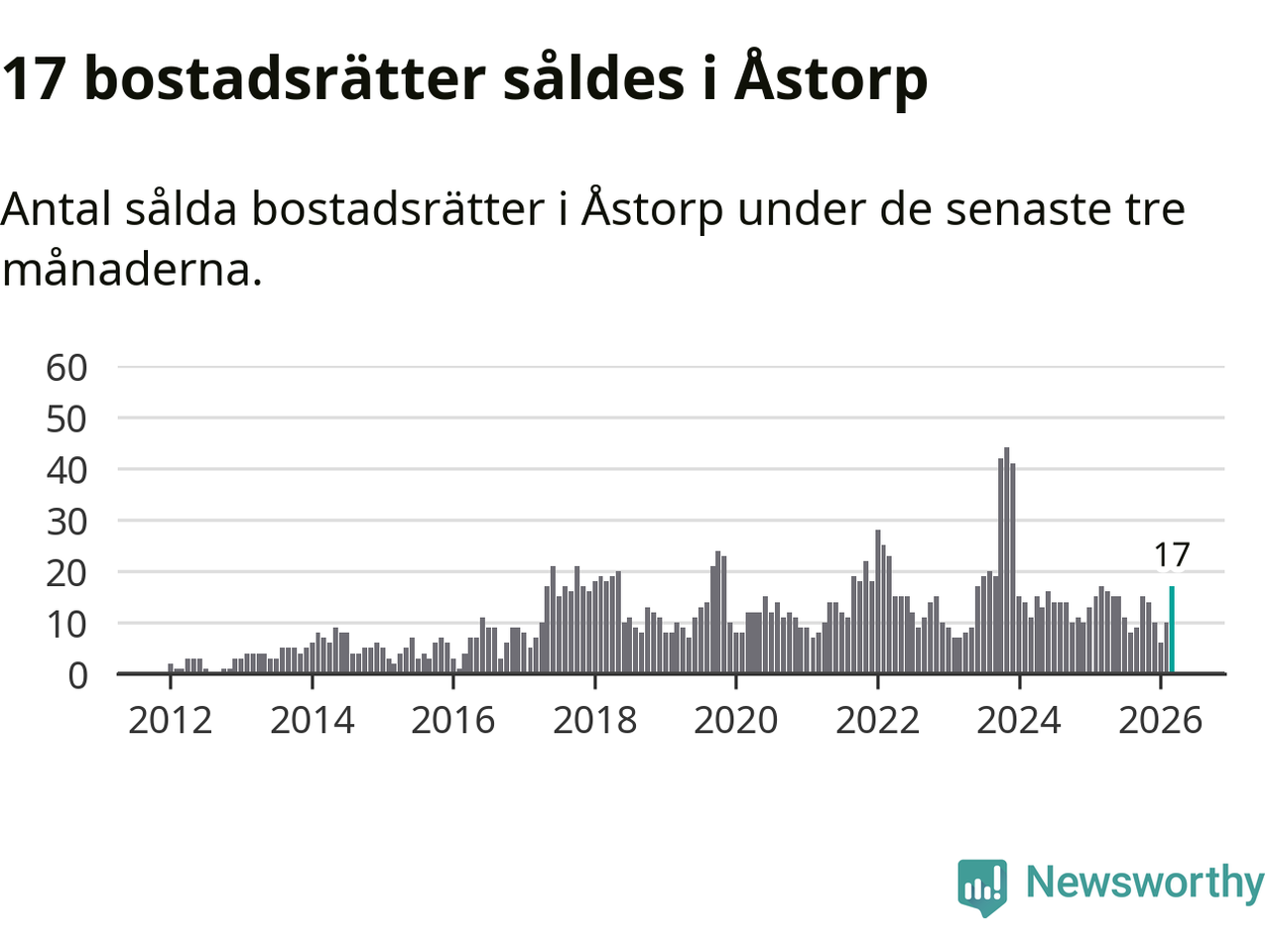 Mellan januari och mars gjordes sammanlagt 17 affärer med bostadsrätter i Åstorps kommun. Det är lika många affärer som vid motsvarande tid i fjol.