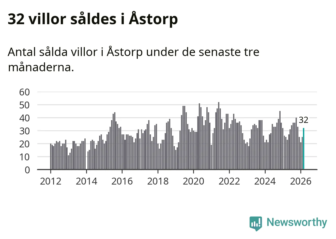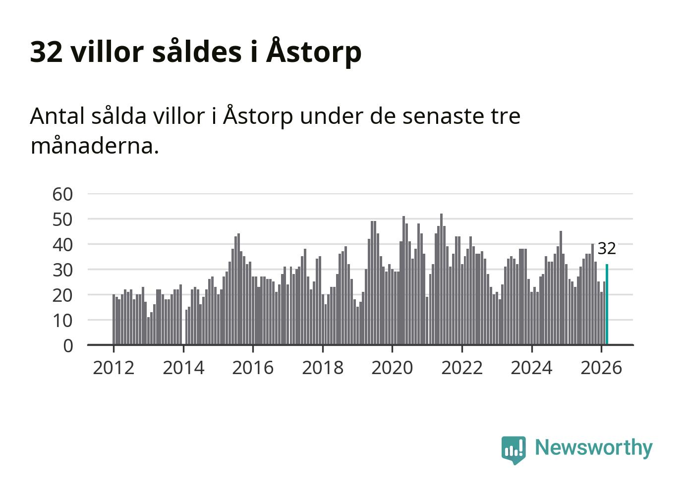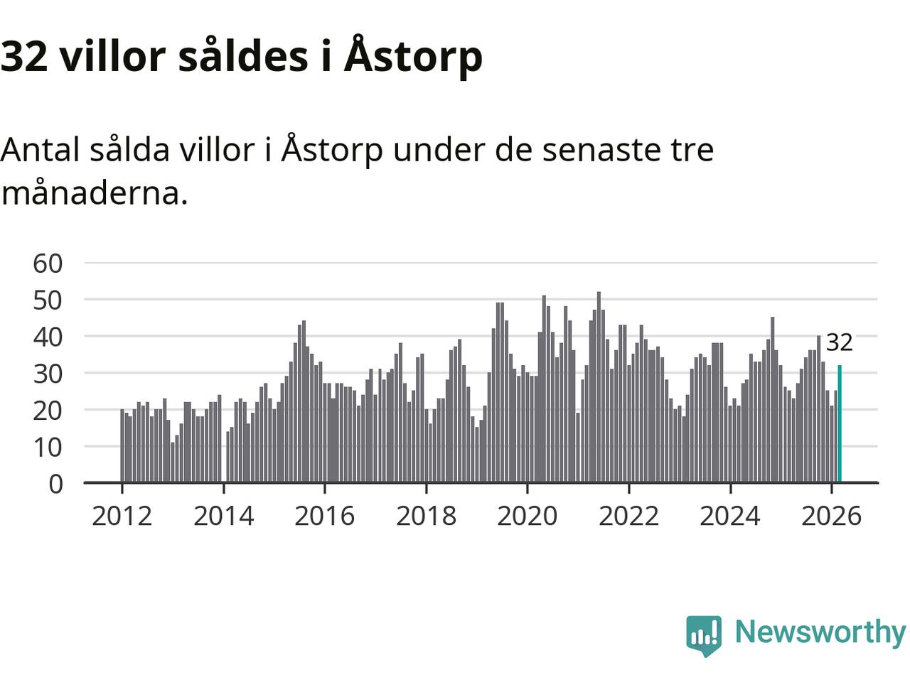 Mellan januari och mars gjordes sammanlagt 32 affärer med villor i Åstorps kommun. Det kan jämföras med 25 vid motsvarande tid i fjol.