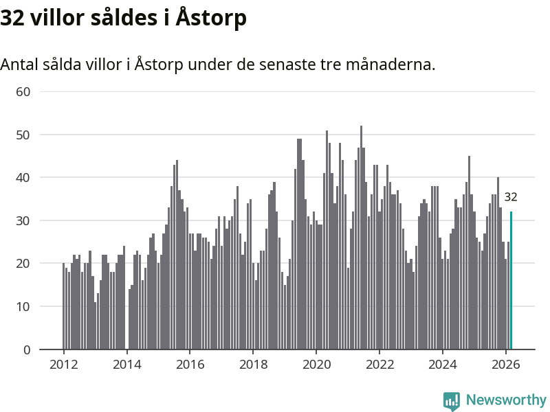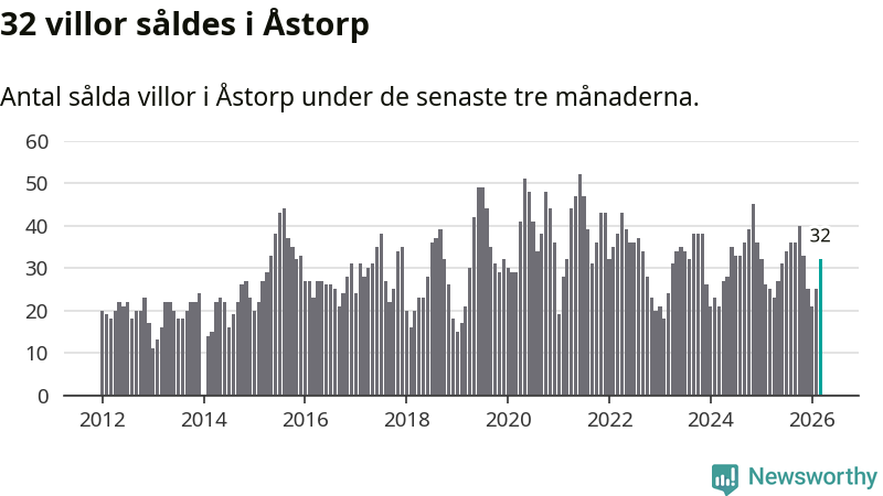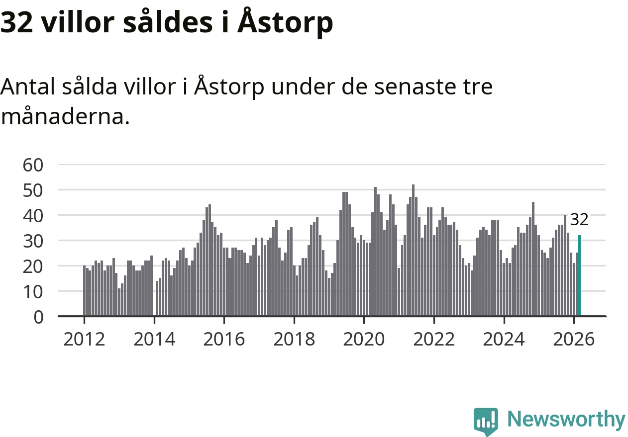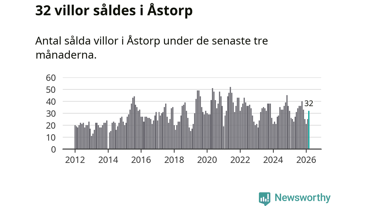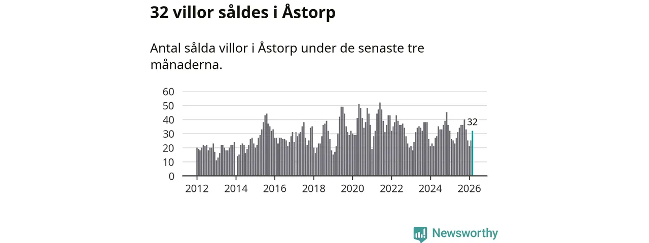 Mellan januari och mars gjordes sammanlagt 32 affärer med villor i Åstorps kommun. Det kan jämföras med 25 vid motsvarande tid i fjol.