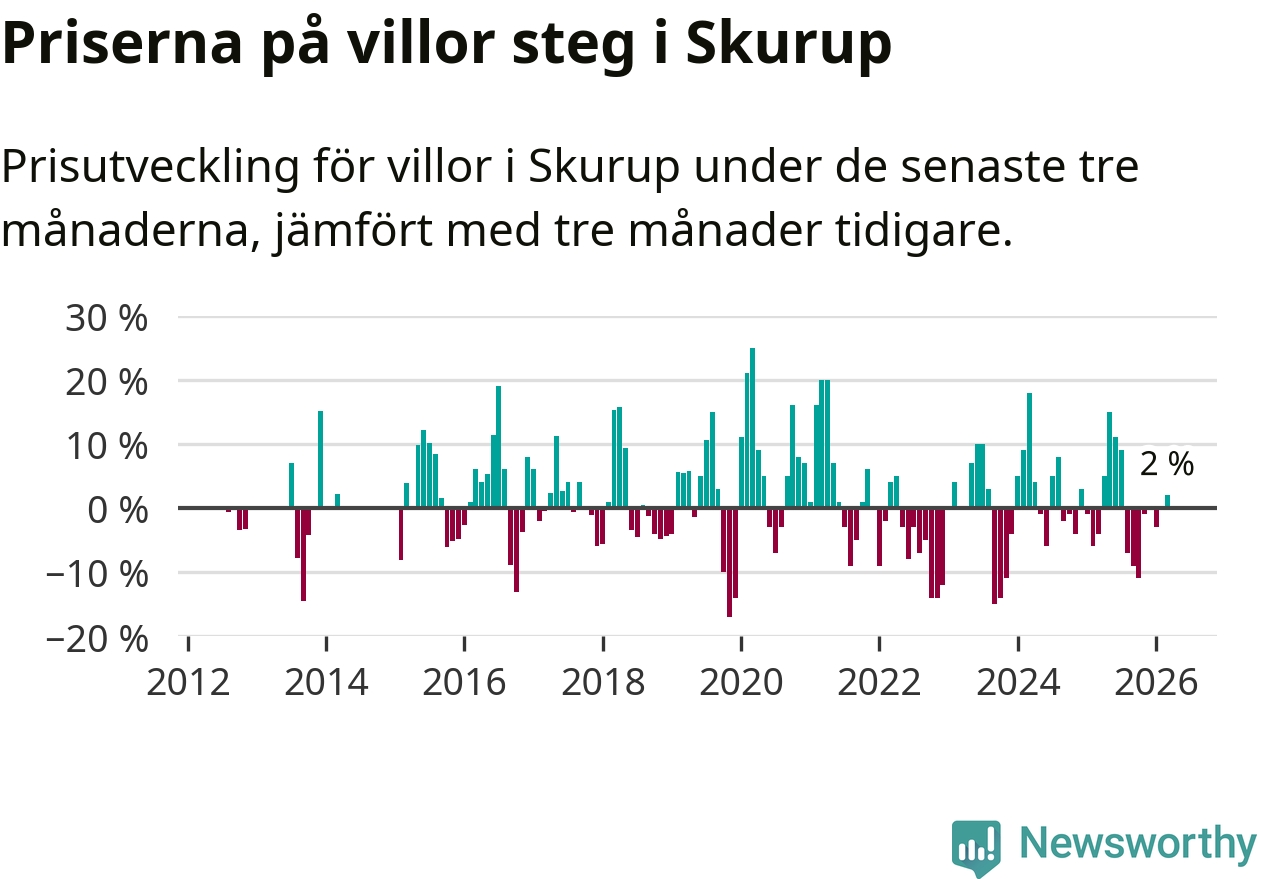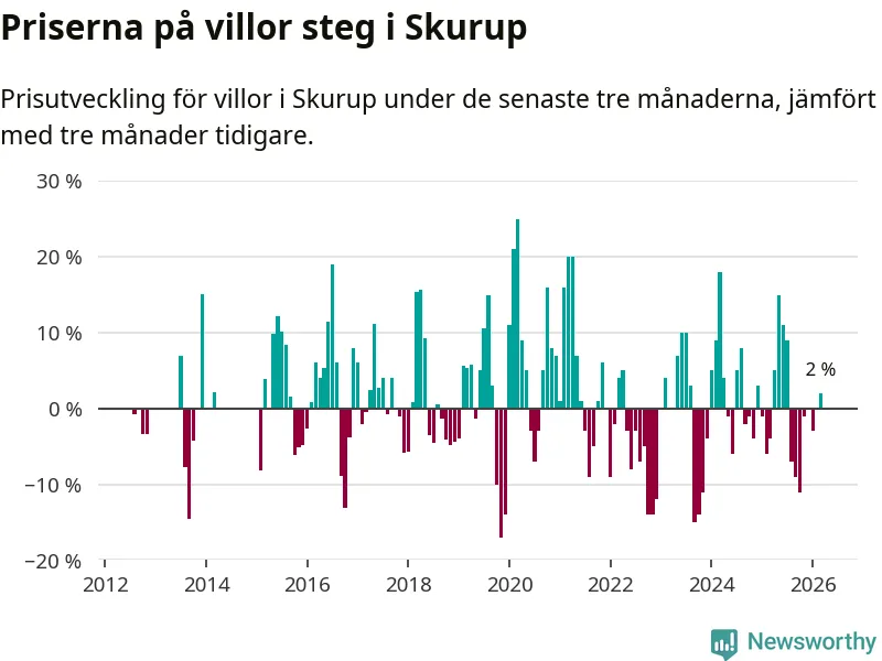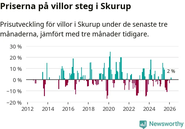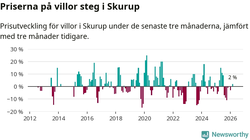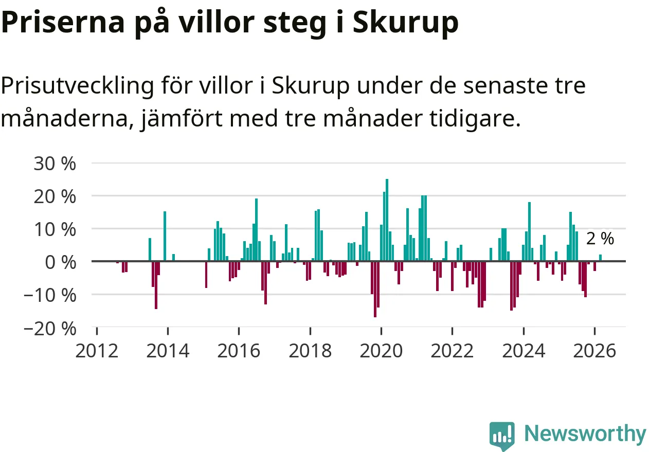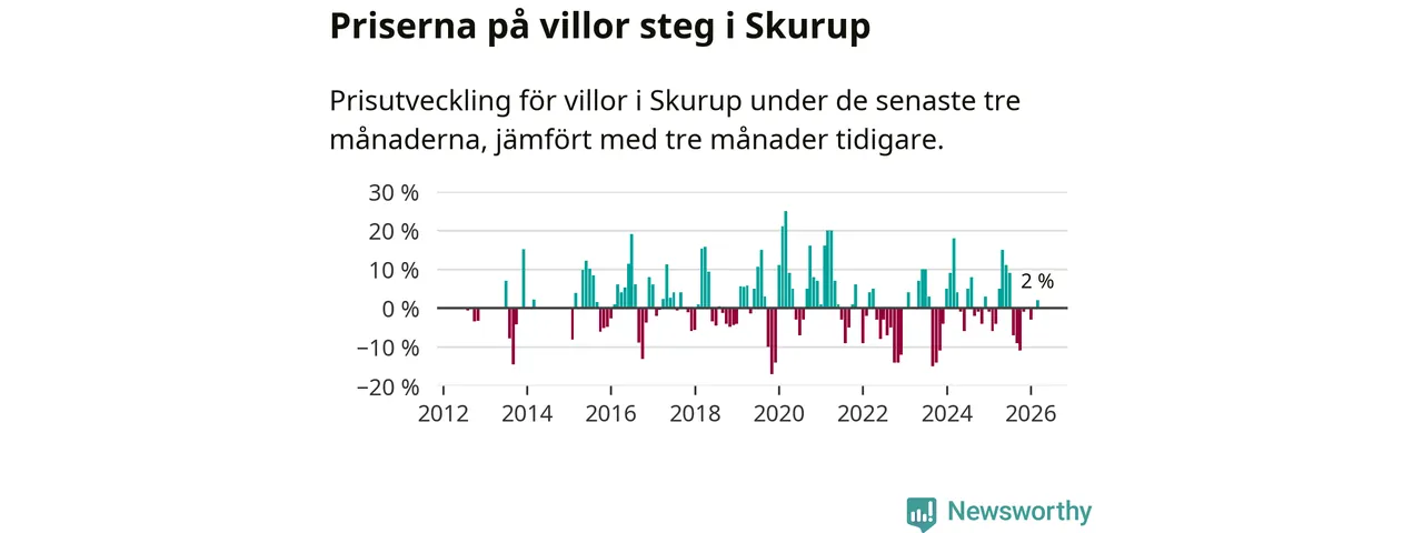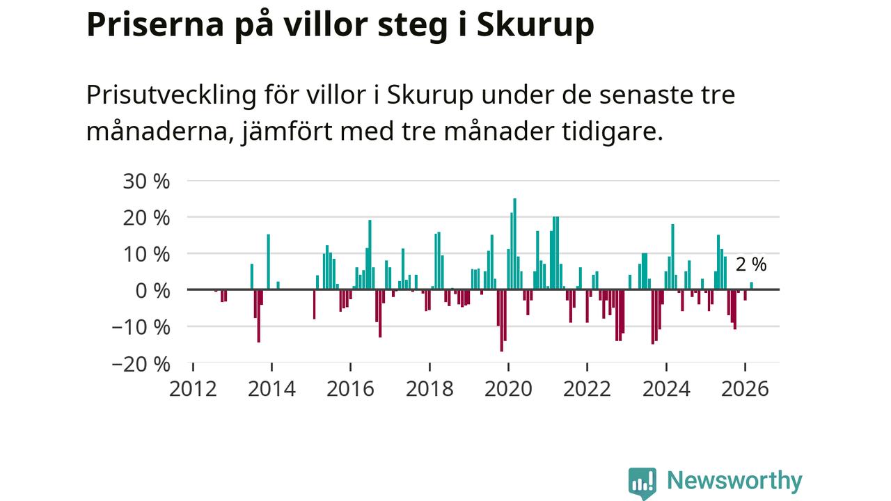 Villapriserna har gått upp i Skurups kommun. Medelpriset på försäljningarna under de senaste tre månaderna visar på en uppgång med 2 procent.