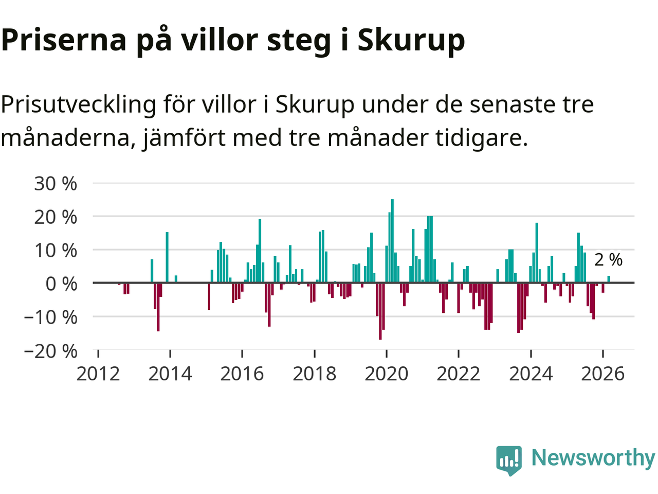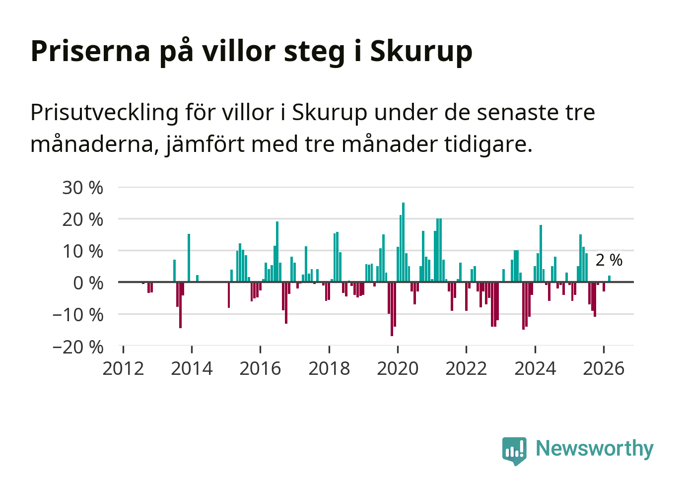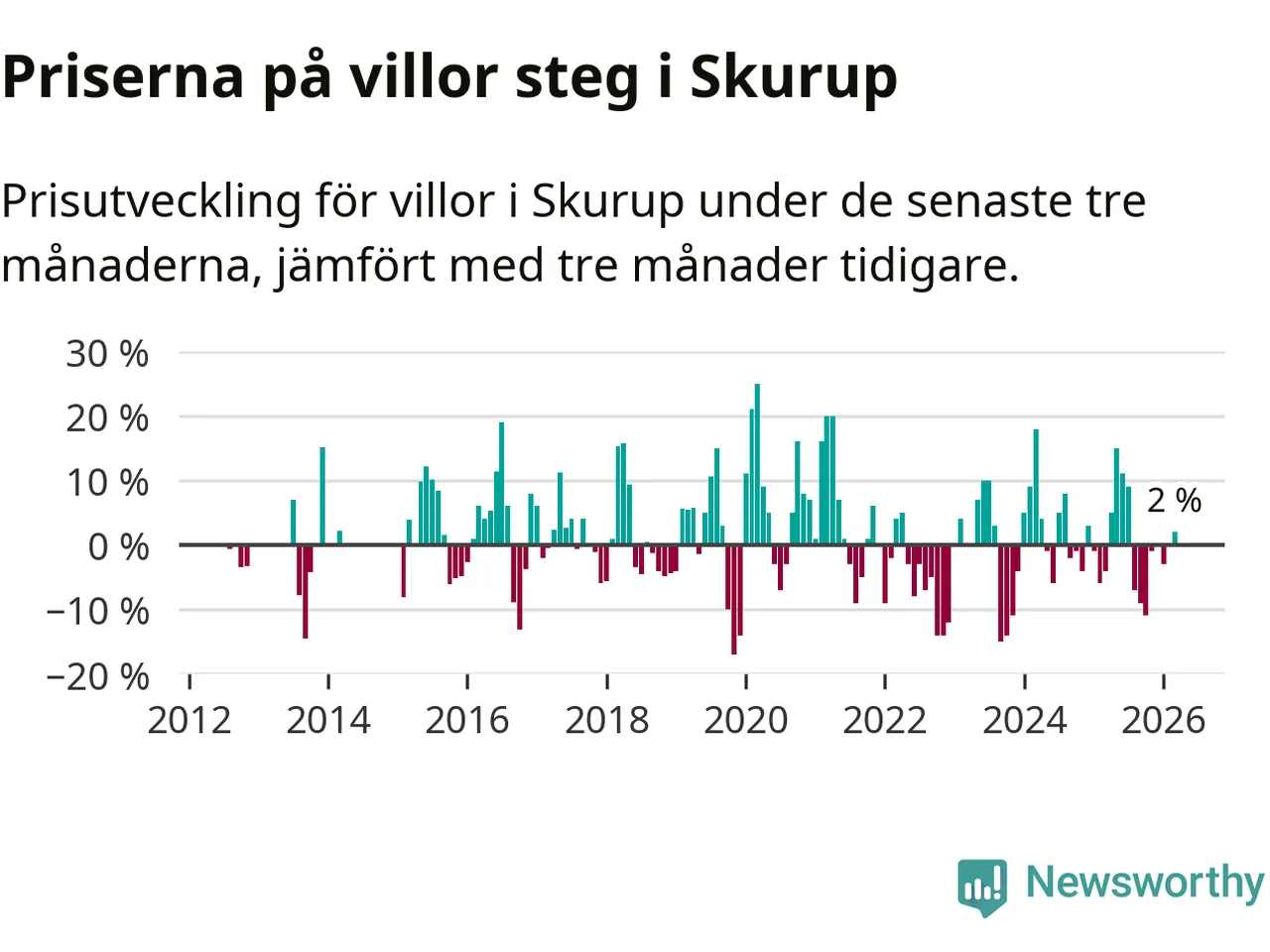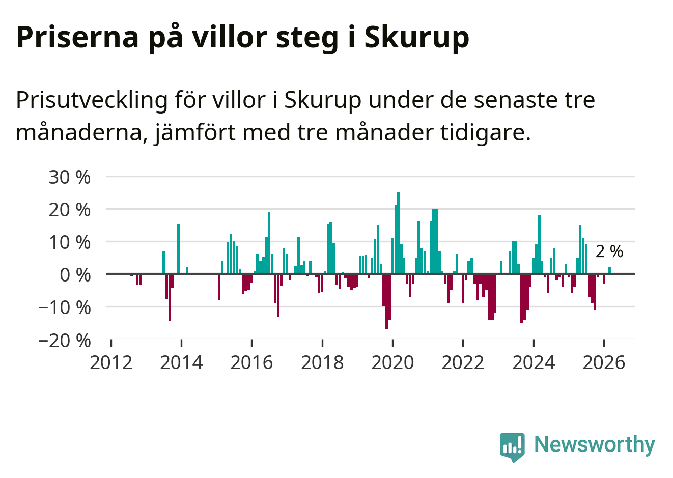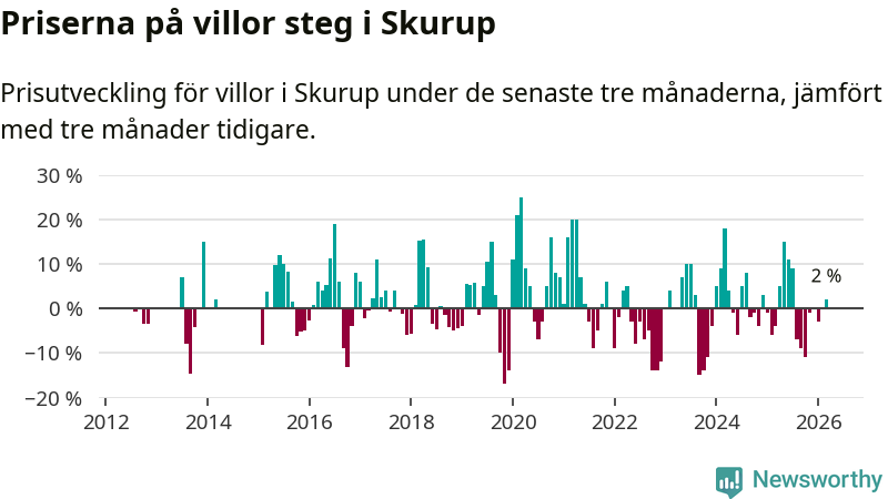 Villapriserna har gått upp i Skurups kommun. Medelpriset på försäljningarna under de senaste tre månaderna visar på en uppgång med 2 procent.