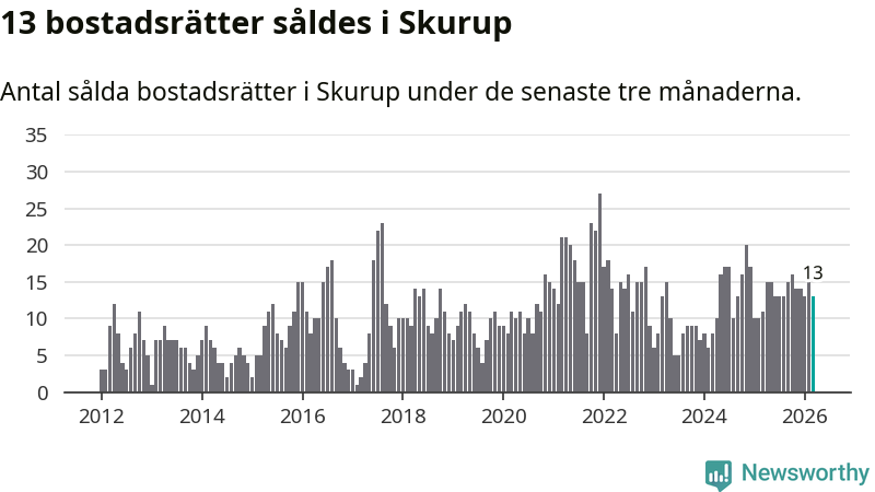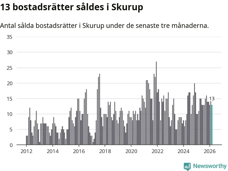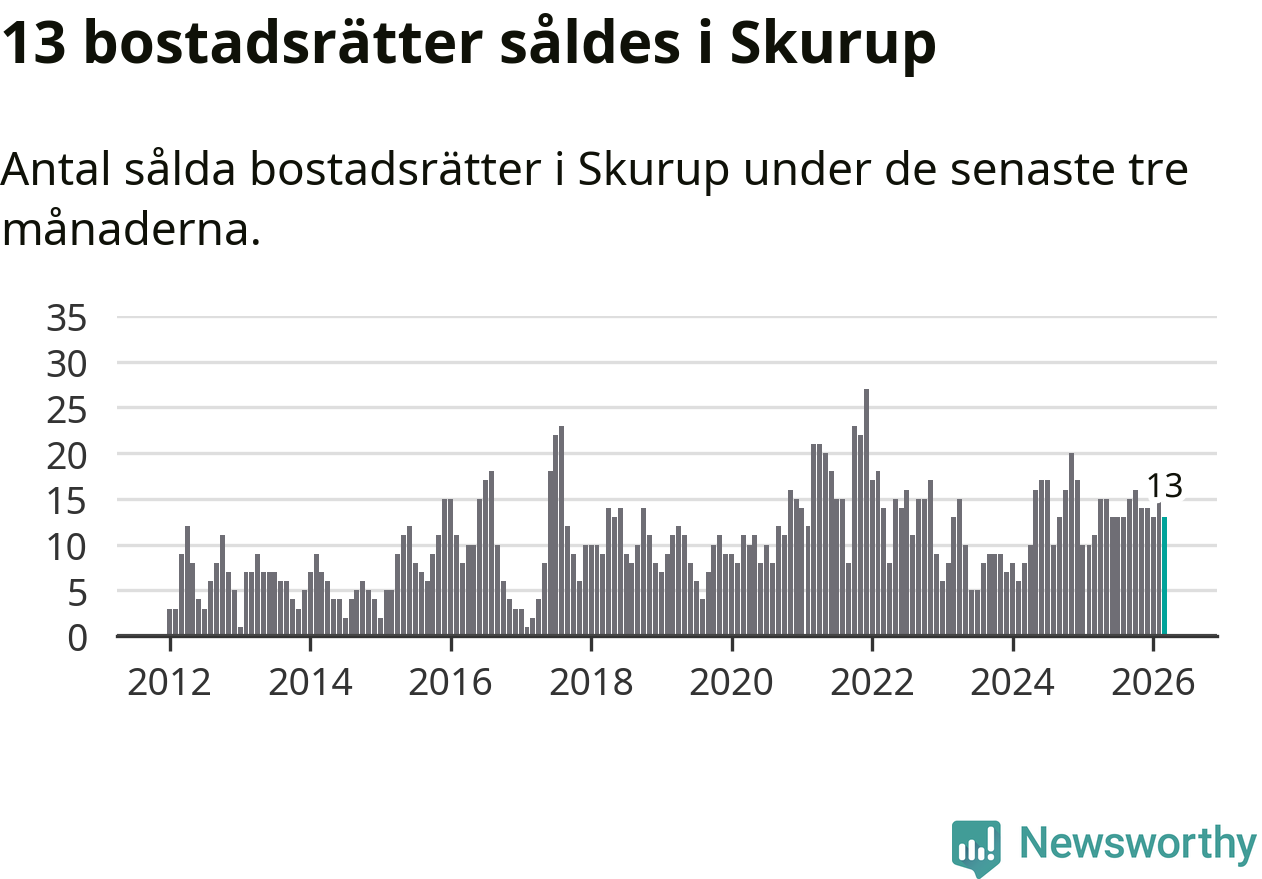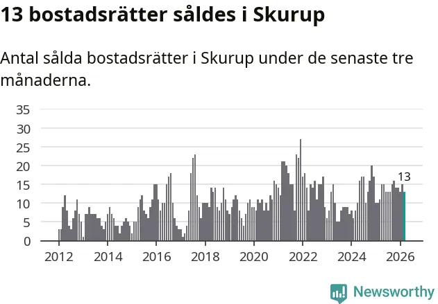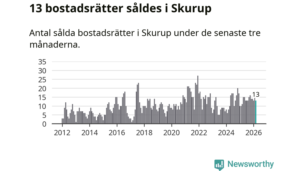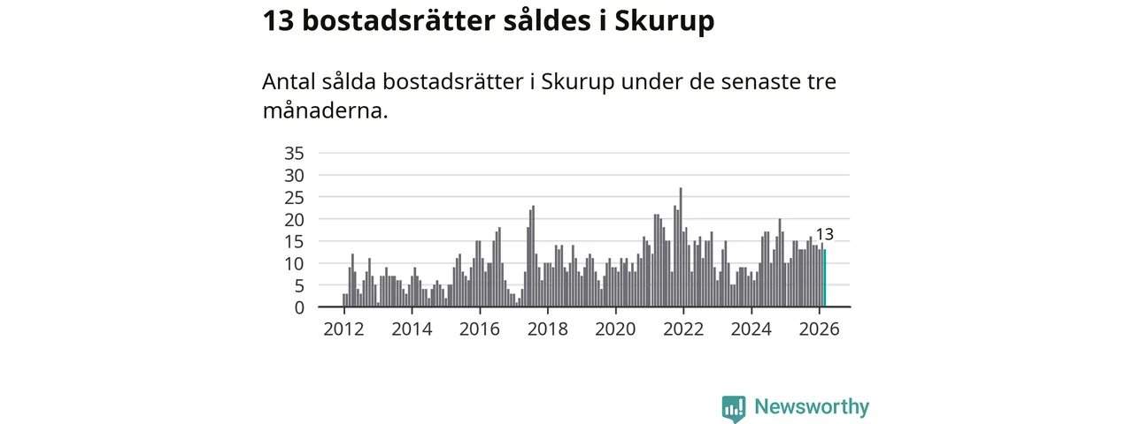 Mellan januari och mars gjordes sammanlagt 13 affärer med bostadsrätter i Skurups kommun. Det kan jämföras med elva vid motsvarande tid i fjol.