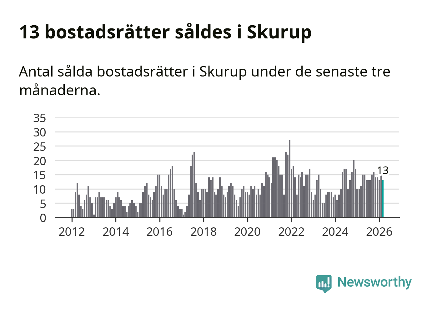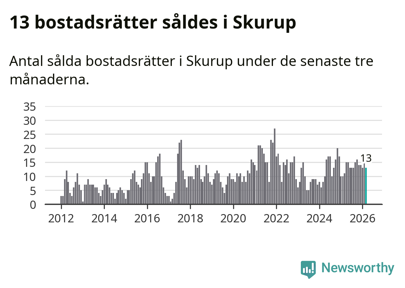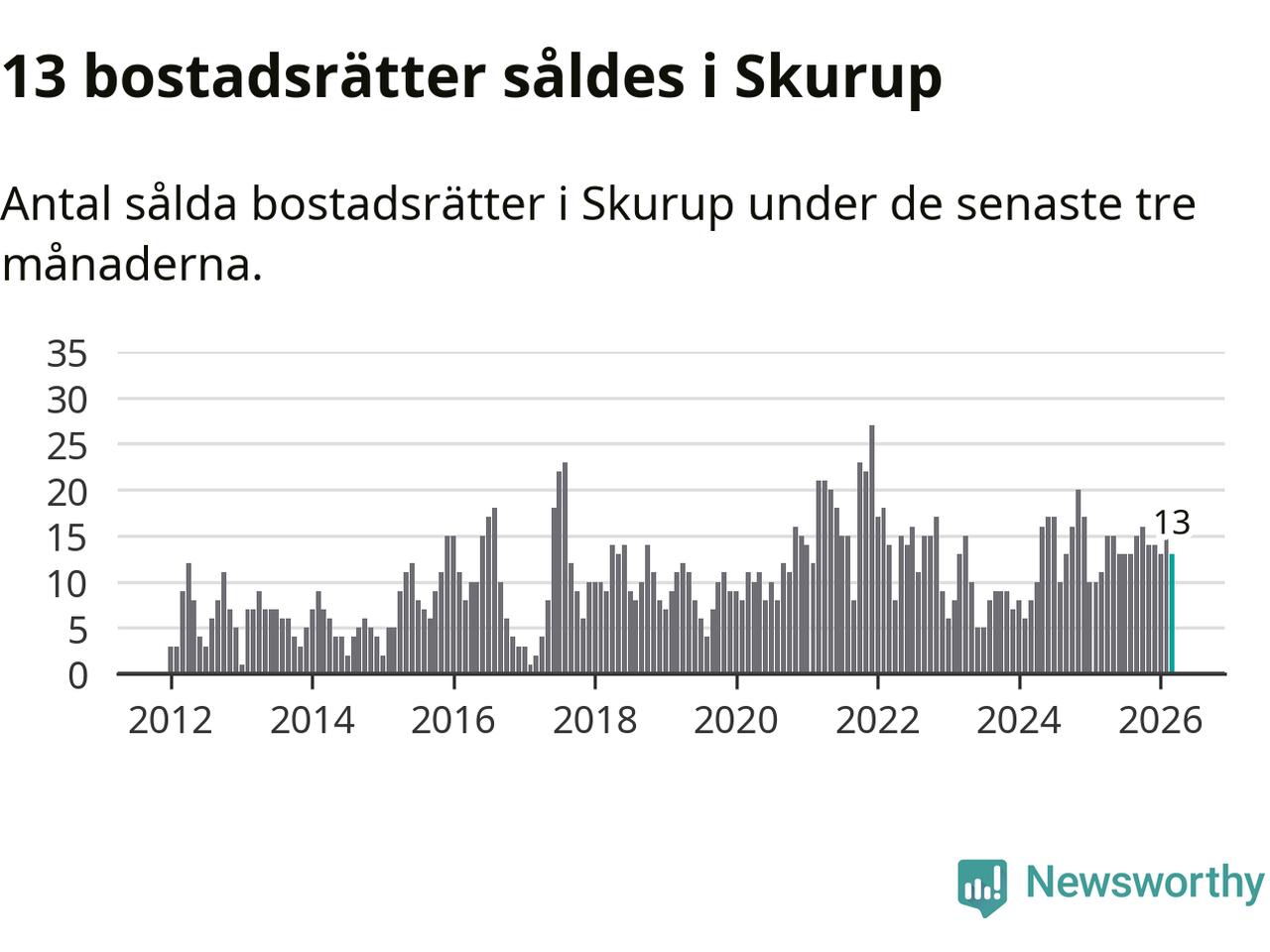 Mellan januari och mars gjordes sammanlagt 13 affärer med bostadsrätter i Skurups kommun. Det kan jämföras med elva vid motsvarande tid i fjol.