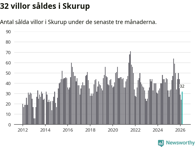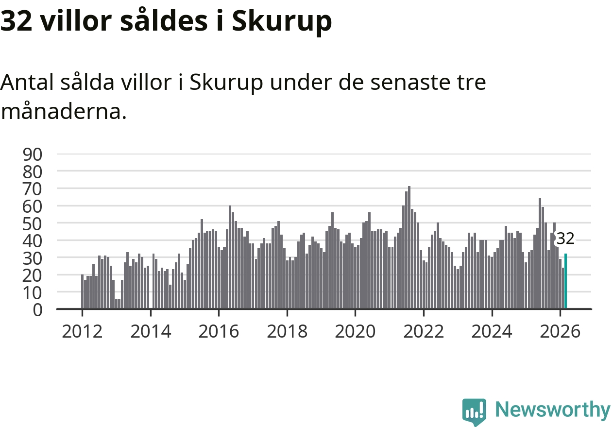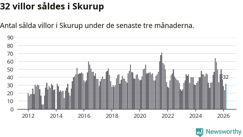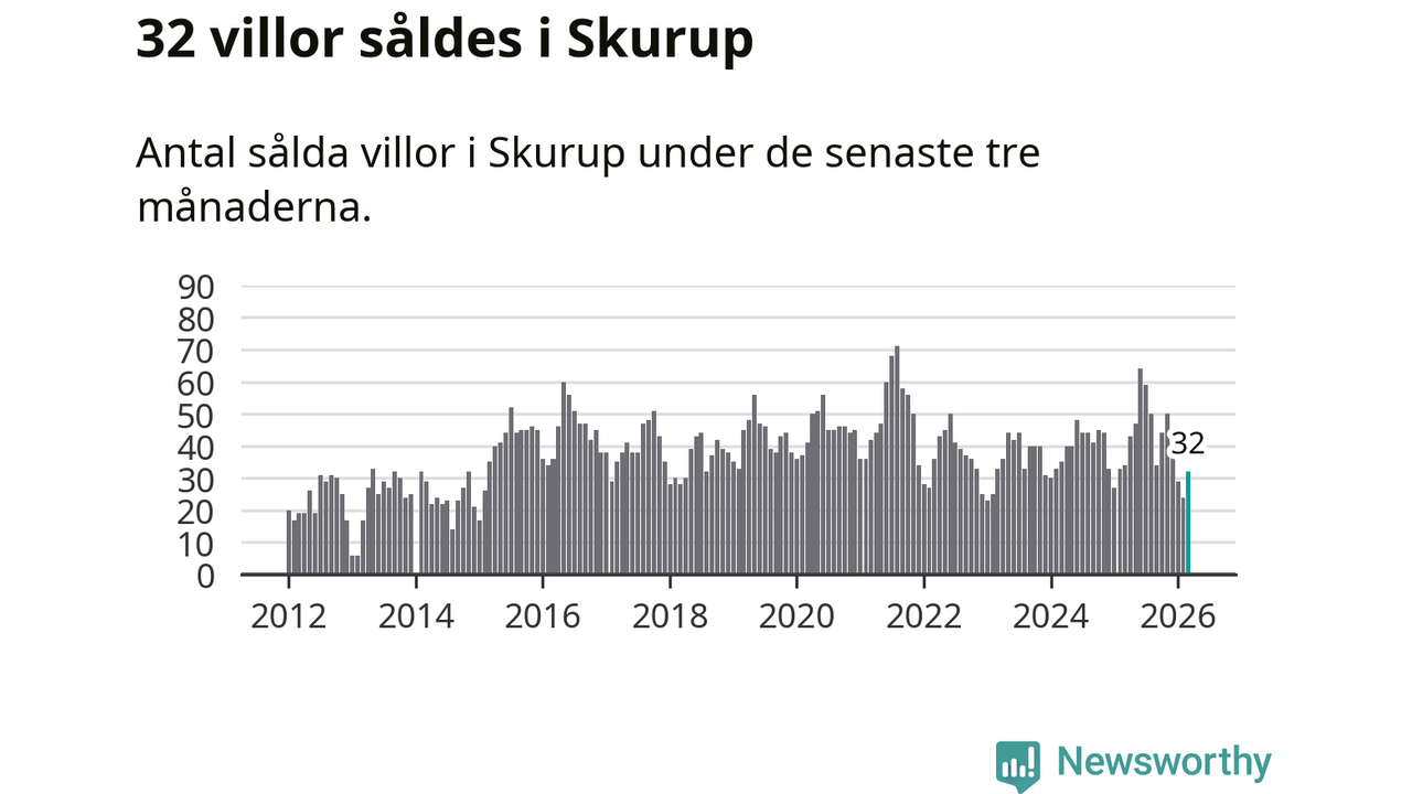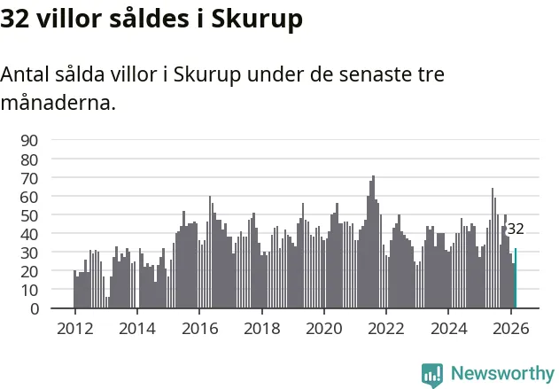 Sammanlagt såldes 32 villor i Skurups kommun mellan januari och mars till ett genomsnittligt pris på 3,1 miljoner kronor. I fjol gjordes 34 affärer vid den här tiden på året.