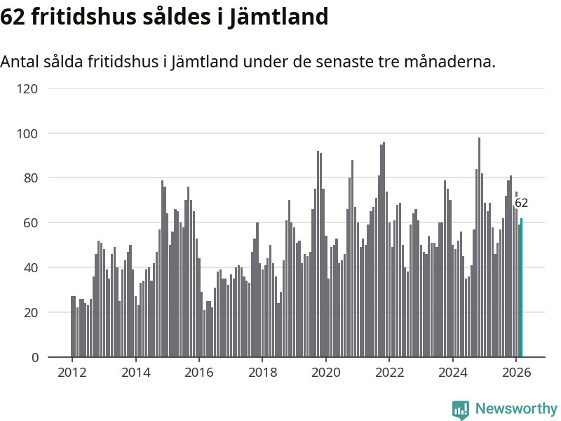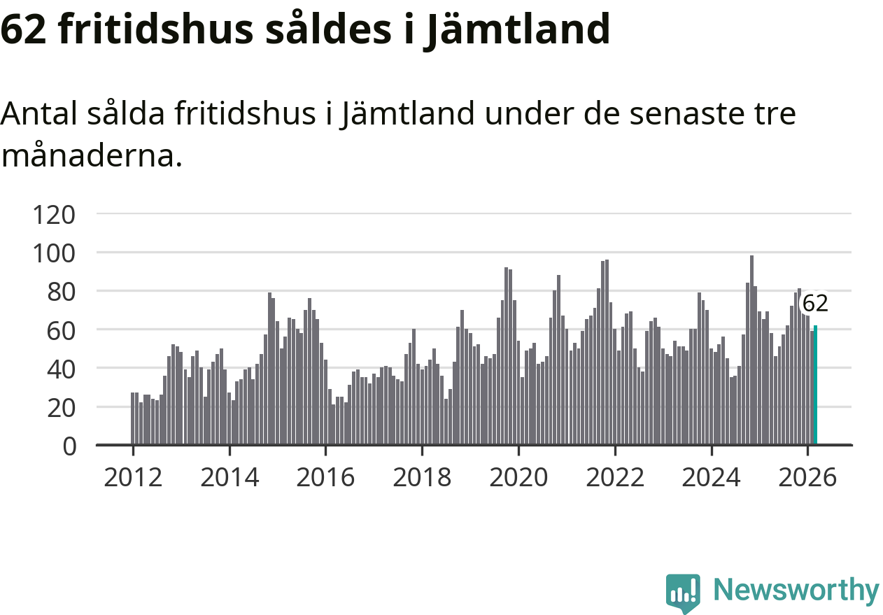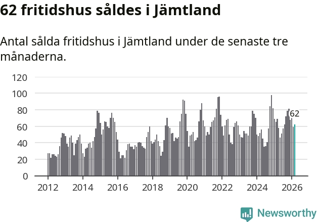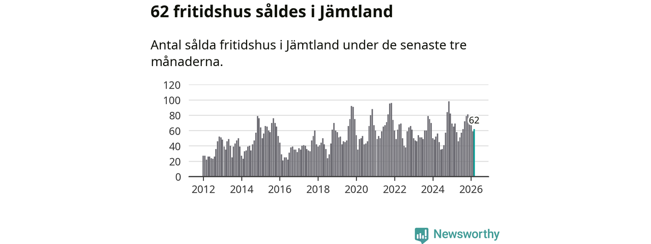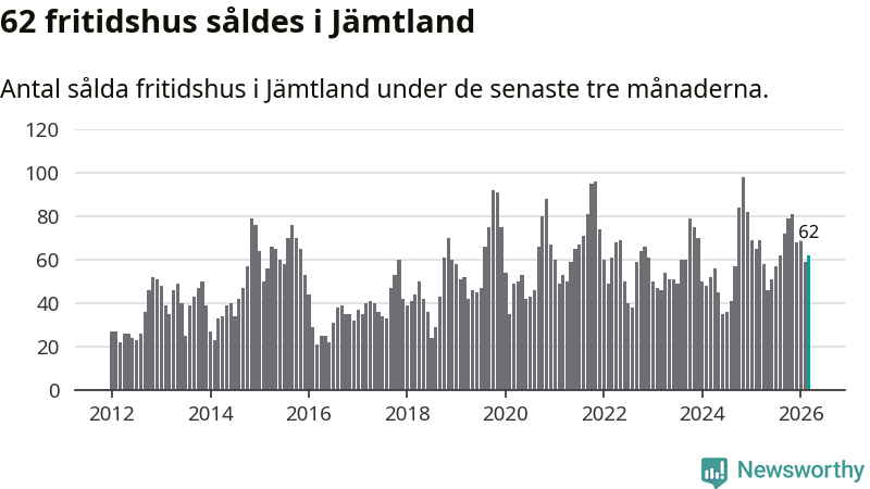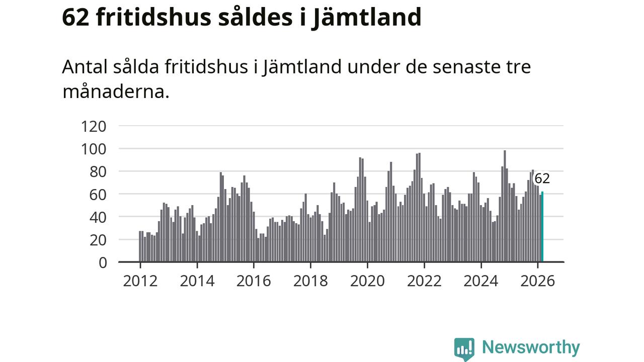 Sammanlagt såldes 62 fritidshus i Jämtlands län mellan januari och mars till ett genomsnittligt pris på 3,0 miljoner kronor. I fjol gjordes 69 affärer vid den här tiden på året.
