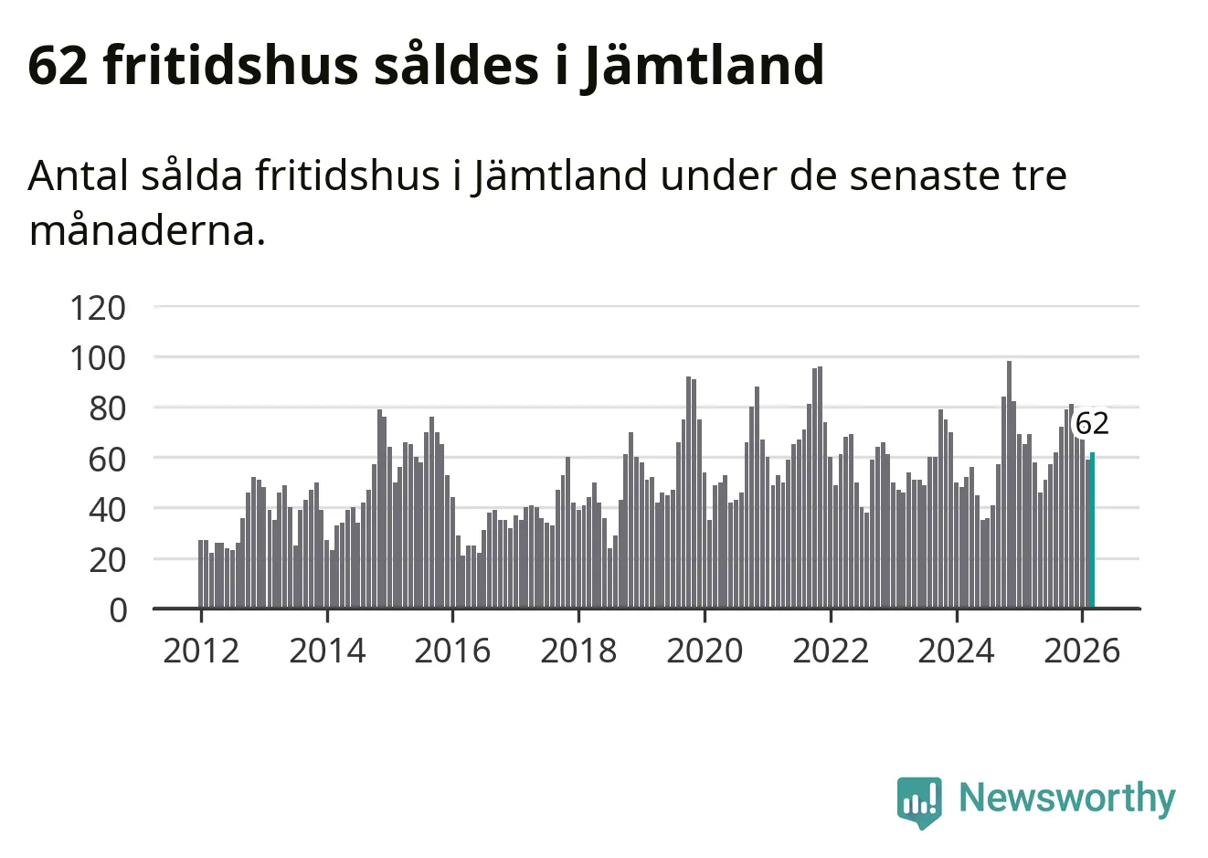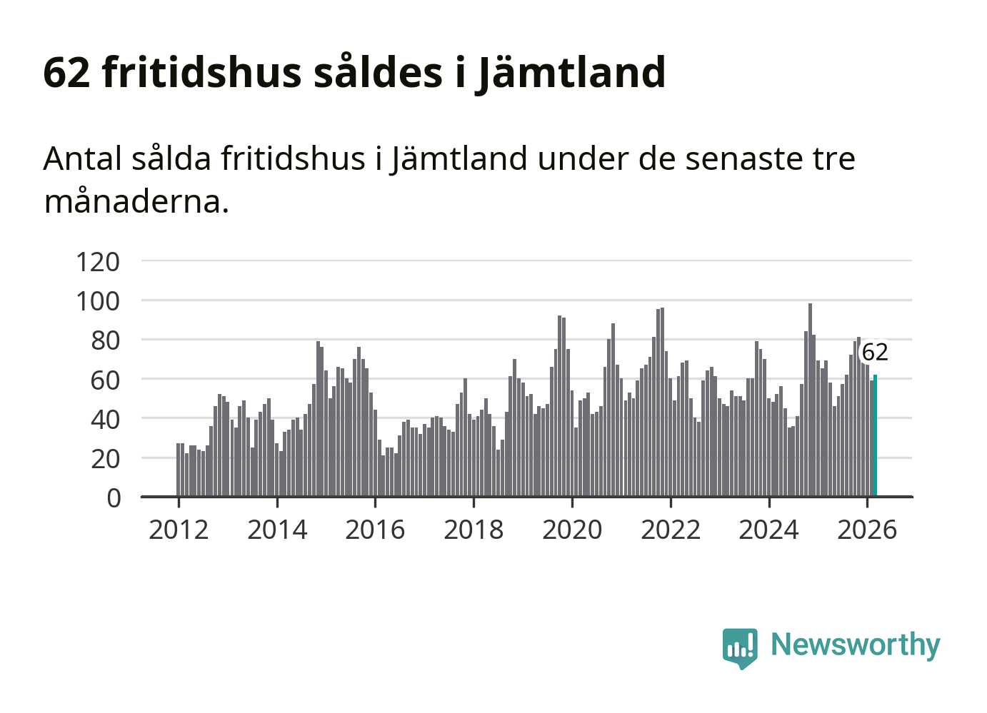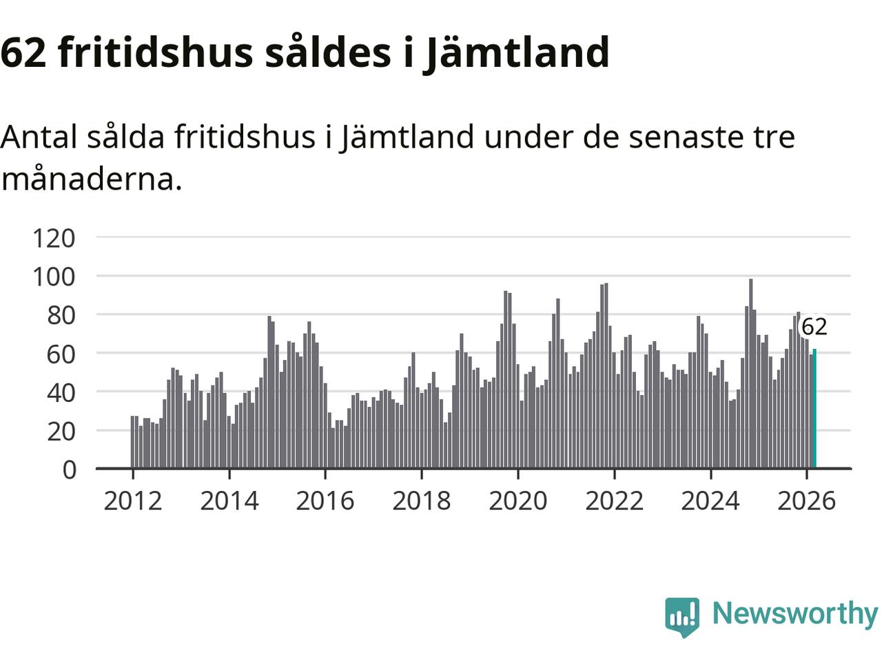 Sammanlagt såldes 62 fritidshus i Jämtlands län mellan januari och mars till ett genomsnittligt pris på 3,0 miljoner kronor. I fjol gjordes 69 affärer vid den här tiden på året.