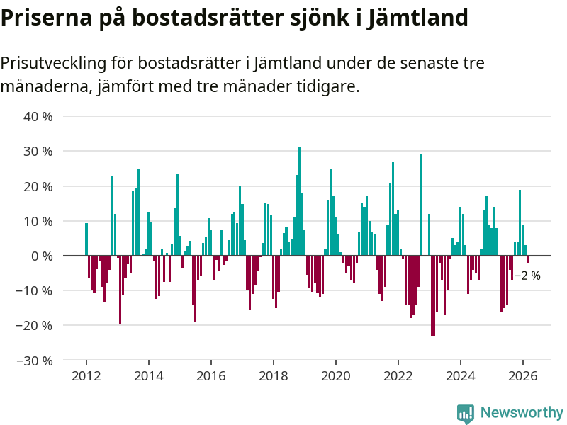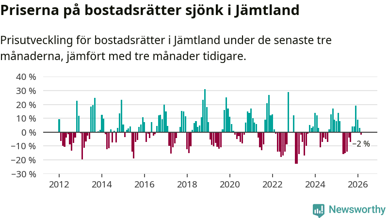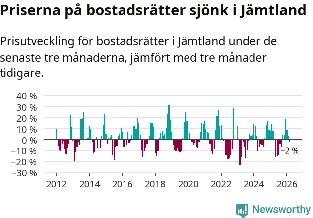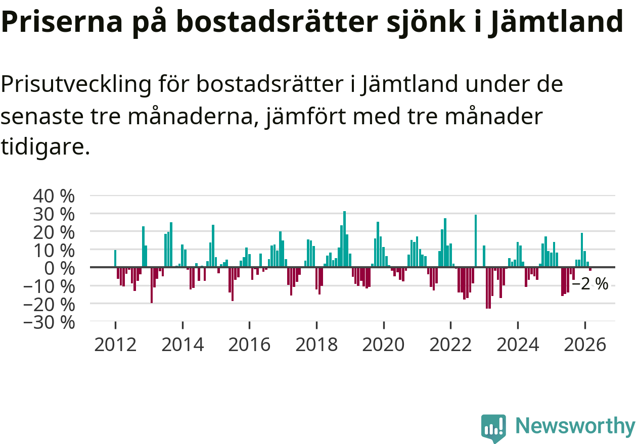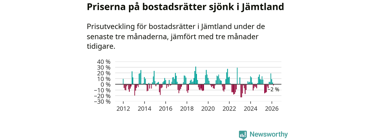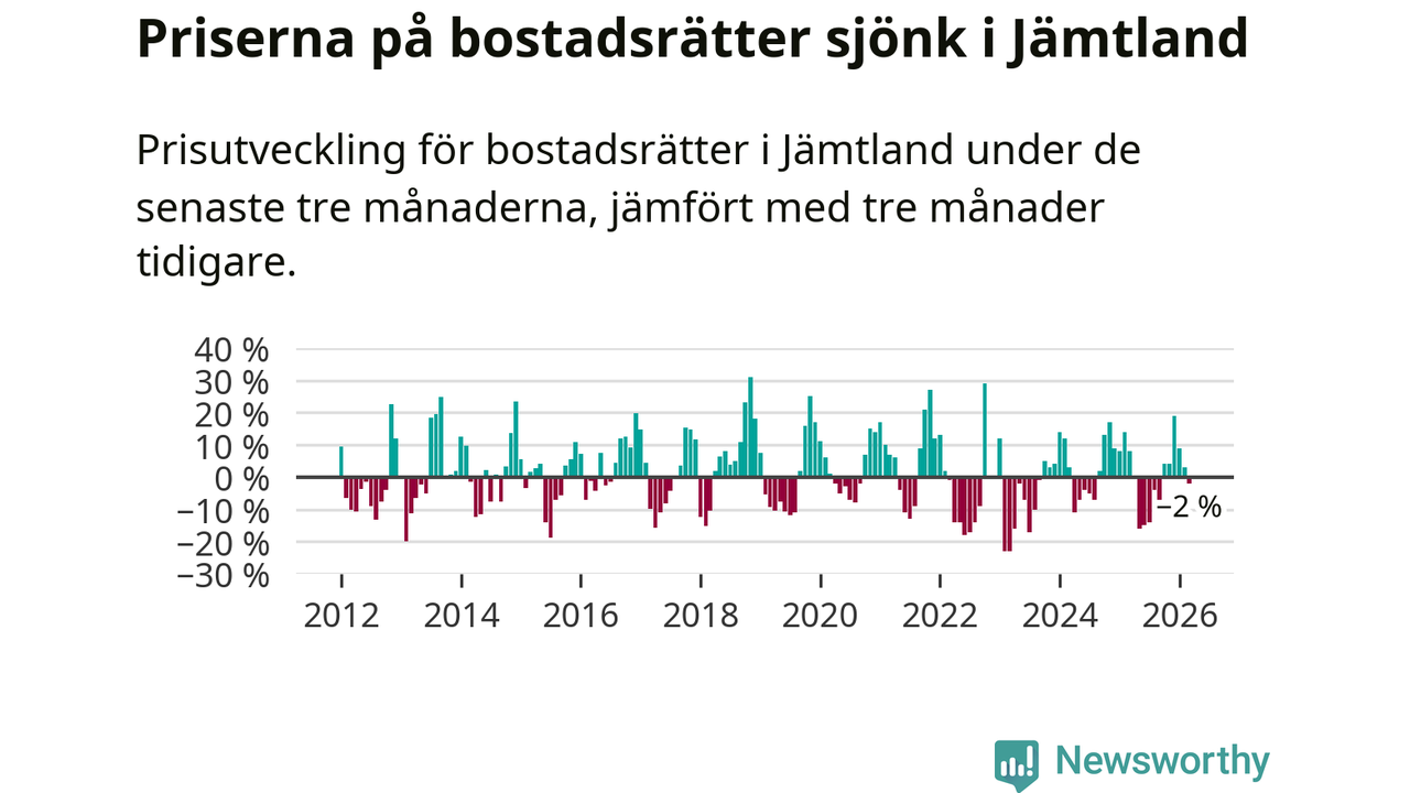 Priserna på bostadsrätter har gått ner i Jämtlands län. Medelpriset på försäljningarna under de senaste tre månaderna visar på en nedgång med 2 procent.