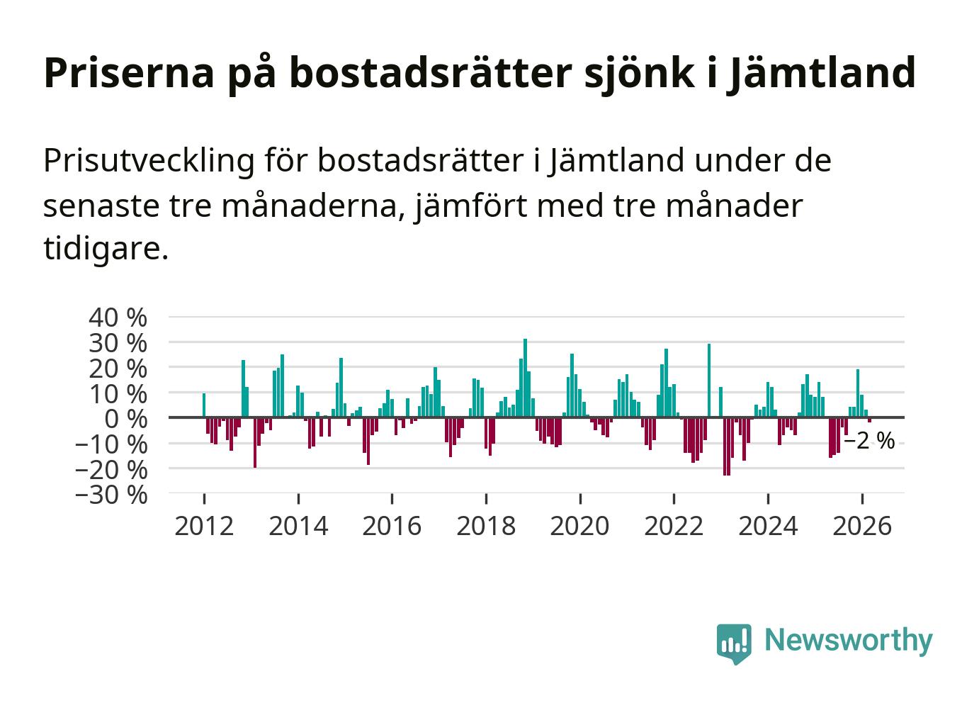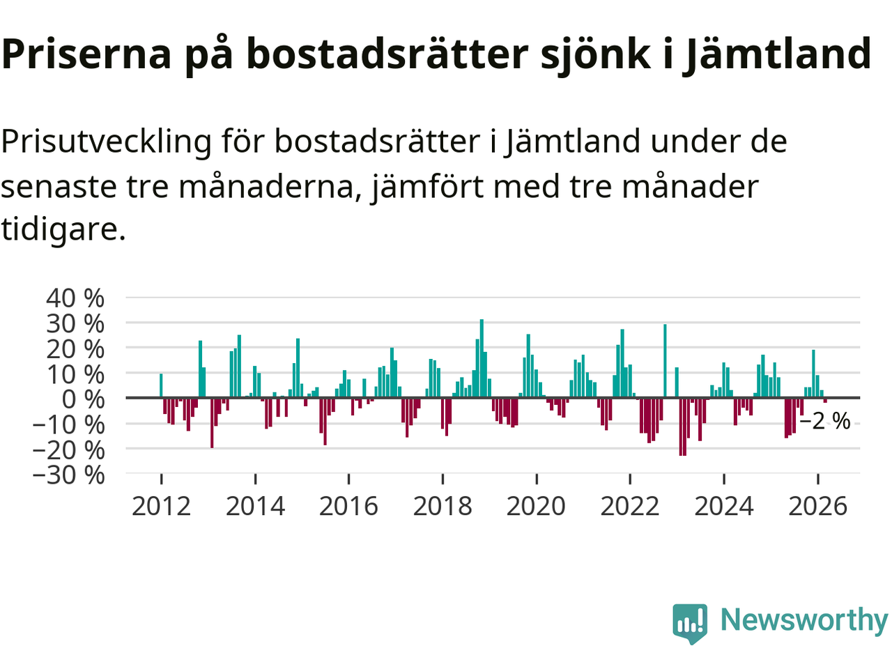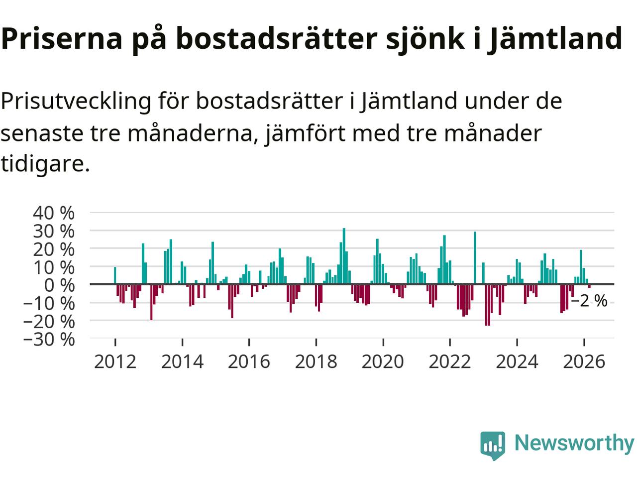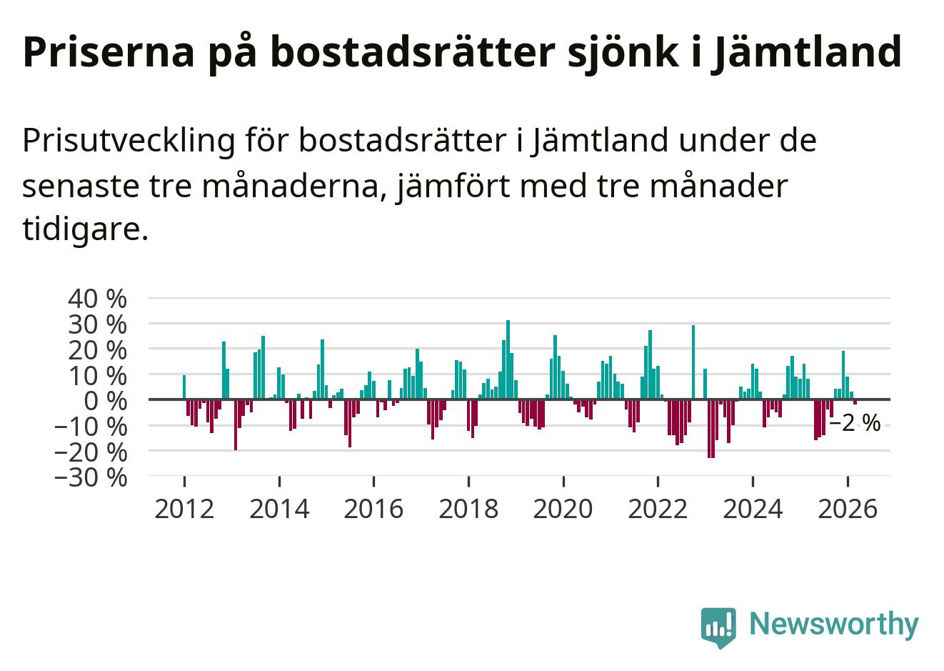 Priserna på bostadsrätter har gått ner i Jämtlands län. Medelpriset på försäljningarna under de senaste tre månaderna visar på en nedgång med 2 procent.