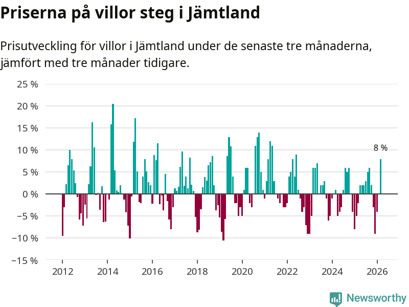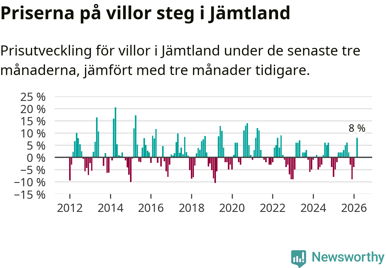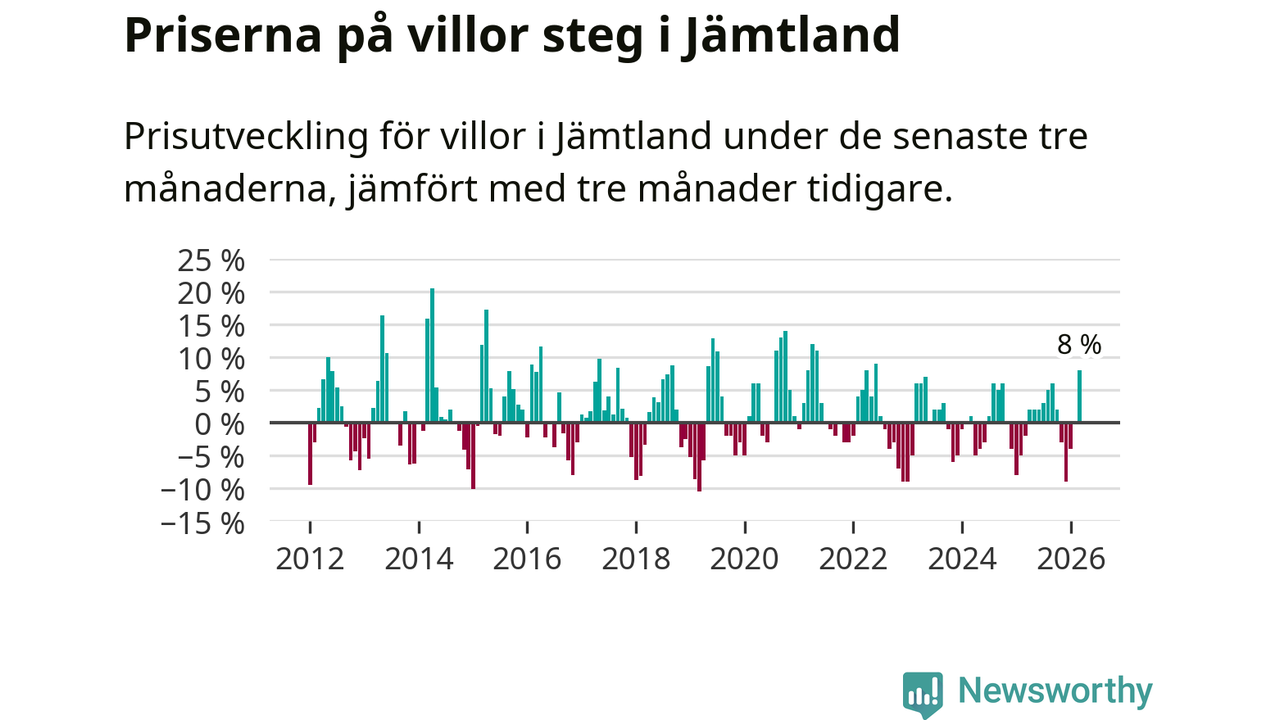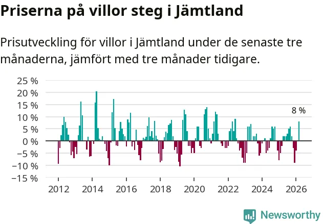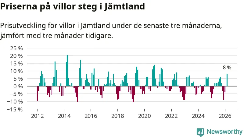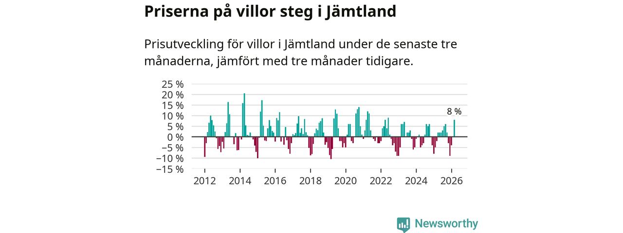 Villapriserna steg med åtta procent i Jämtlands län under de senaste tre månaderna. Det är den starkaste prisutvecklingen sedan 2022.