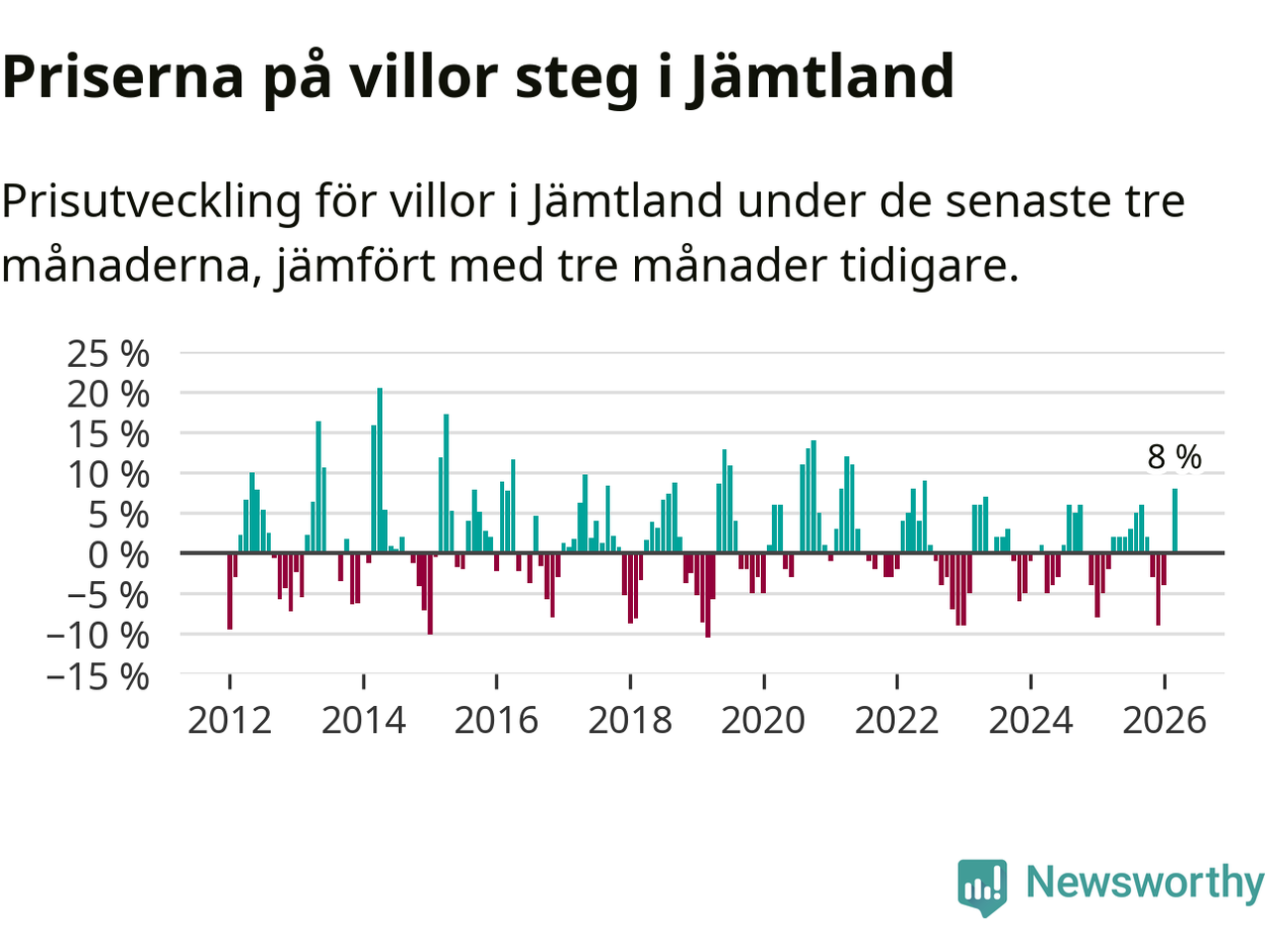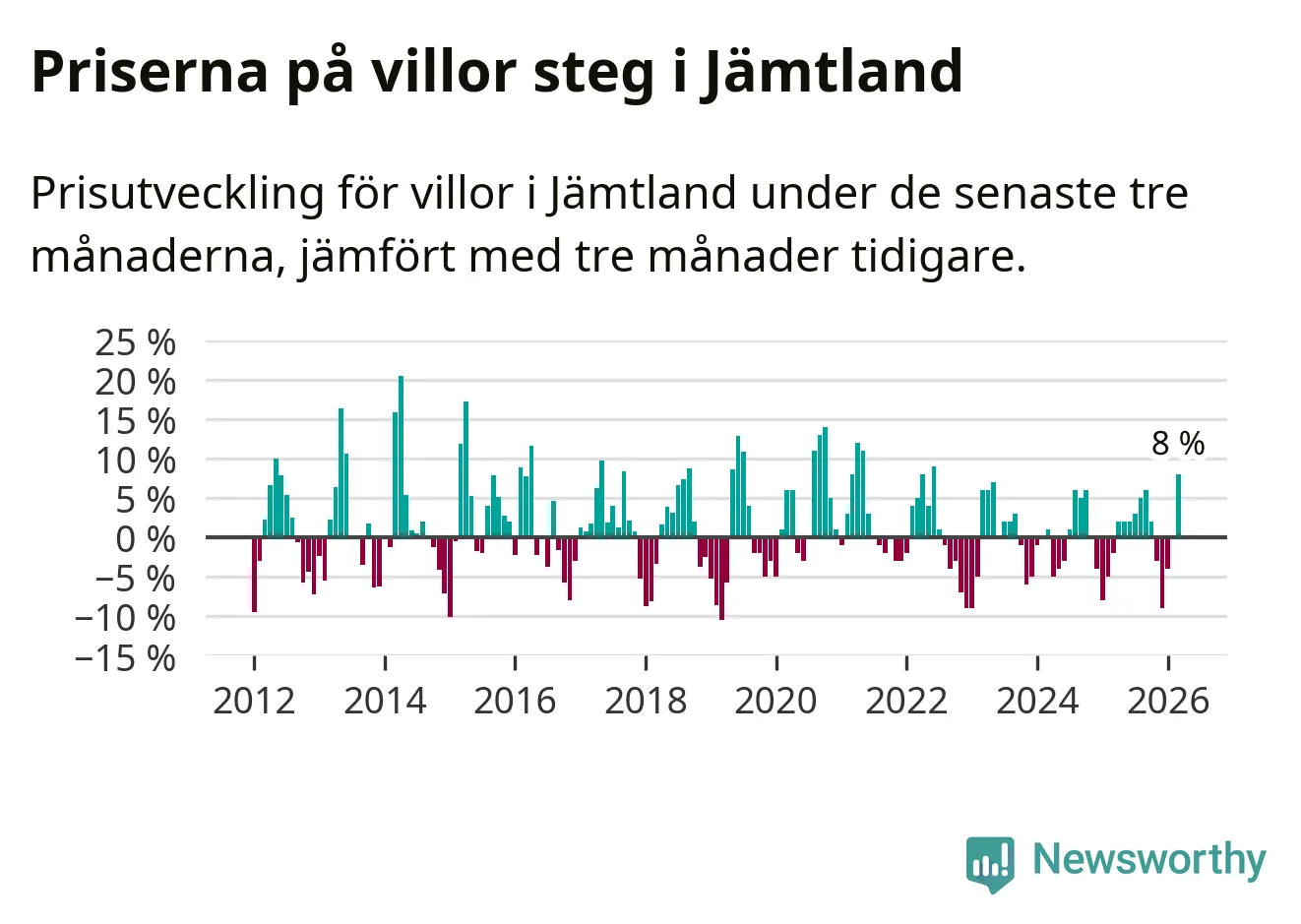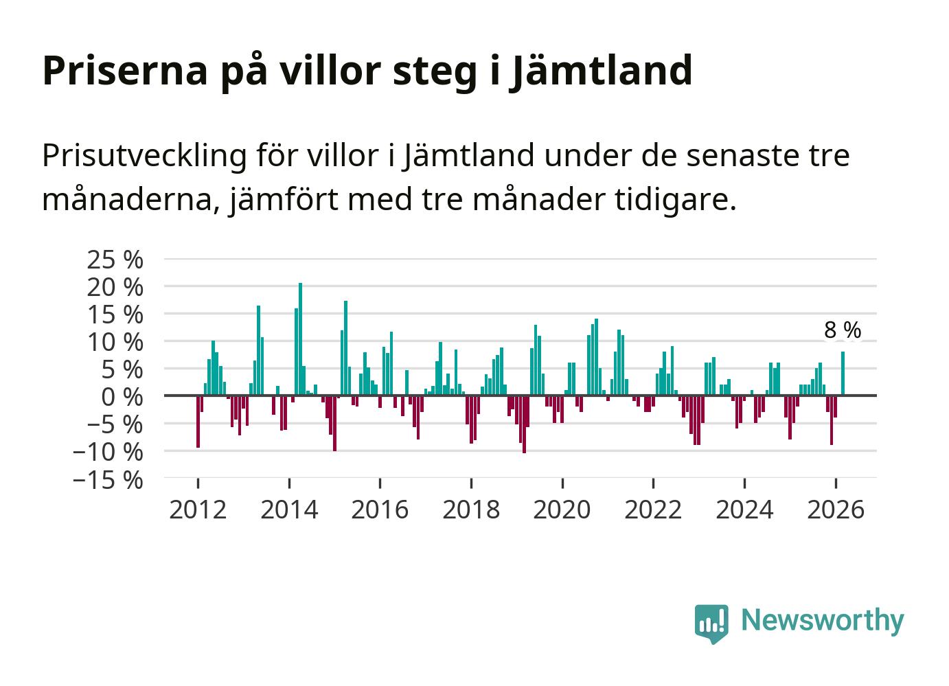 Villapriserna steg med åtta procent i Jämtlands län under de senaste tre månaderna. Det är den starkaste prisutvecklingen sedan 2022.