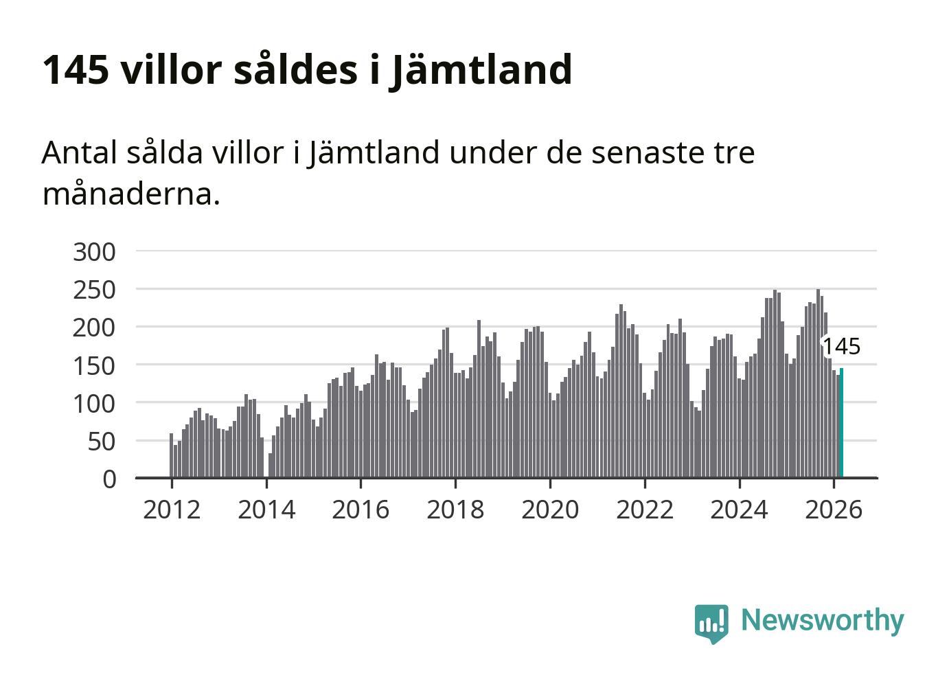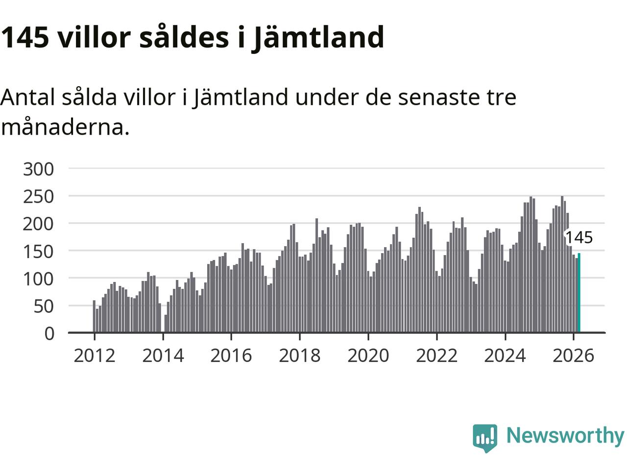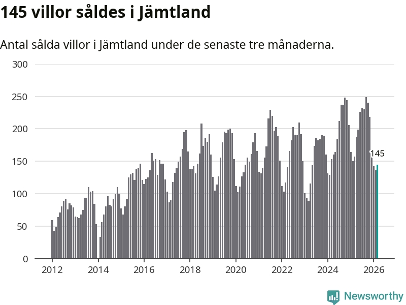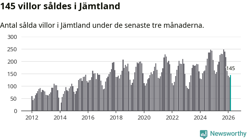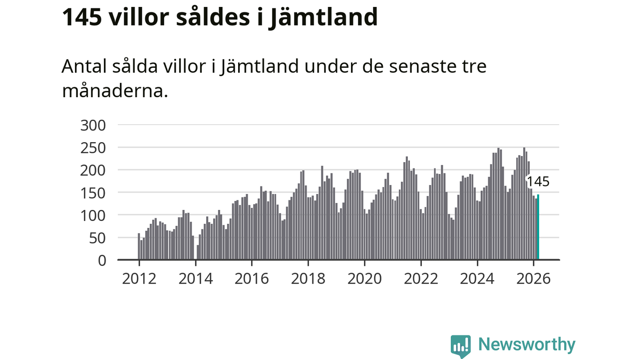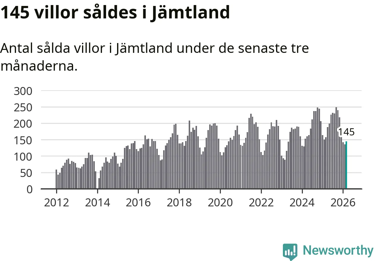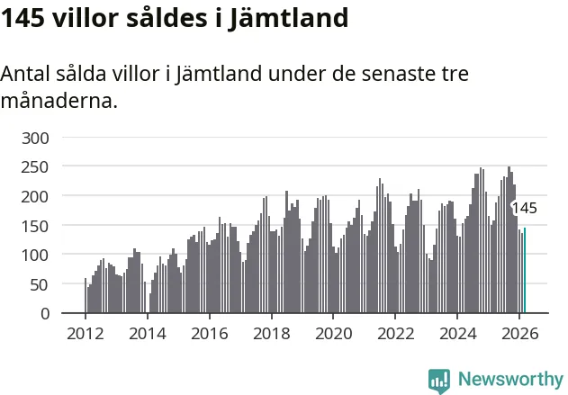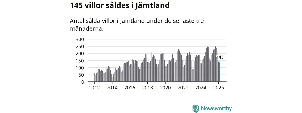 Sammanlagt såldes 145 villor i Jämtlands län mellan januari och mars till ett genomsnittligt pris på 3,4 miljoner kronor. I fjol gjordes 157 affärer vid den här tiden på året.