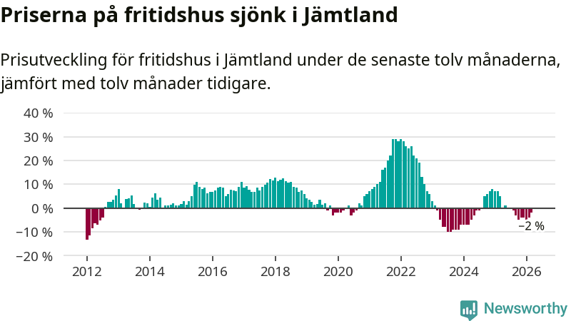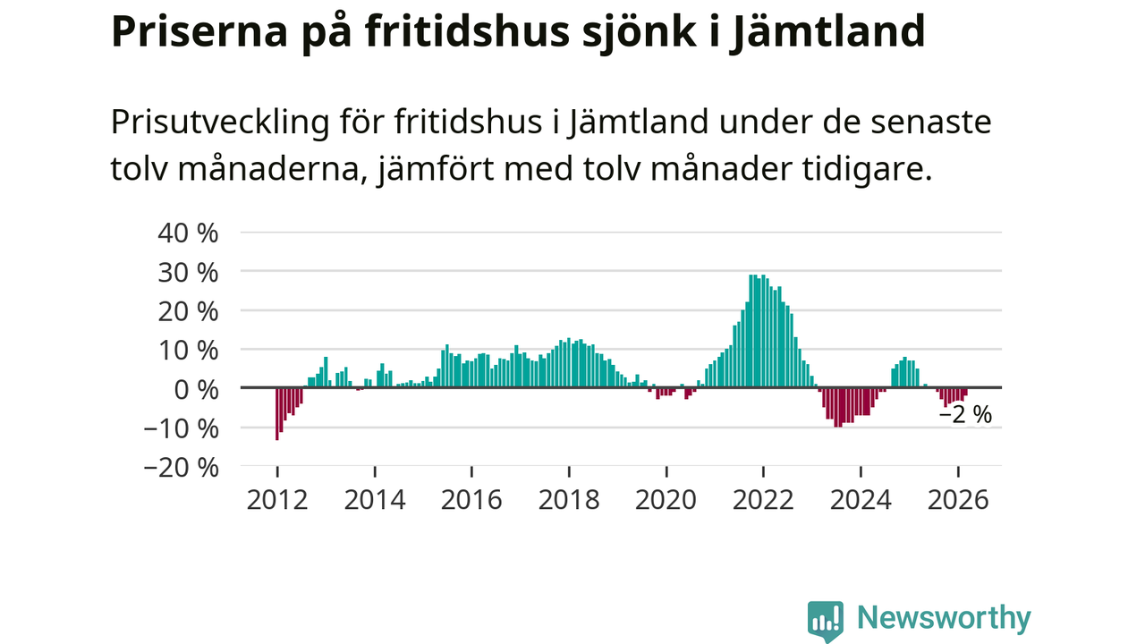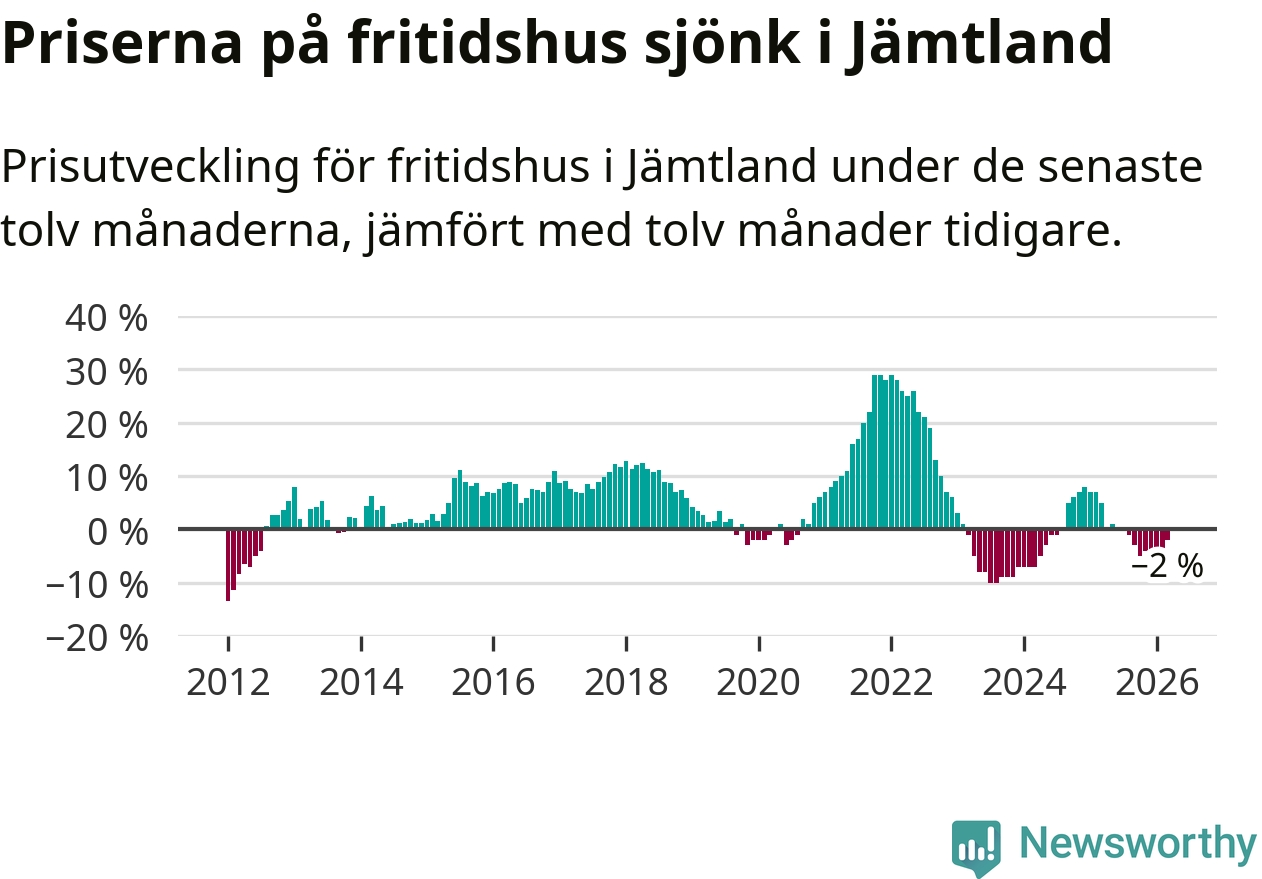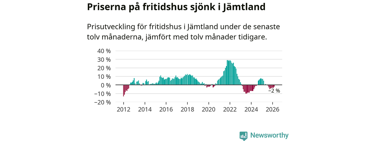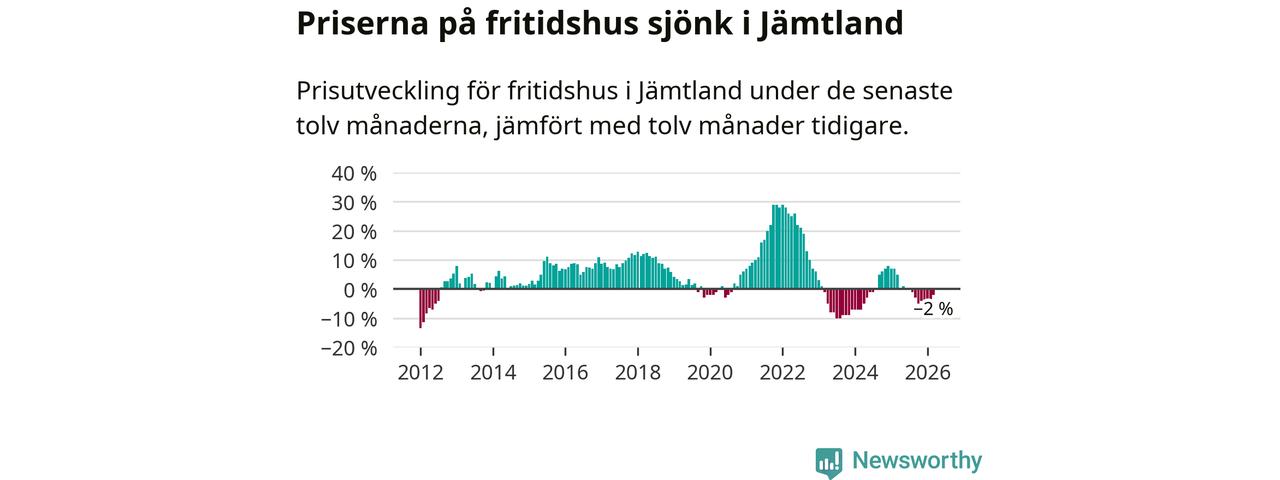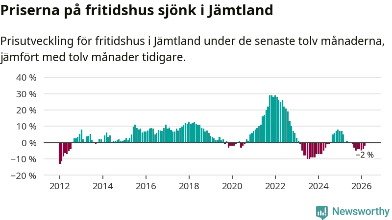 Priserna på fritidshus har gått ner i Jämtlands län. Medelpriset på försäljningarna under de senaste tolv månaderna visar på en nedgång med 2 procent.