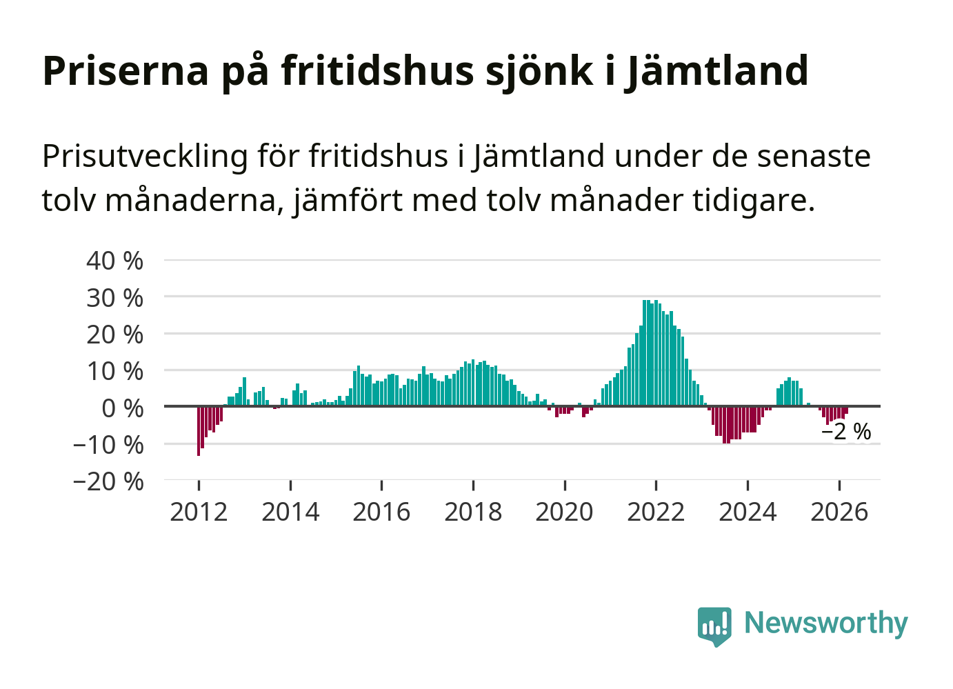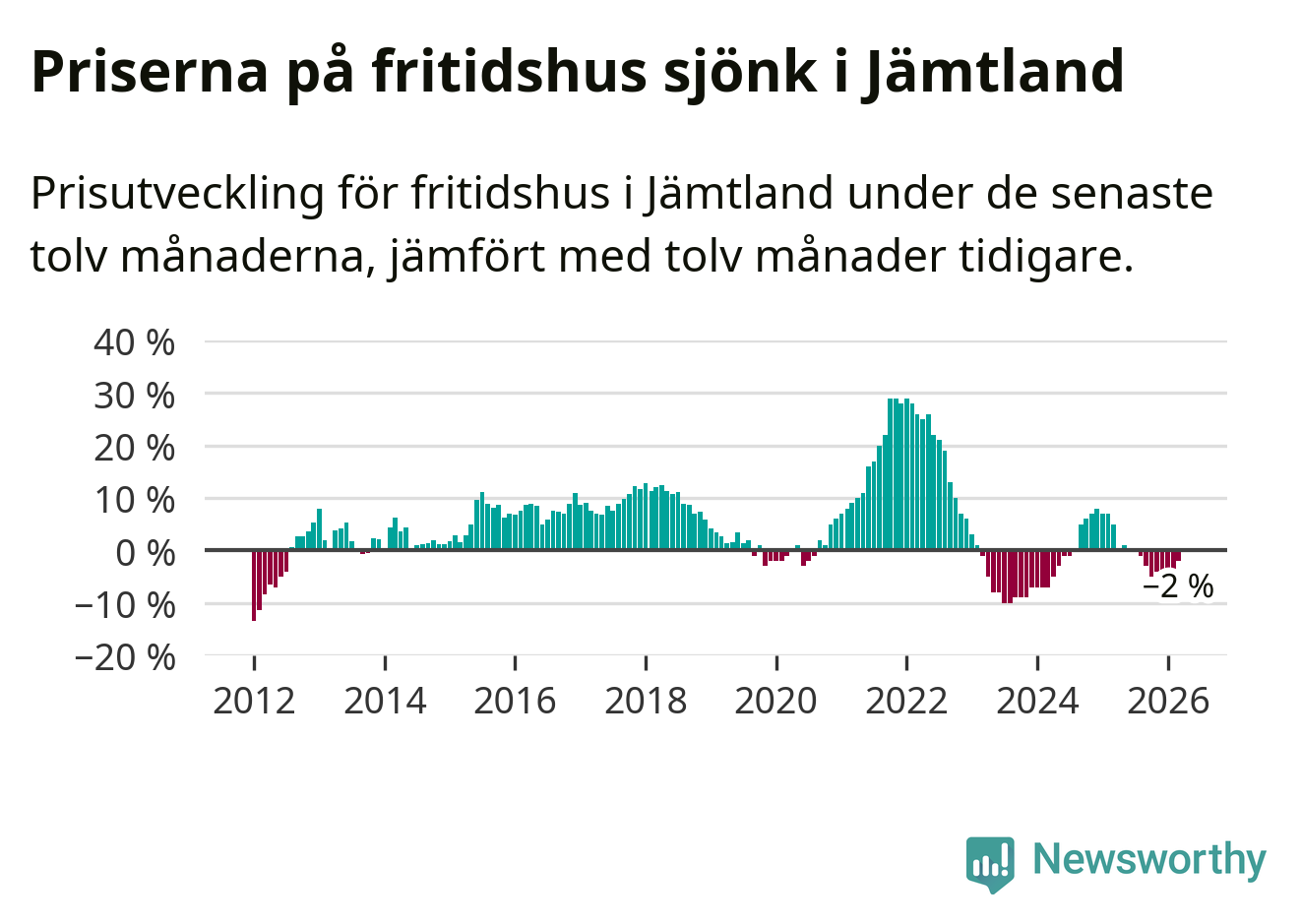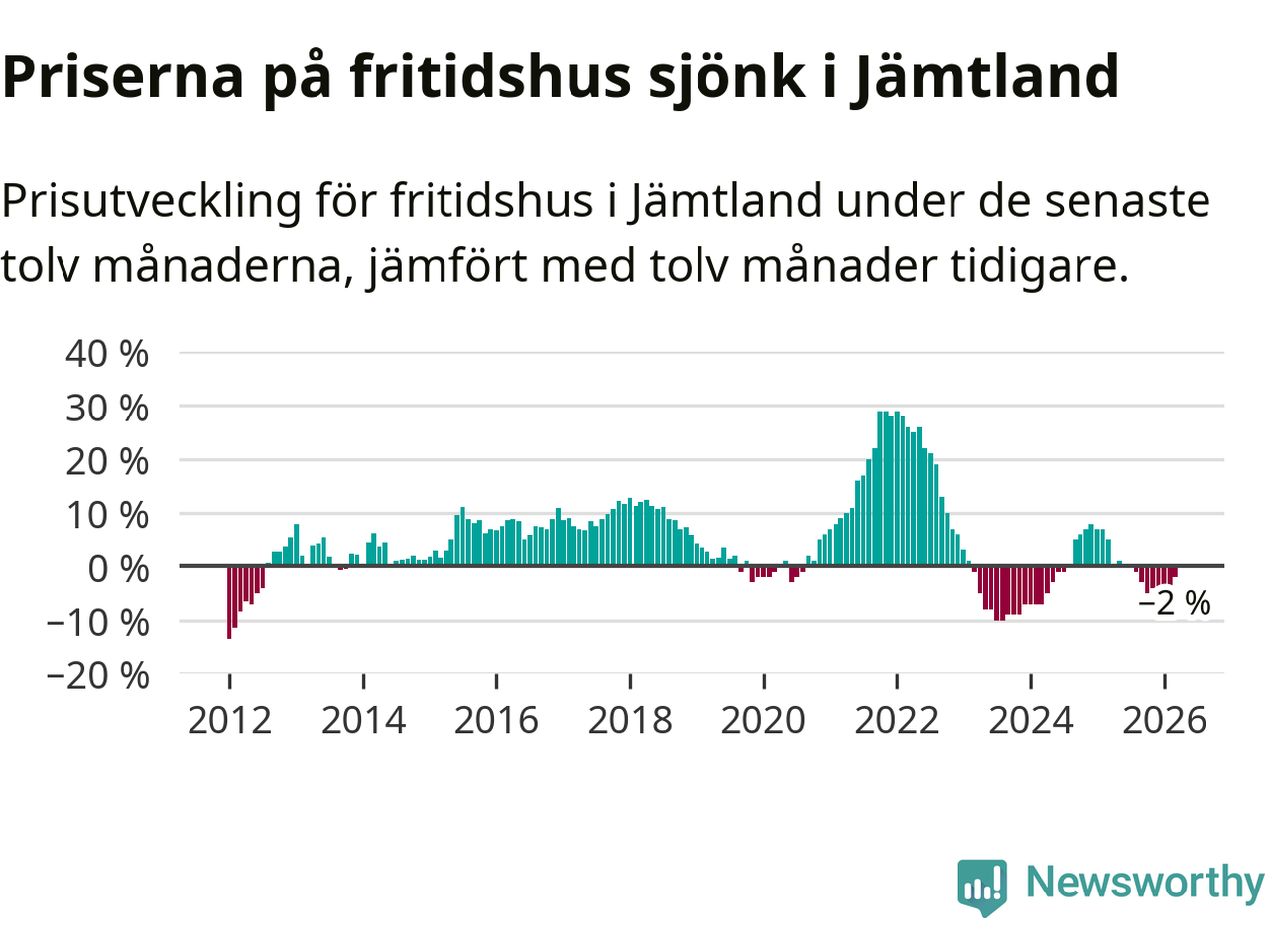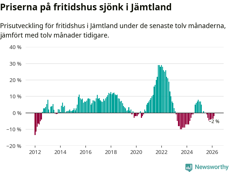 Priserna på fritidshus har gått ner i Jämtlands län. Medelpriset på försäljningarna under de senaste tolv månaderna visar på en nedgång med 2 procent.