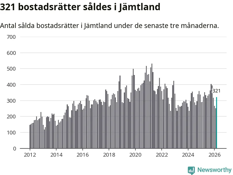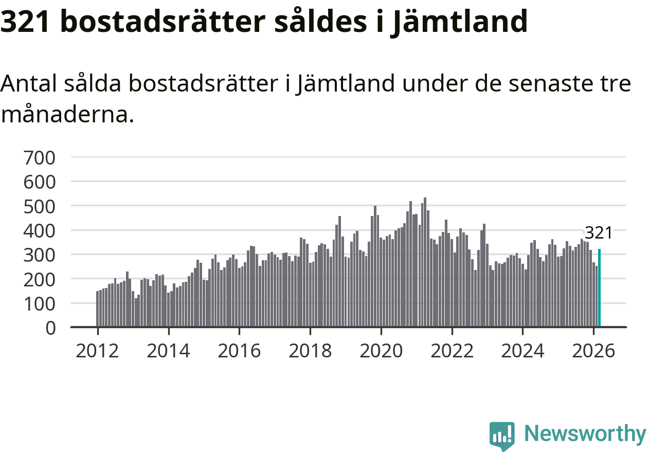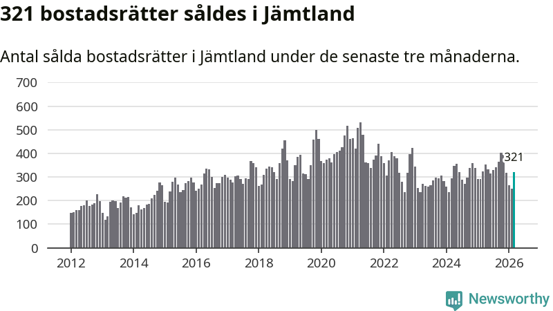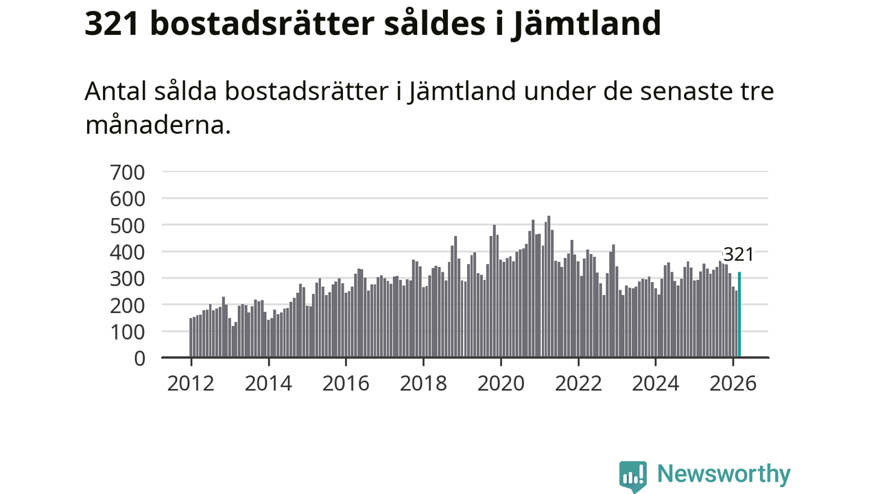 Sammanlagt såldes 321 bostadsrätter i Jämtlands län mellan januari och mars till ett genomsnittligt pris på 2,3 miljoner kronor. I fjol gjordes 324 affärer vid den här tiden på året.