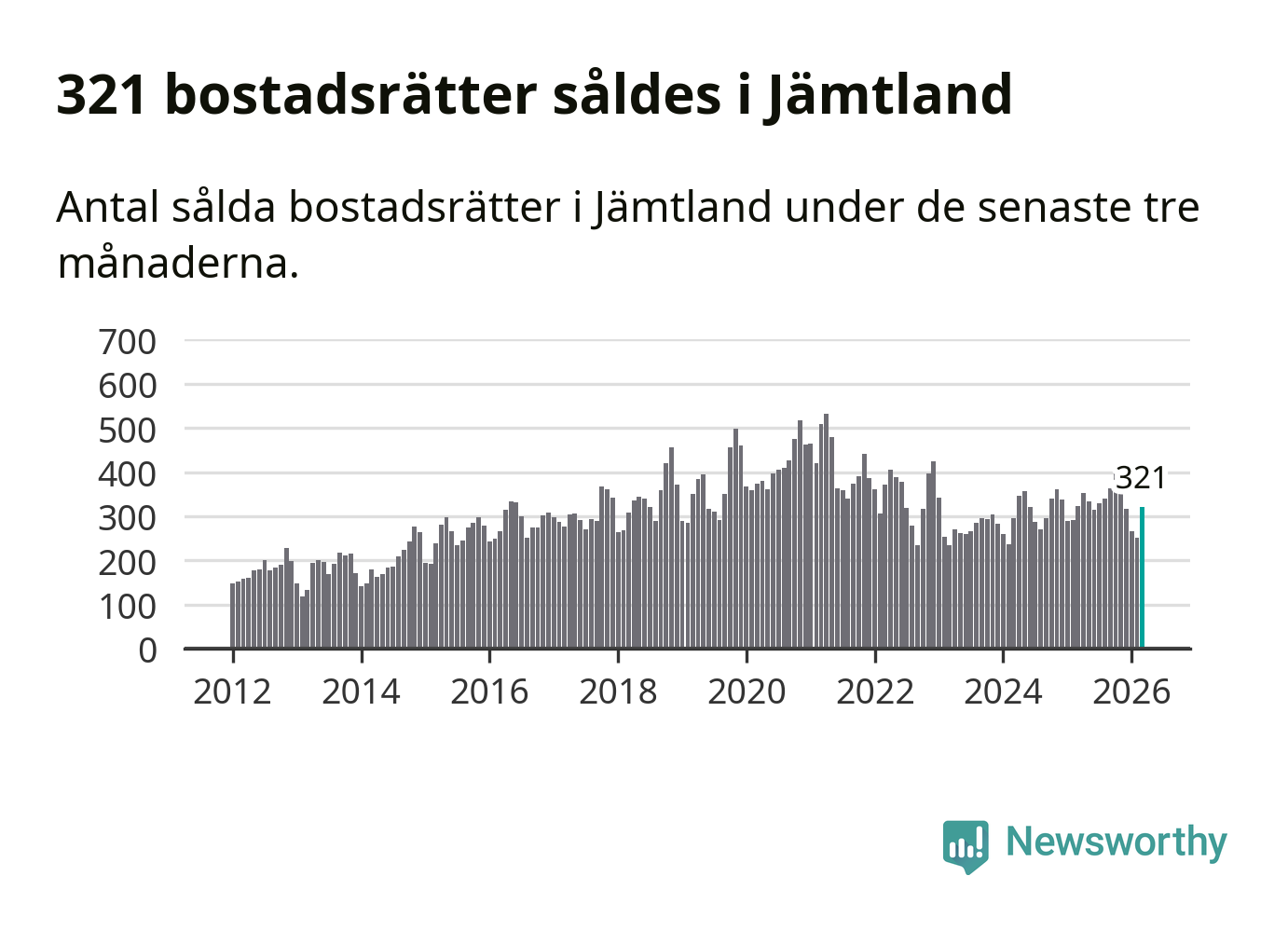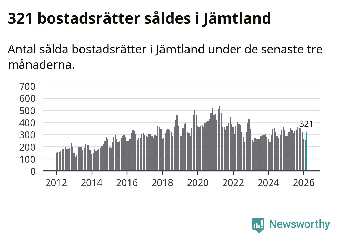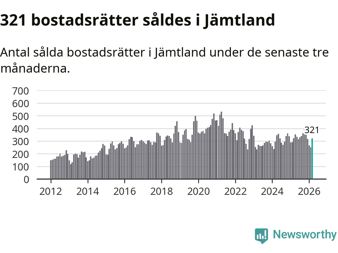 Sammanlagt såldes 321 bostadsrätter i Jämtlands län mellan januari och mars till ett genomsnittligt pris på 2,3 miljoner kronor. I fjol gjordes 324 affärer vid den här tiden på året.