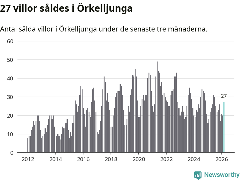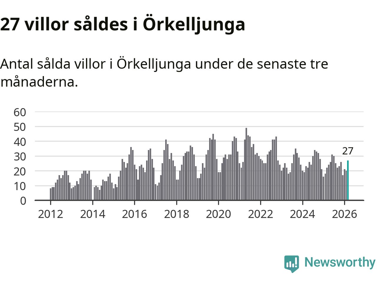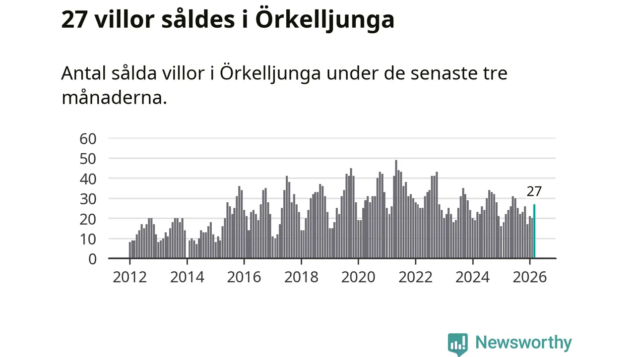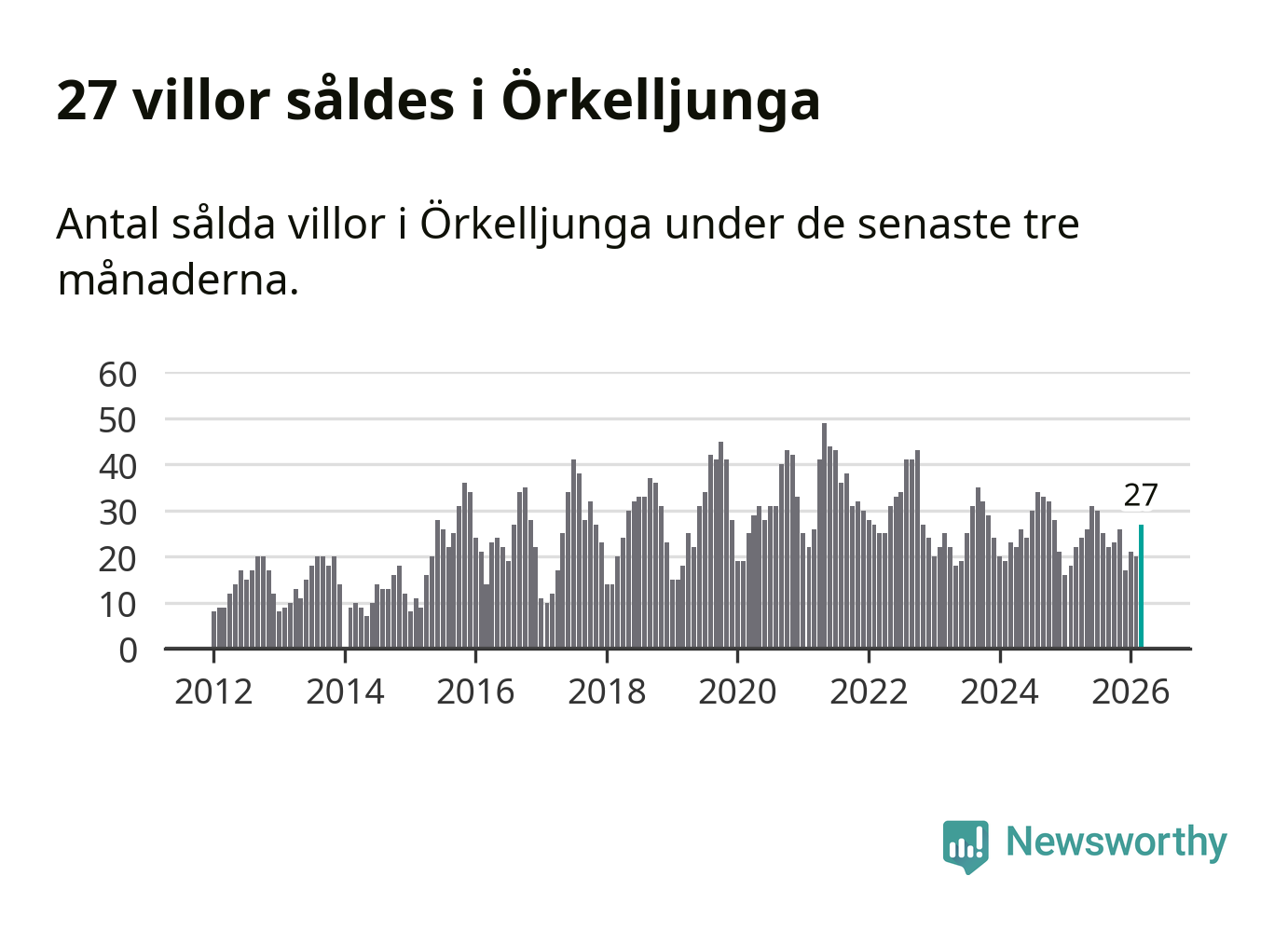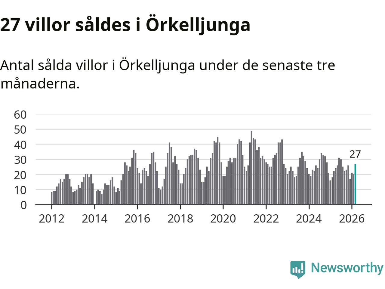 Mellan januari och mars såldes 27 villor i Örkelljunga kommun. Det är relativt många sett till aktiviteten på bostadsmarknaden i kommunen under de senaste tolv månaderna, samt det historiska snittet för den här tiden på året.