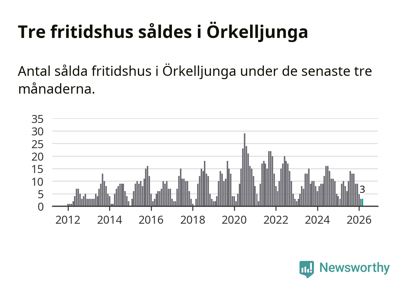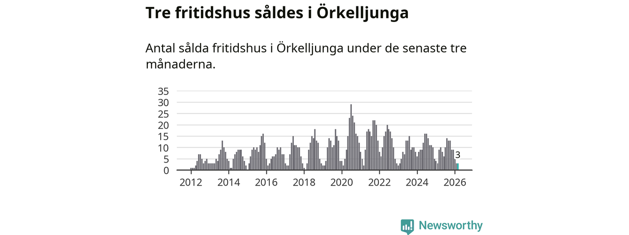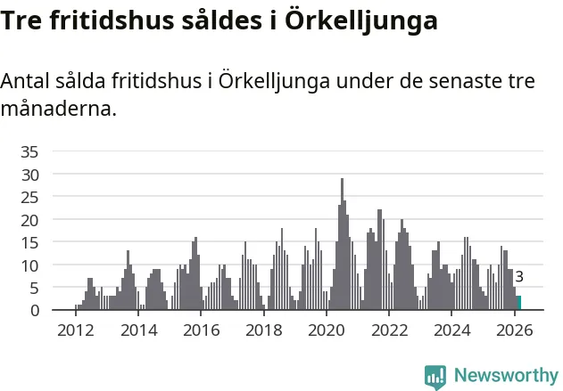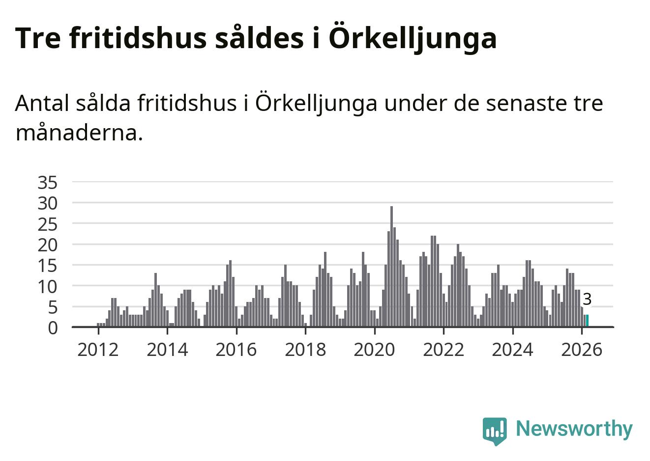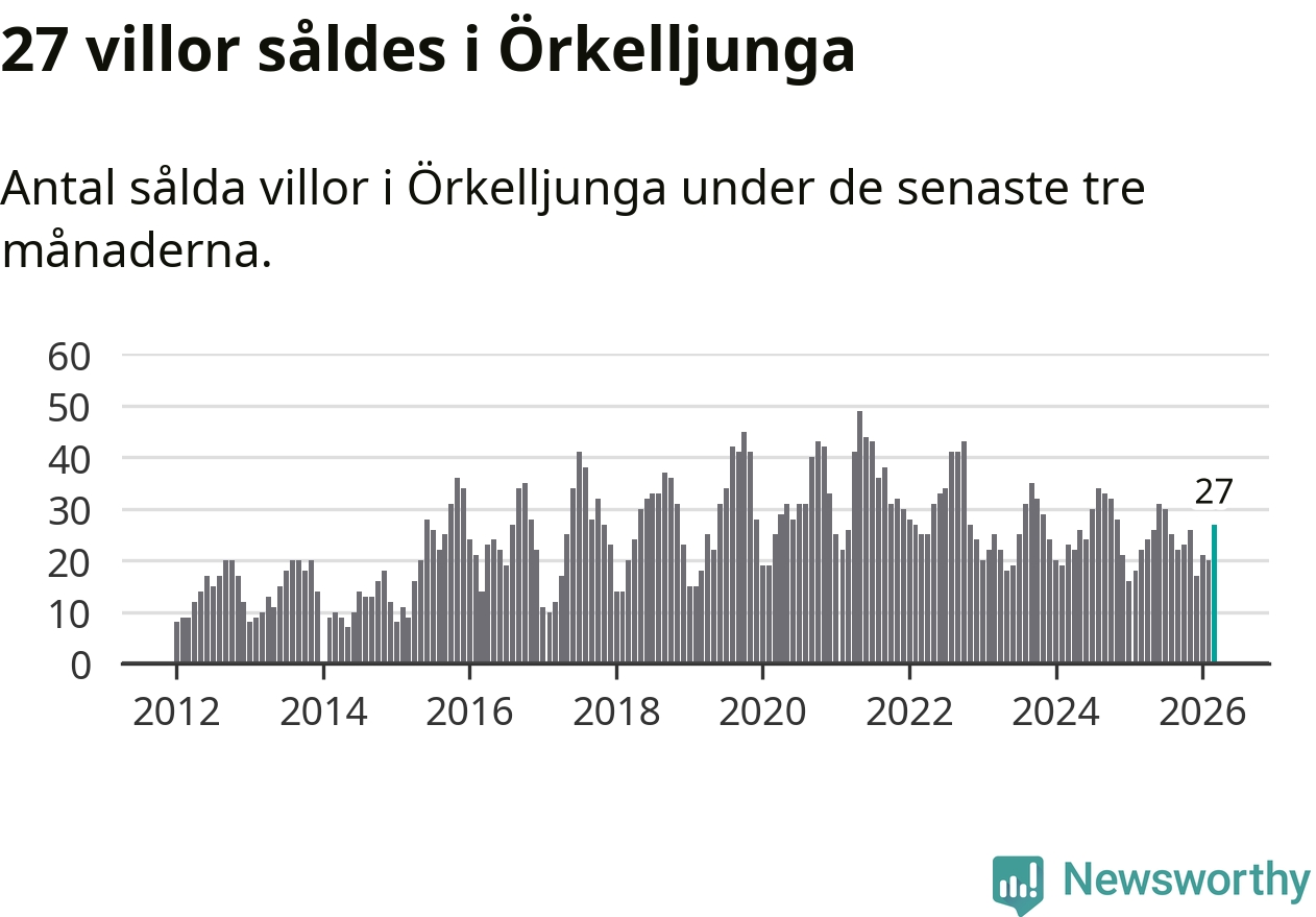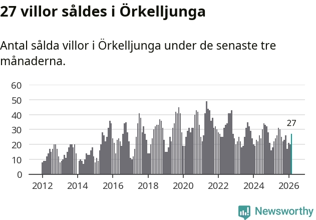 Mellan januari och mars såldes 27 villor i Örkelljunga kommun. Det är relativt många sett till aktiviteten på bostadsmarknaden i kommunen under de senaste tolv månaderna, samt det historiska snittet för den här tiden på året.